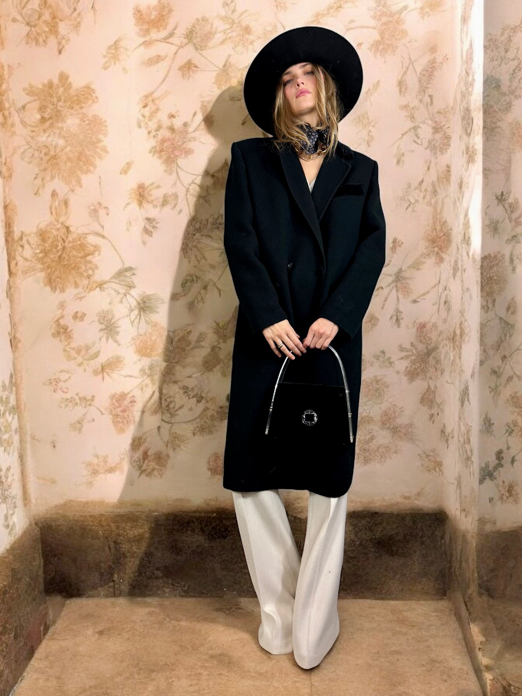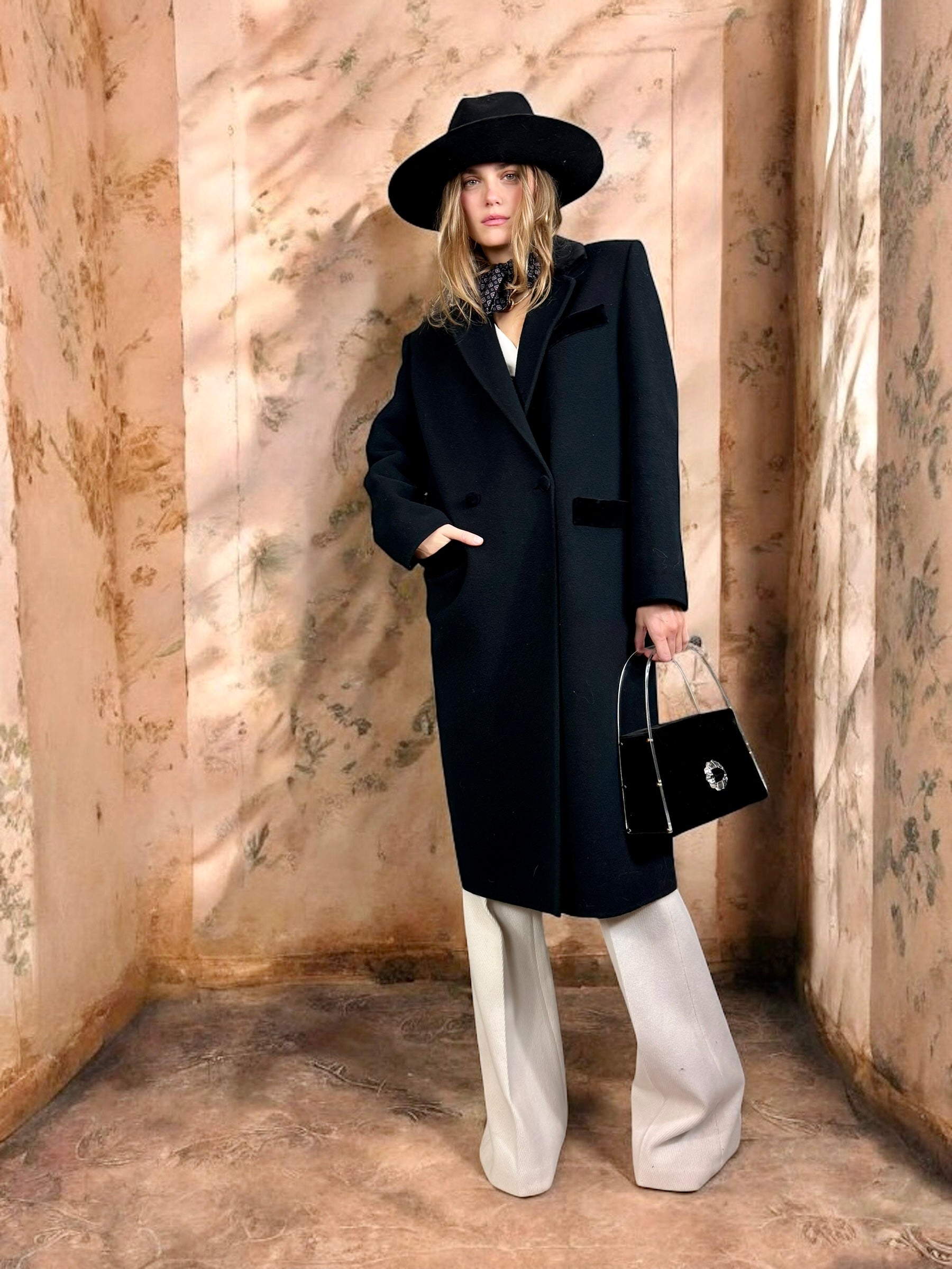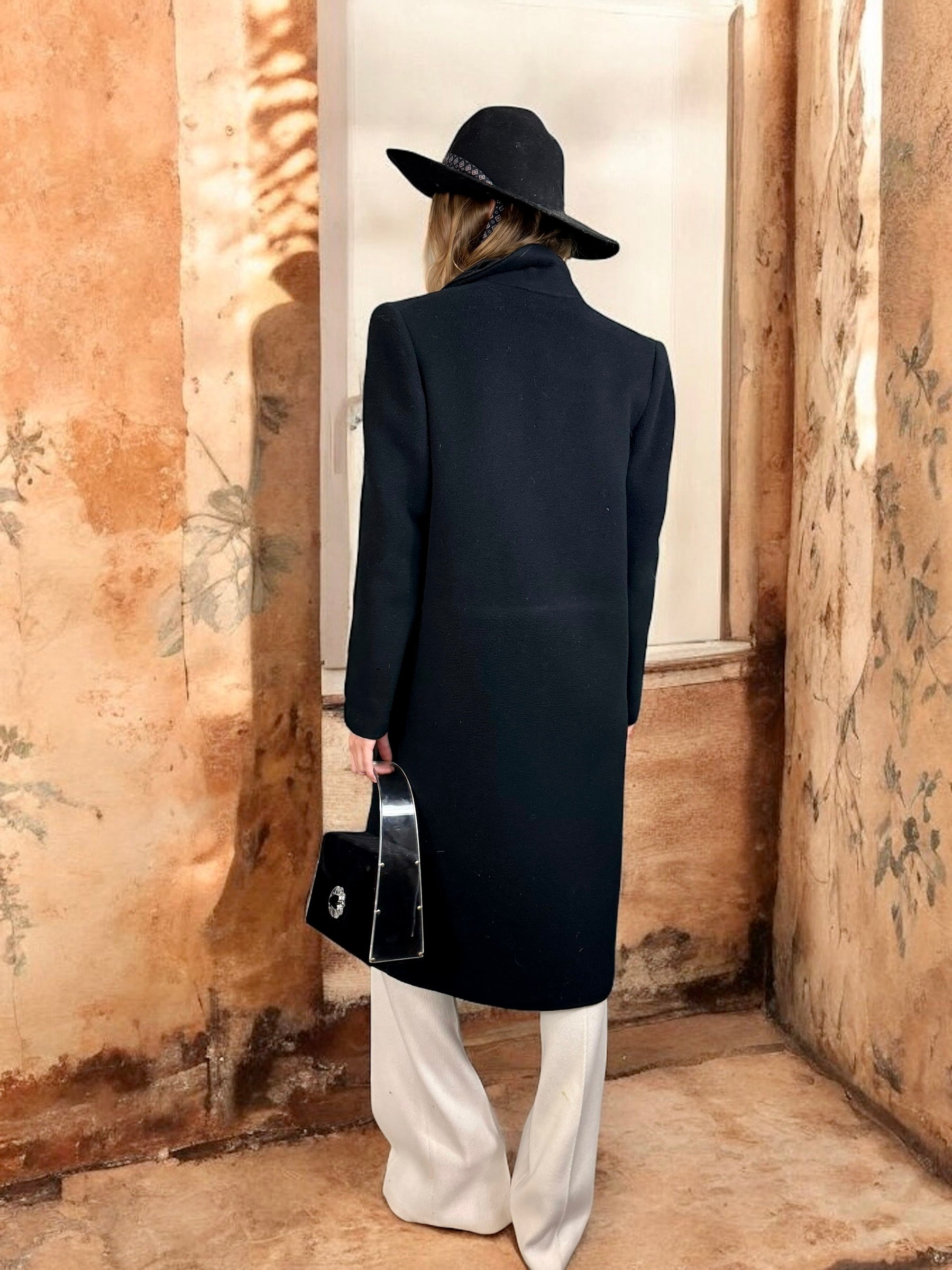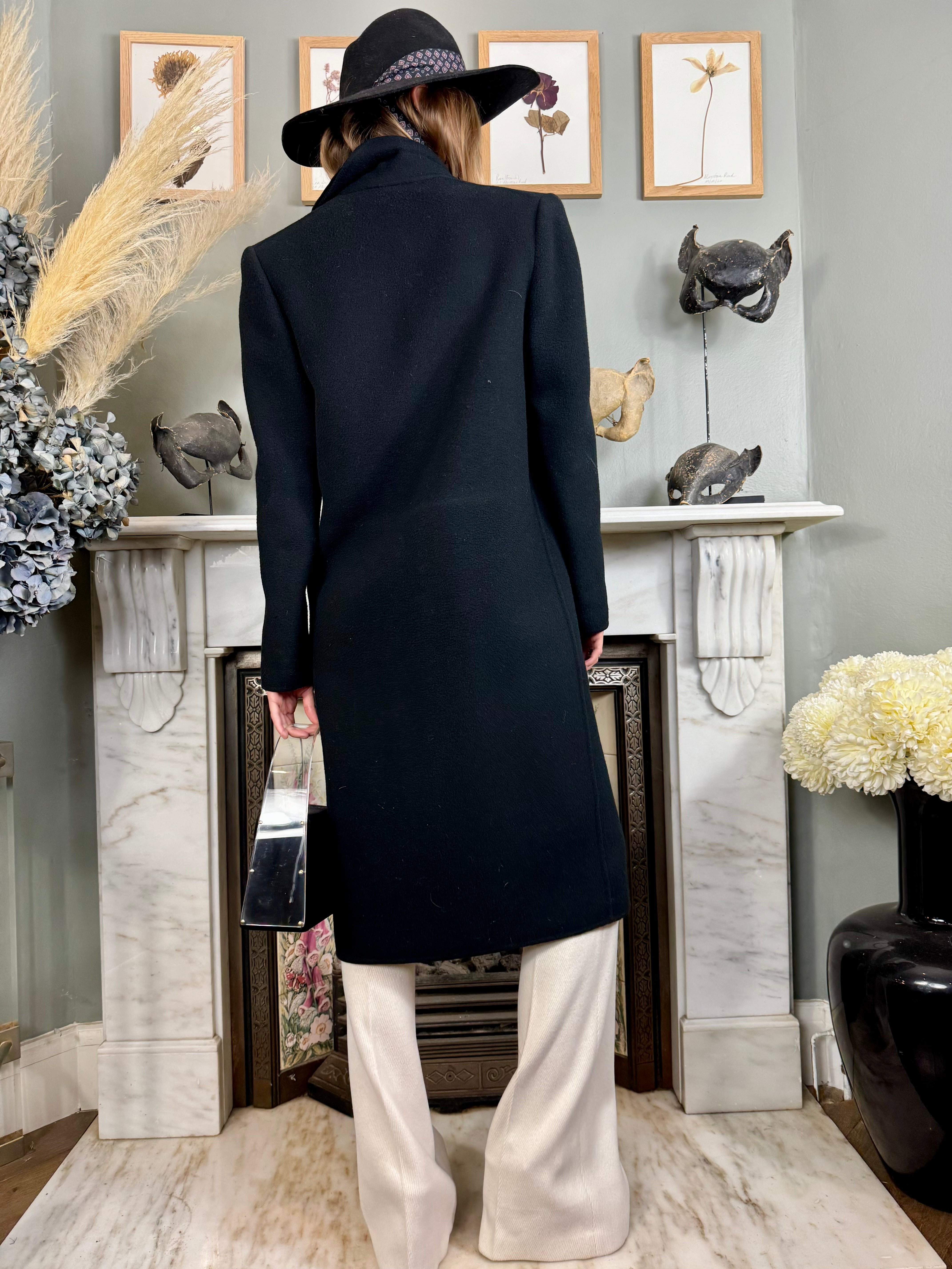 Indulge in timeless elegance with our Roula 80s black wool double breasted coat. Crafted with luxurious wool, this coat features velvet accents, long sleeves, and side pockets for added functionality.