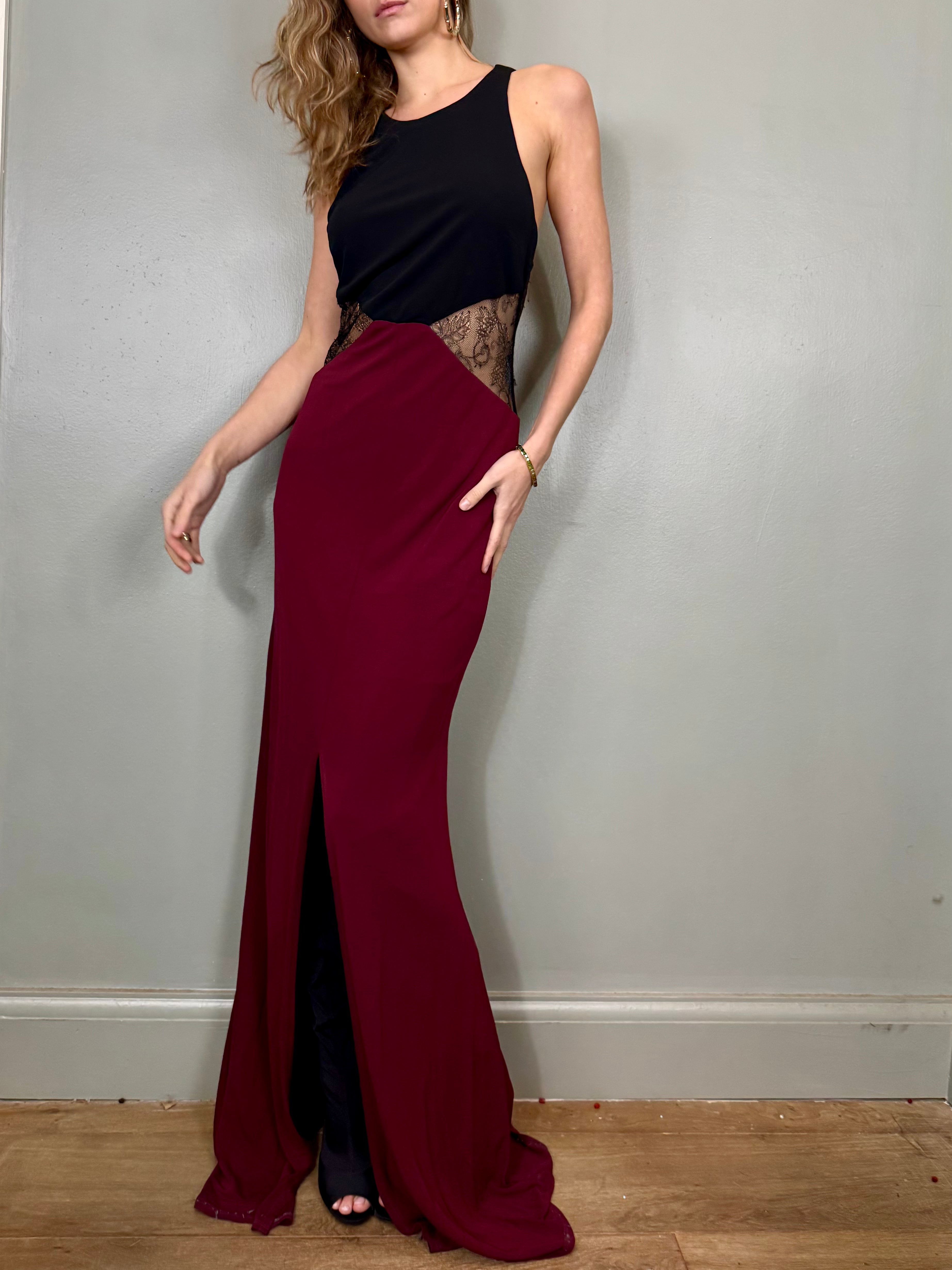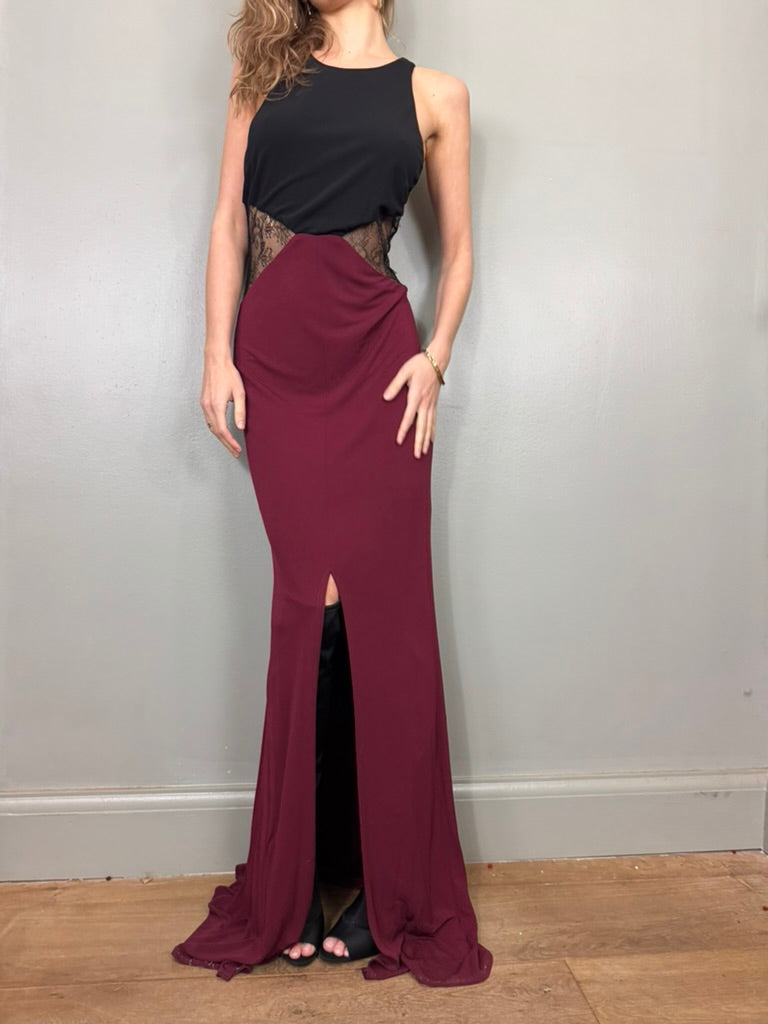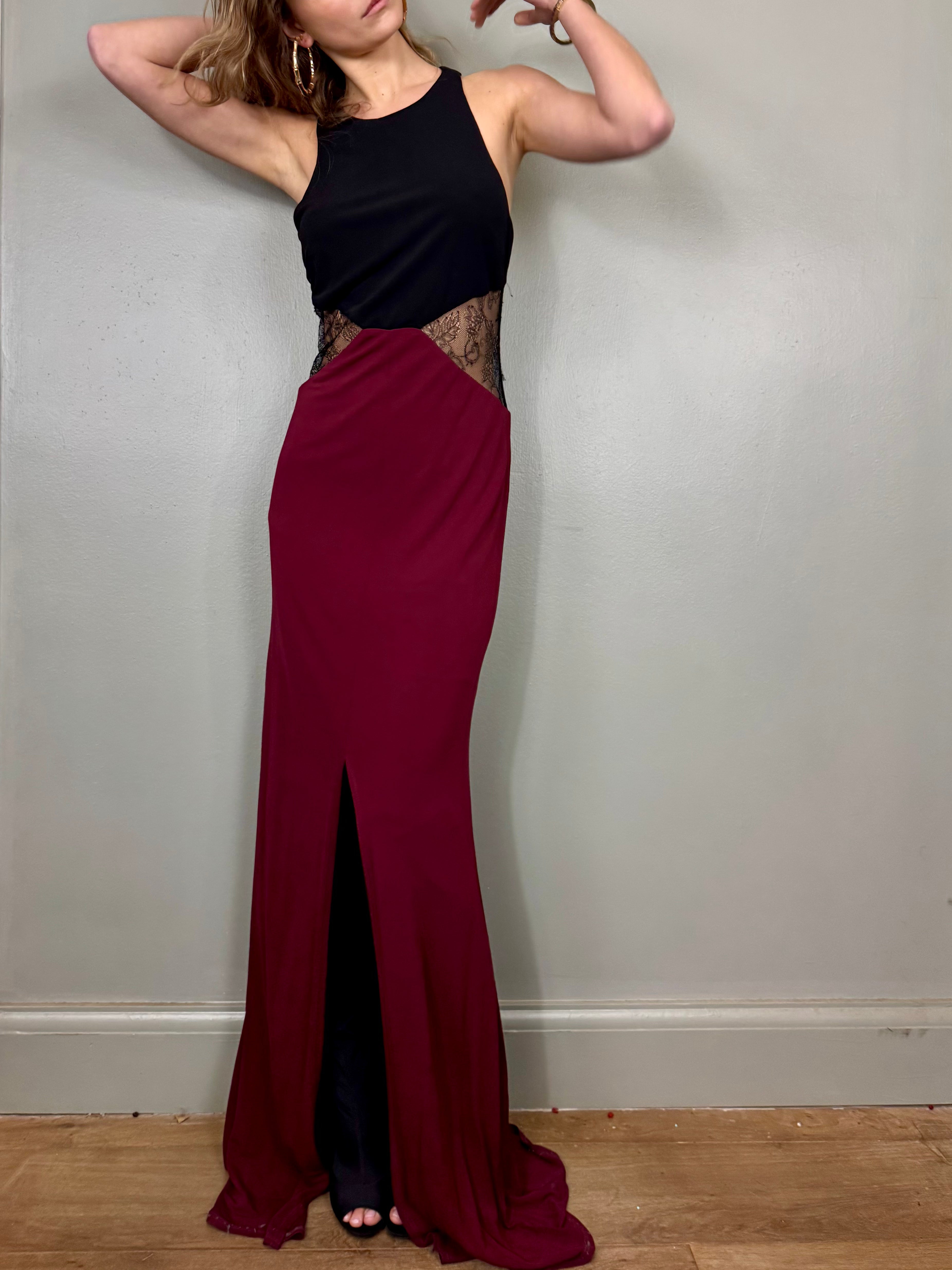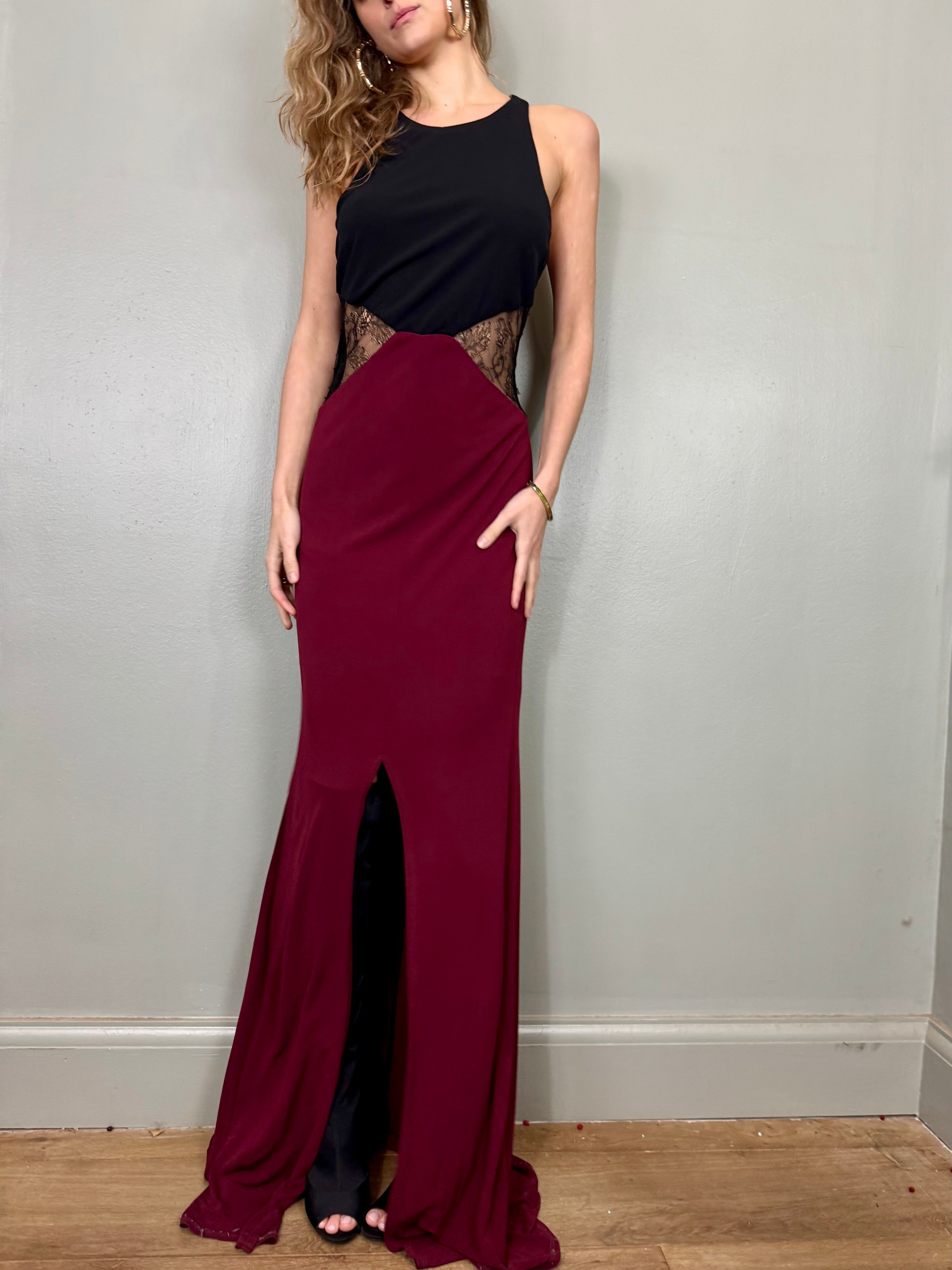This vintage dress is a timeless piece that exudes elegance and sophistication in blackand burgundy. Its sleeveless design and waist lace cutouts add a touch of femininity, while the long bodycon fit silhouette flatters the figure. The front slit and racer back design provide a modern twist, making it a versatile choice for any occasion.