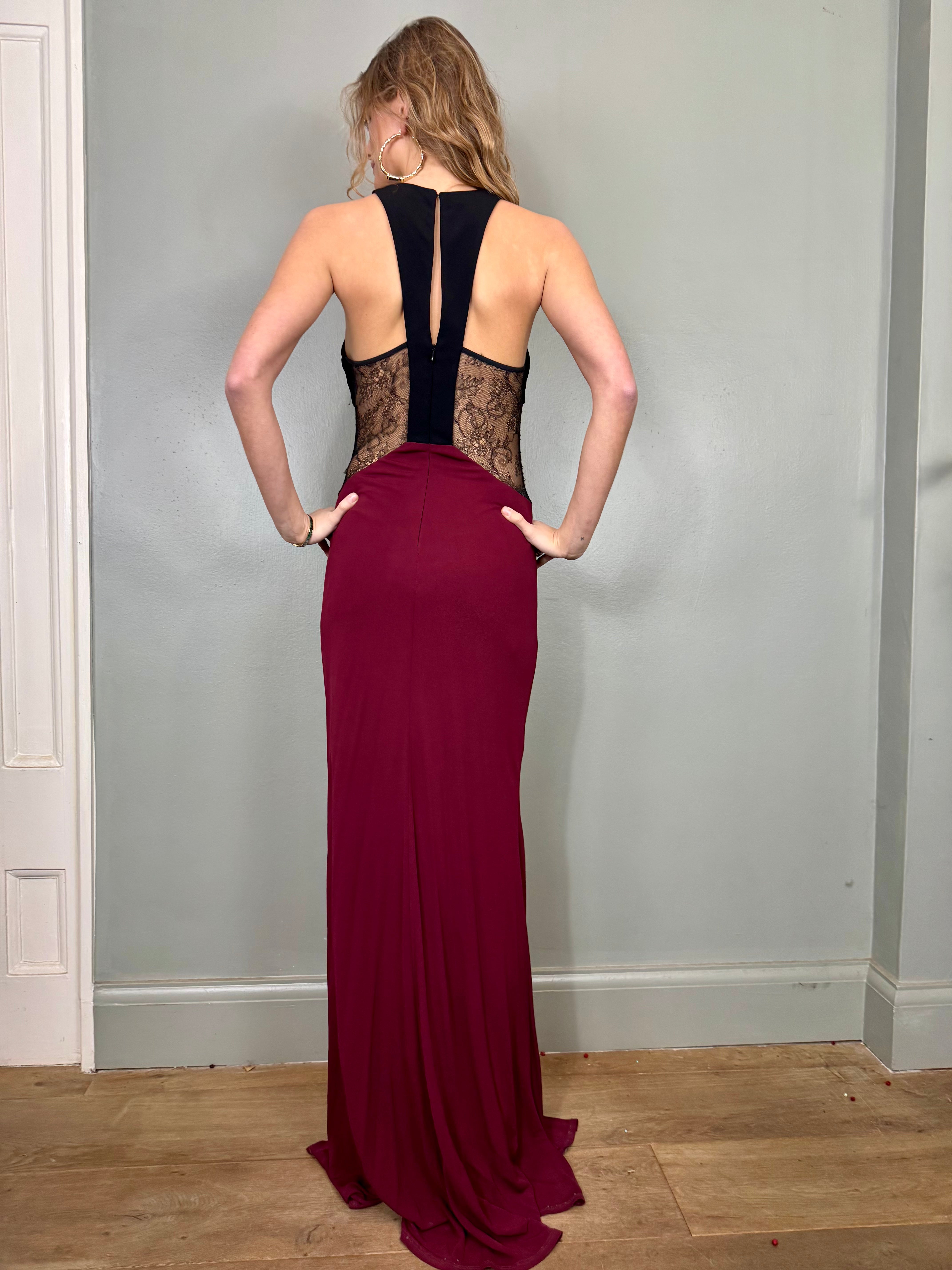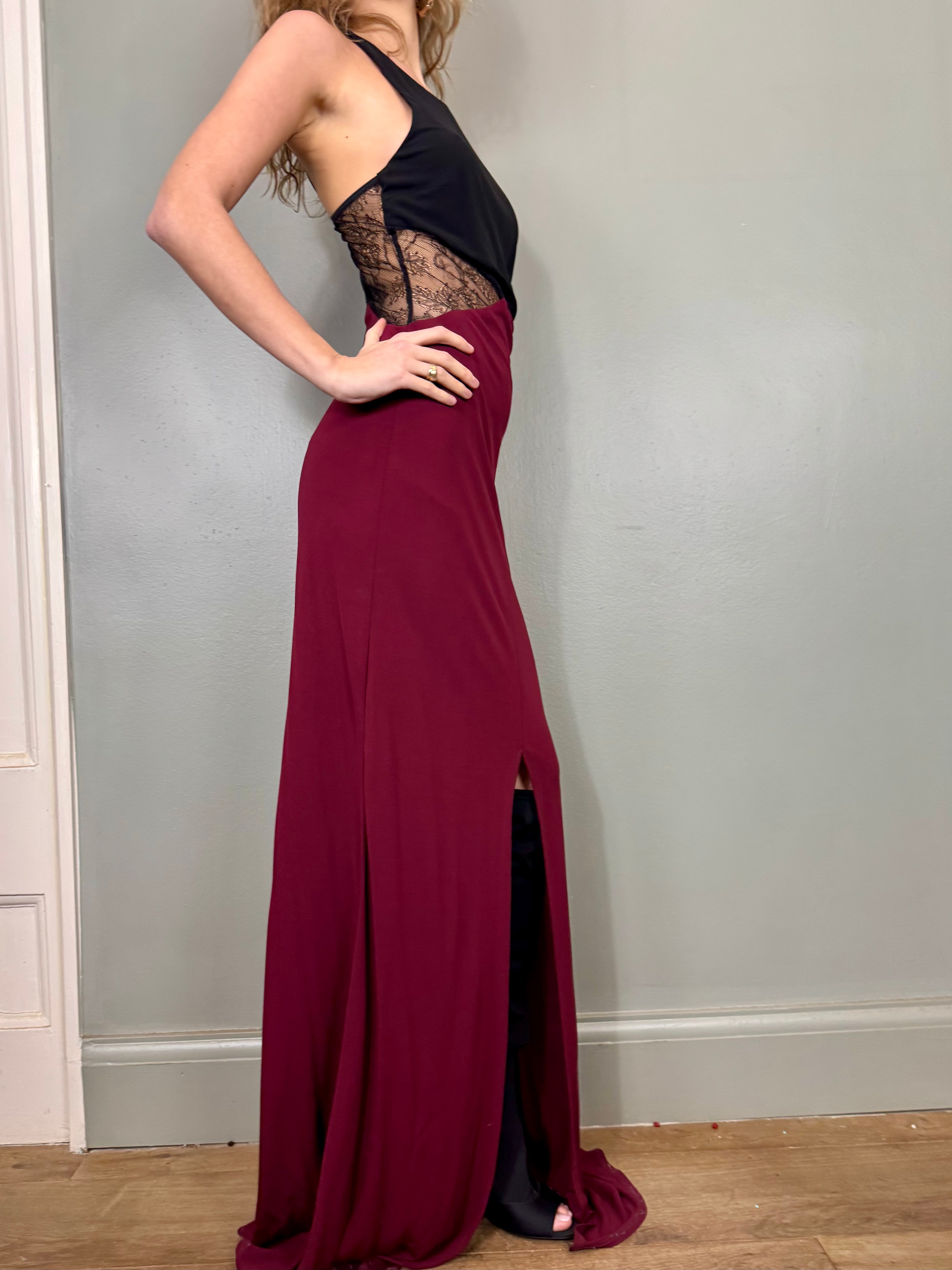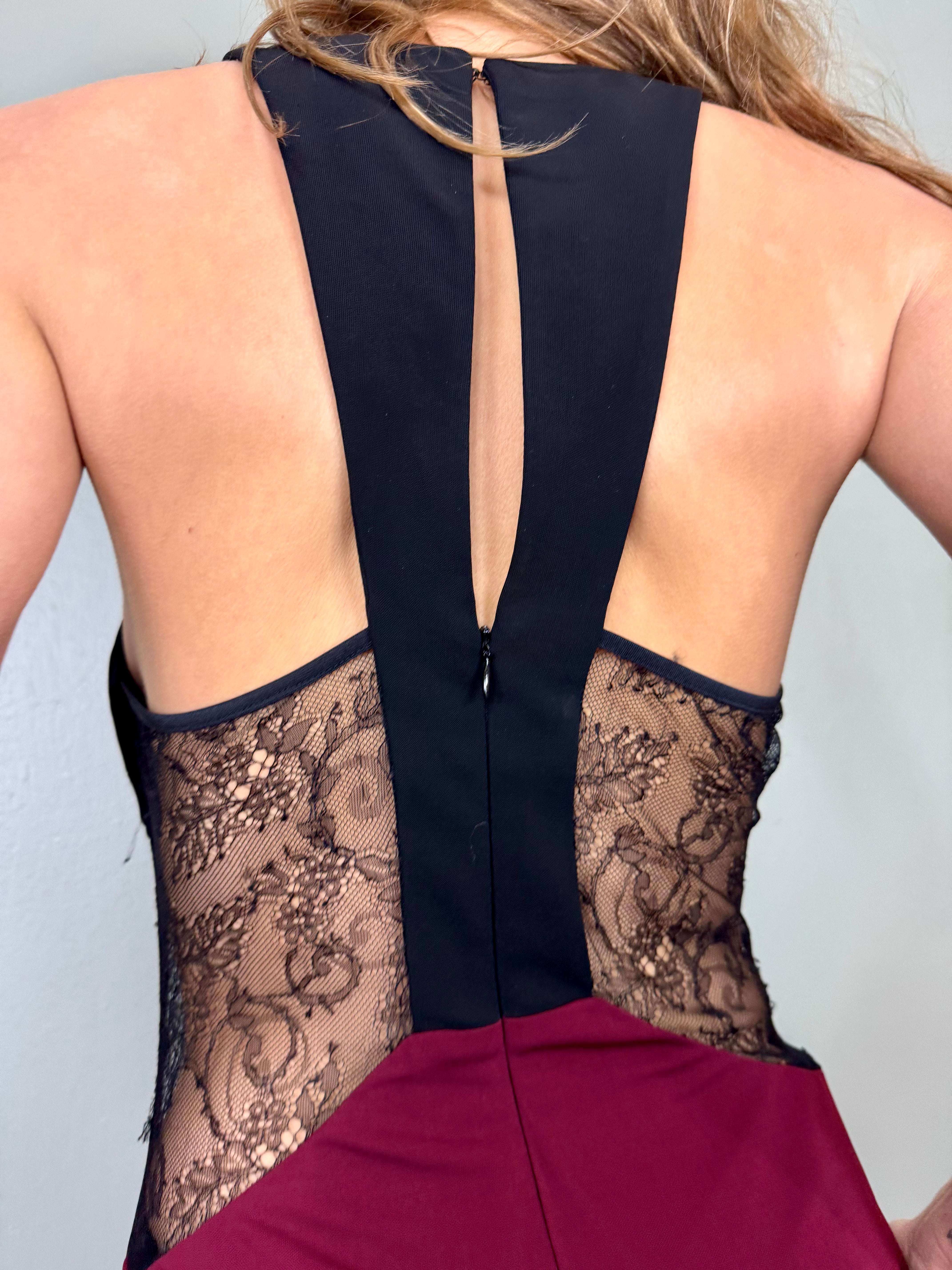 This vintage dress is a timeless piece that exudes elegance and sophistication in blackand burgundy. Its sleeveless design and waist lace cutouts add a touch of femininity, while the long bodycon fit silhouette flatters the figure. The front slit and racer back design provide a modern twist, making it a versatile choice for any occasion.