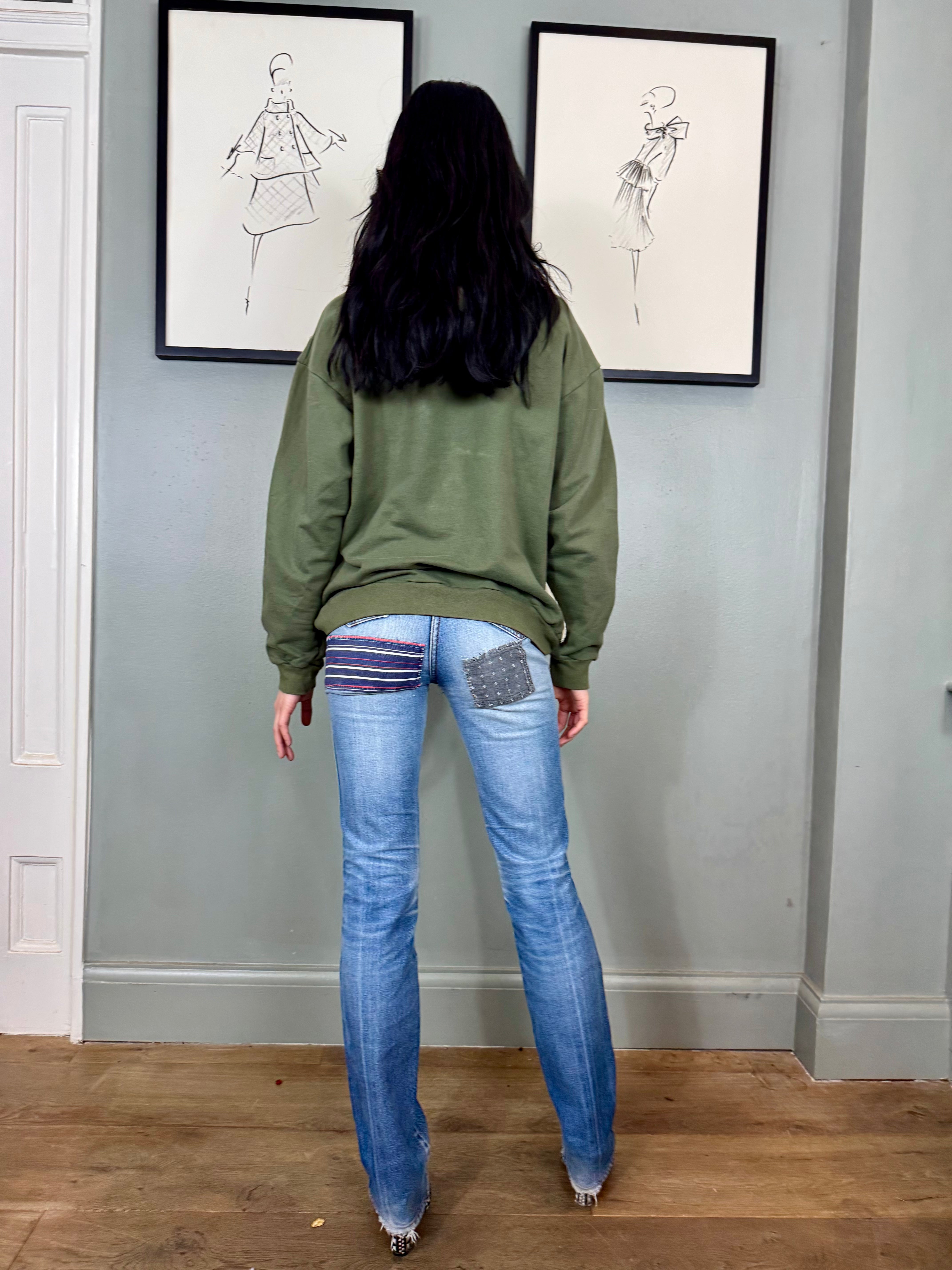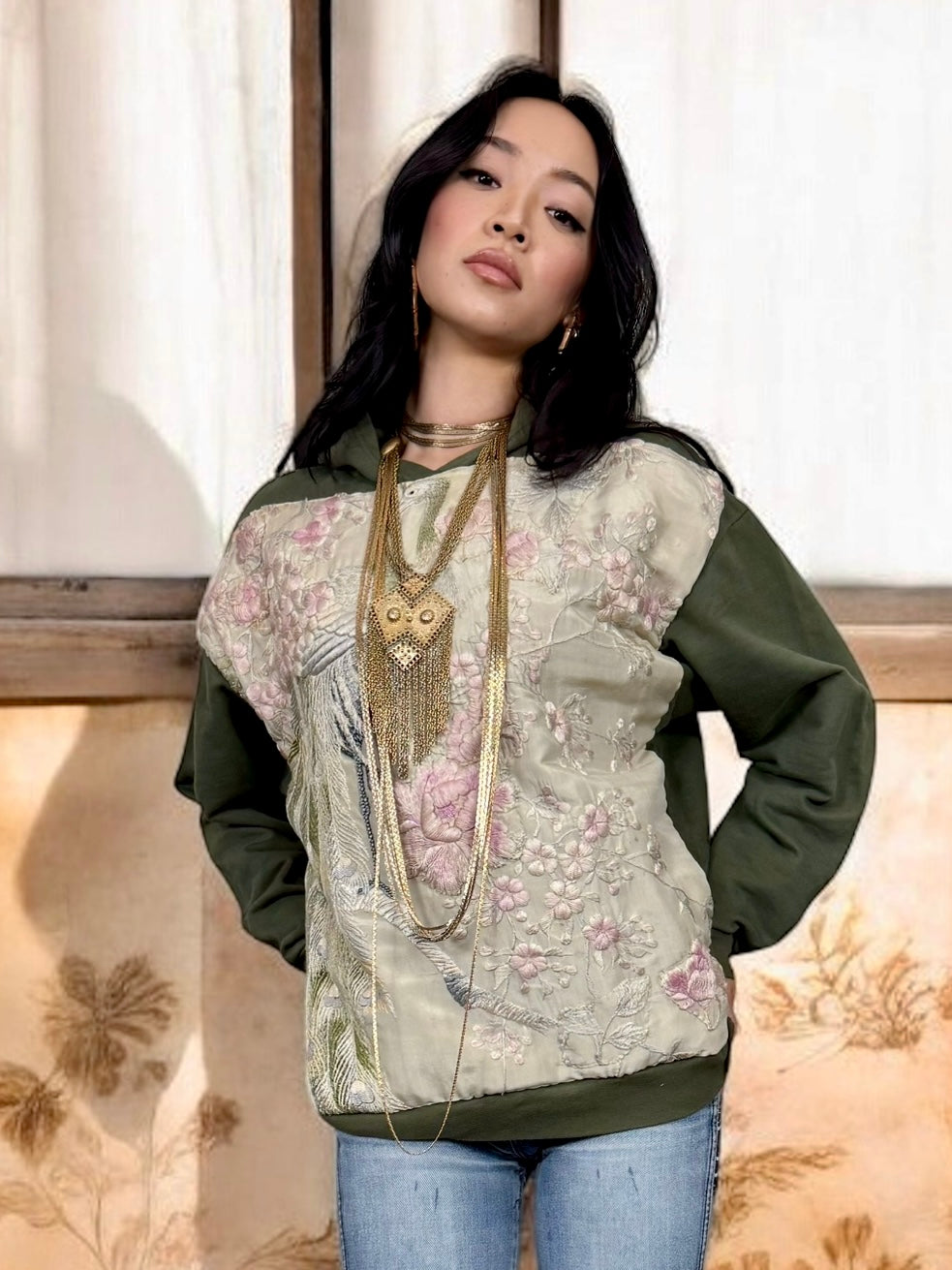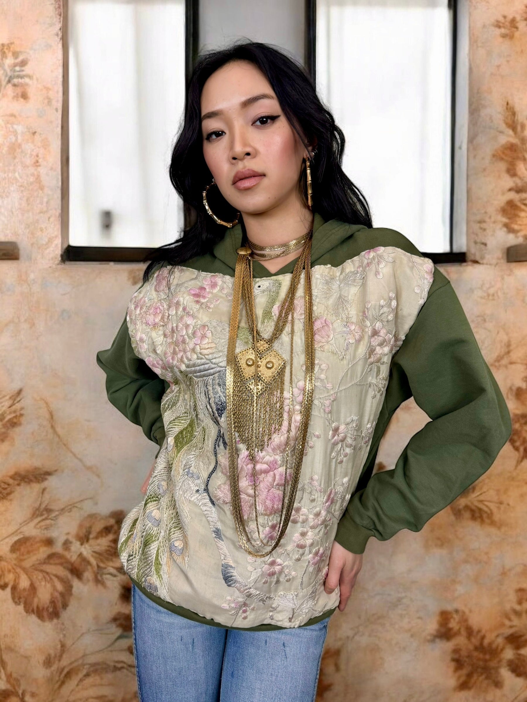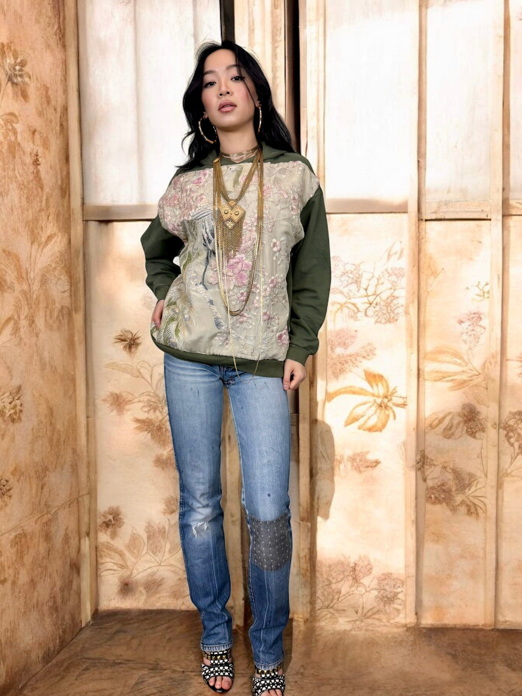Sestra, vintage hoodie sweatshirt with embroidered silk