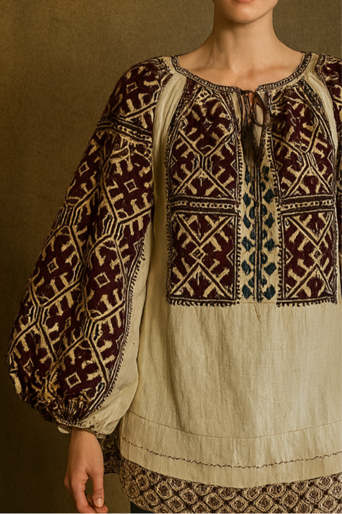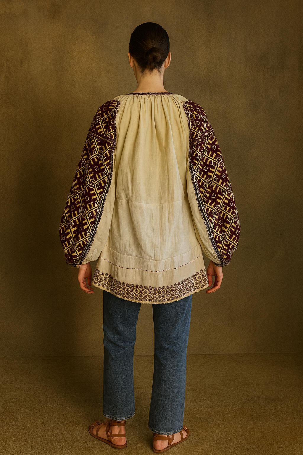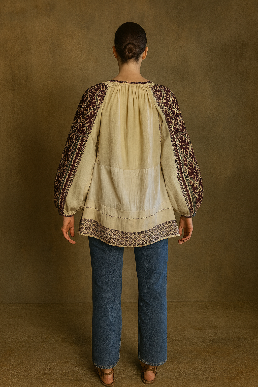 Indulge in true heritage with this 40s cotton embroidered and beaded blouse. The dramatic balloon embroidered sleeves and front slit with a necktie enhance the A line fit for an effortless yet striking look. Featuring stunning Hungarian embroidery in burgundy and pink, with small sequins for a touch a little sprinkle of joy.