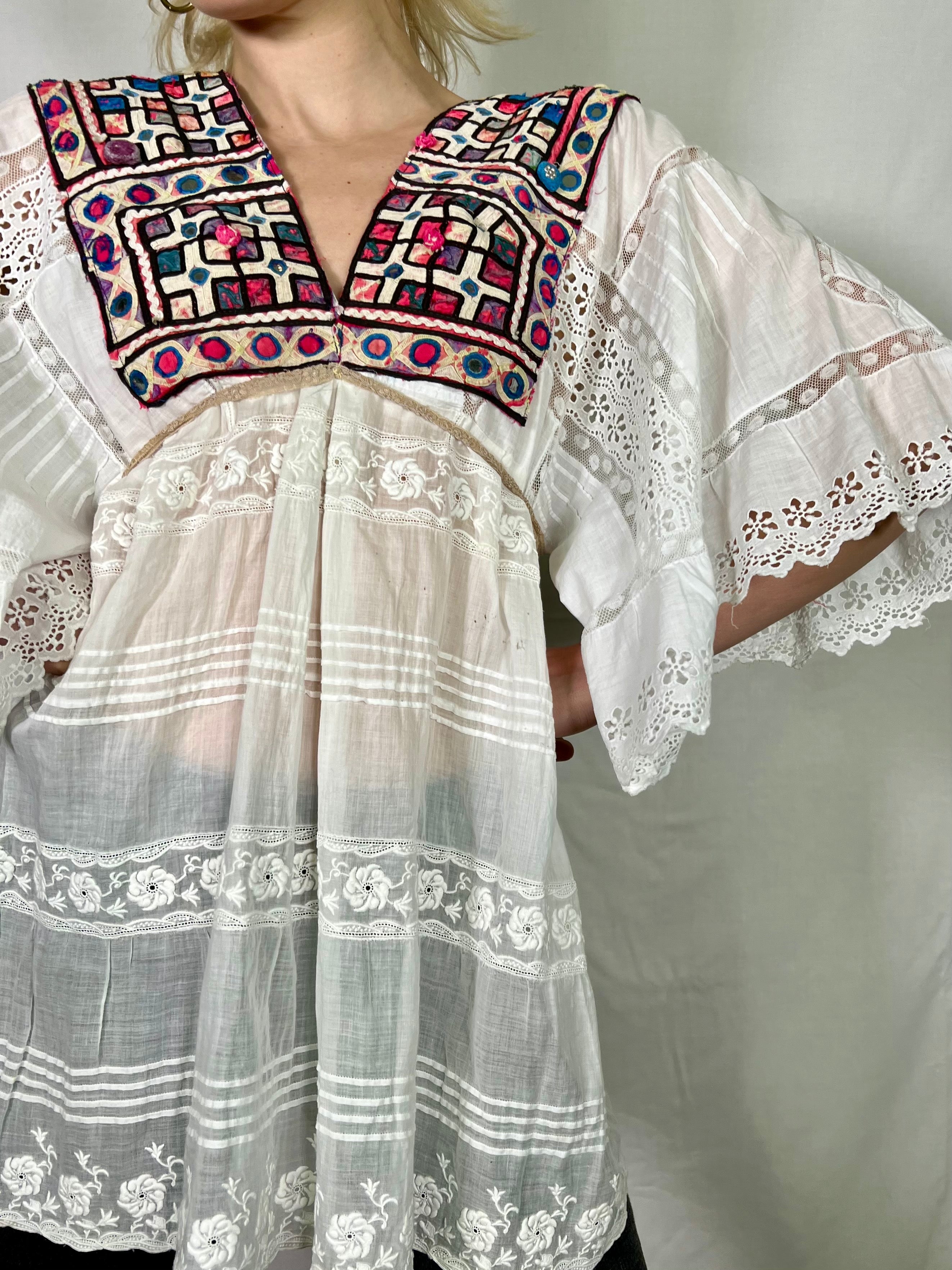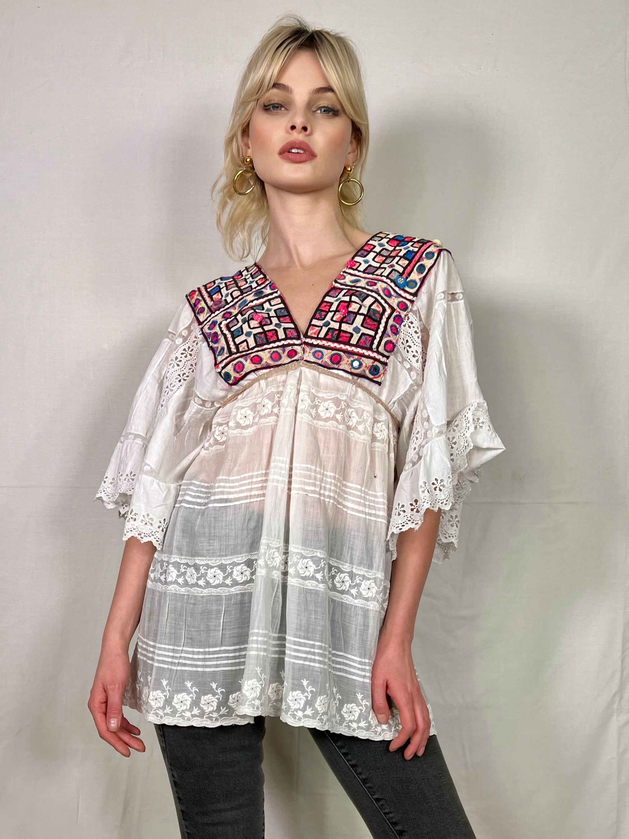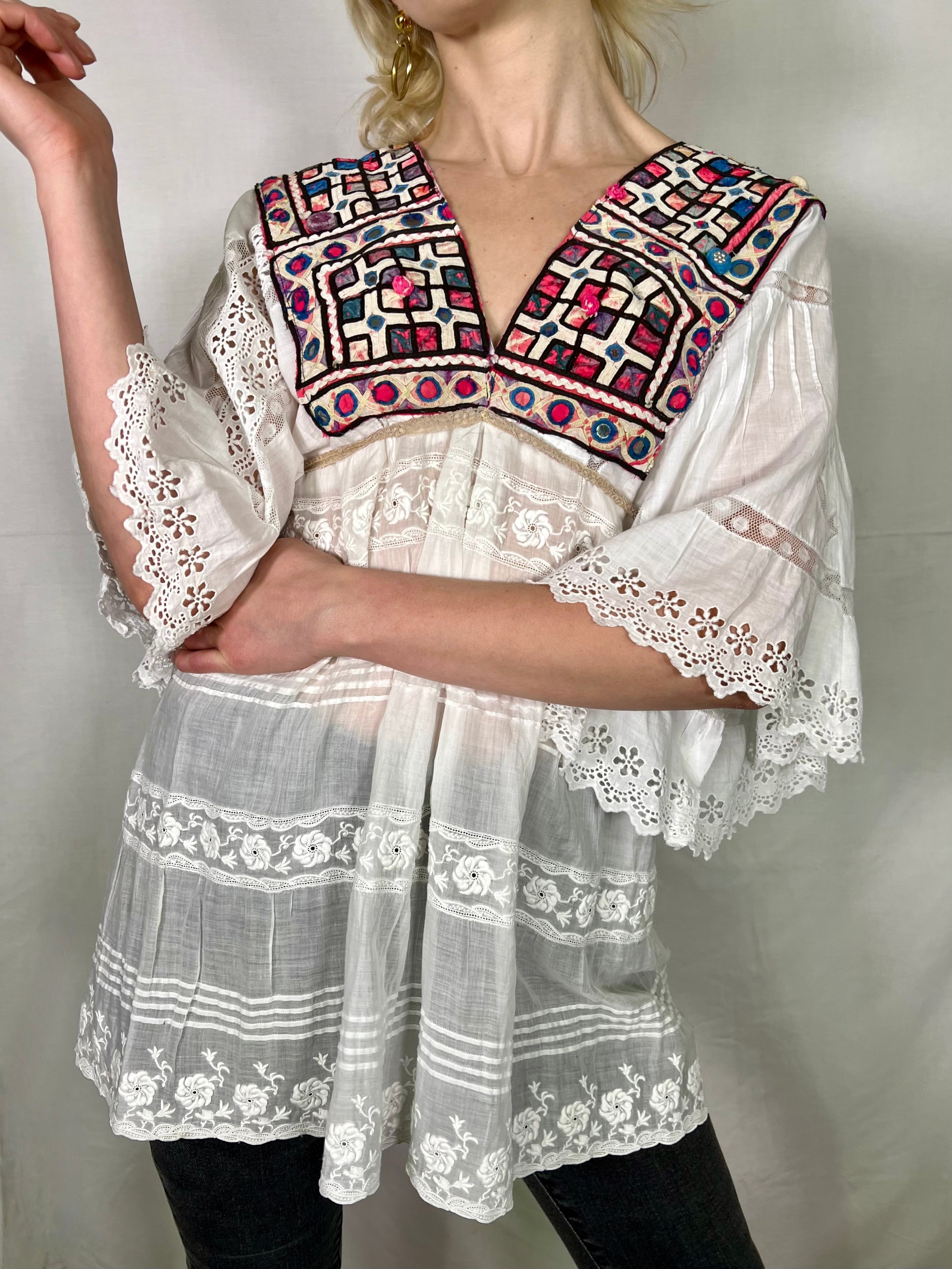 Fresh and versatile, white eyelet tunic blouse with wide sleeves and a pretty floral cotton skirt. Has a pretty antique Indian design on the front and back. Ties under the bust for a snug fit.