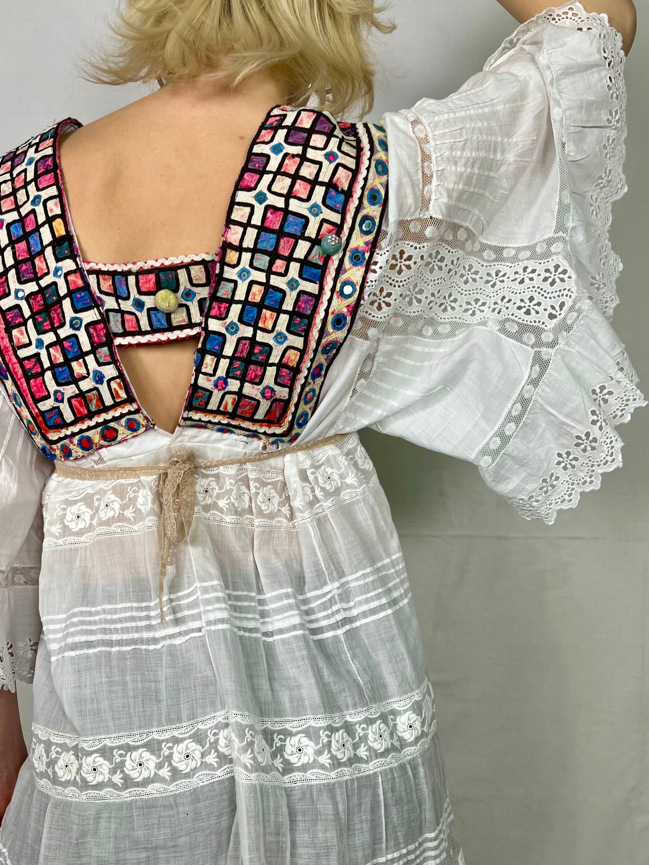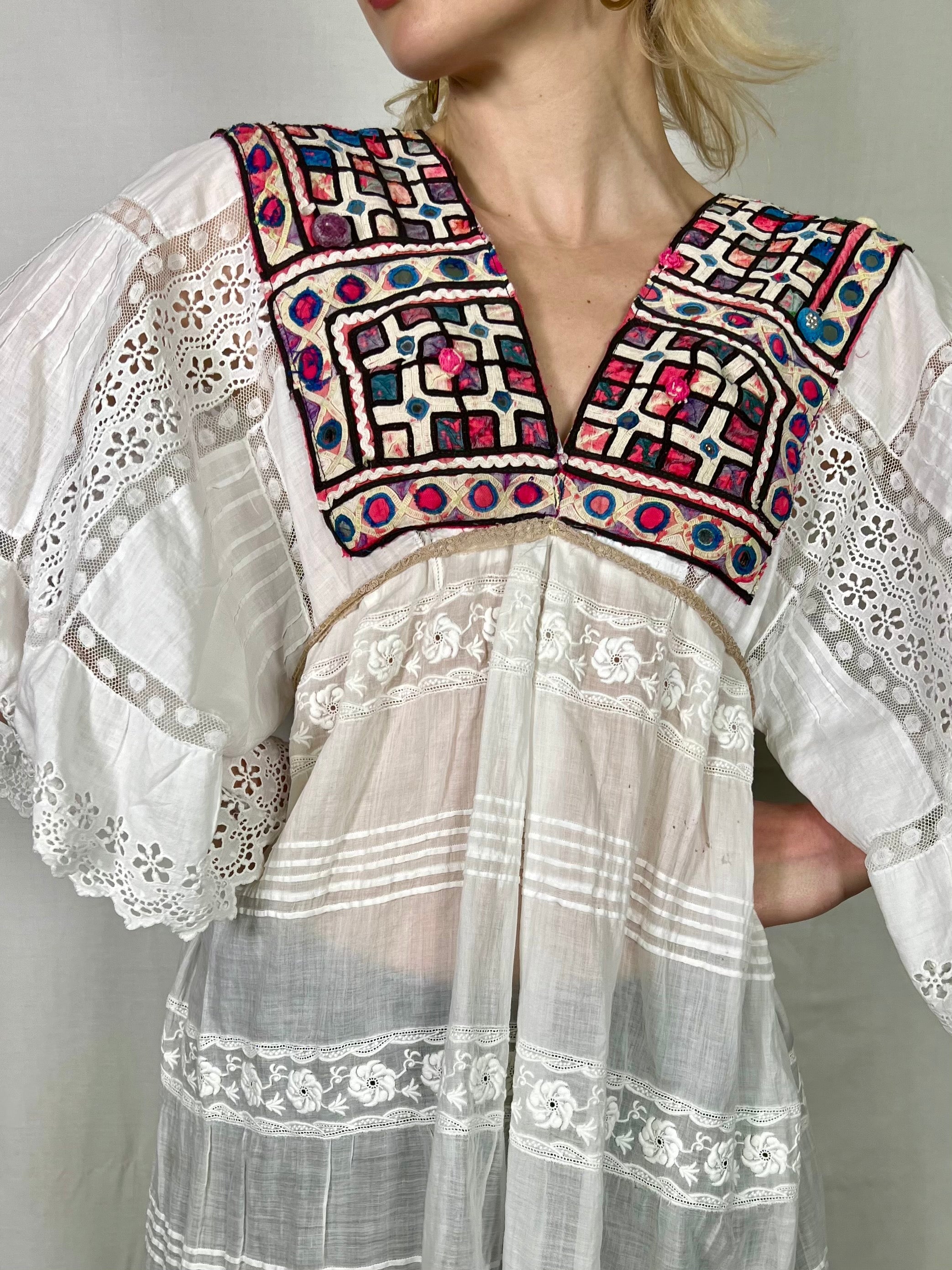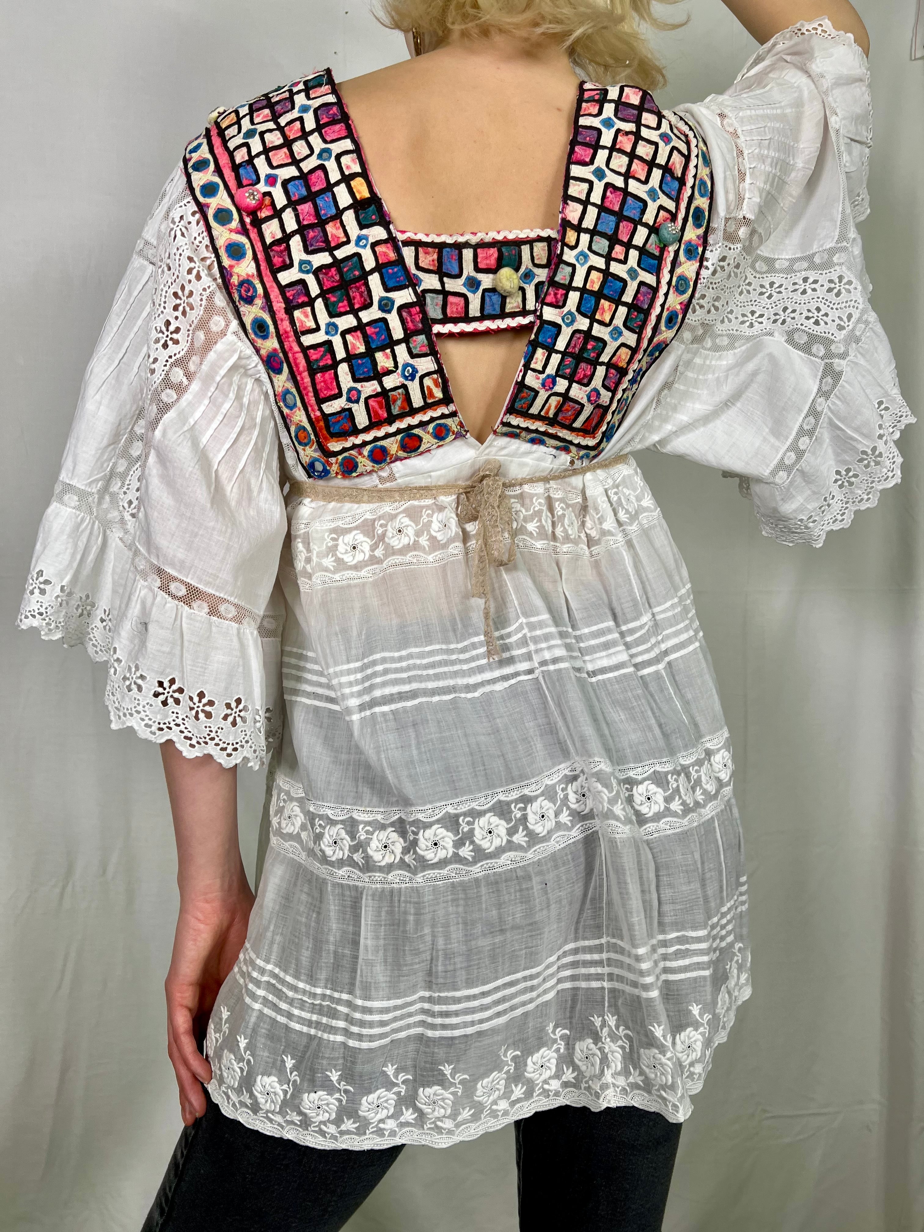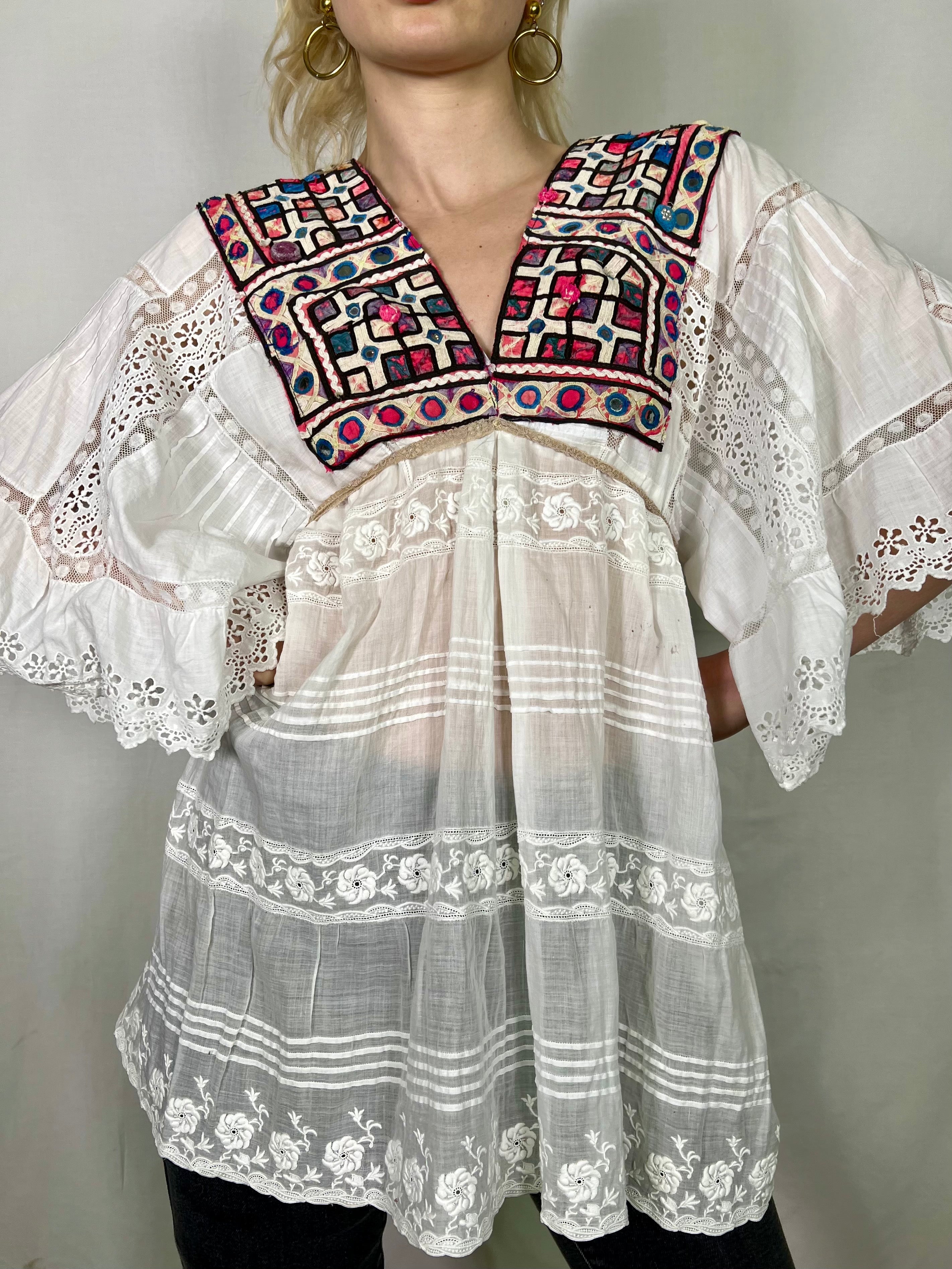 Fresh and versatile, white eyelet tunic blouse with wide sleeves and a pretty floral cotton skirt. Has a pretty antique Indian design on the front and back. Ties under the bust for a snug fit.