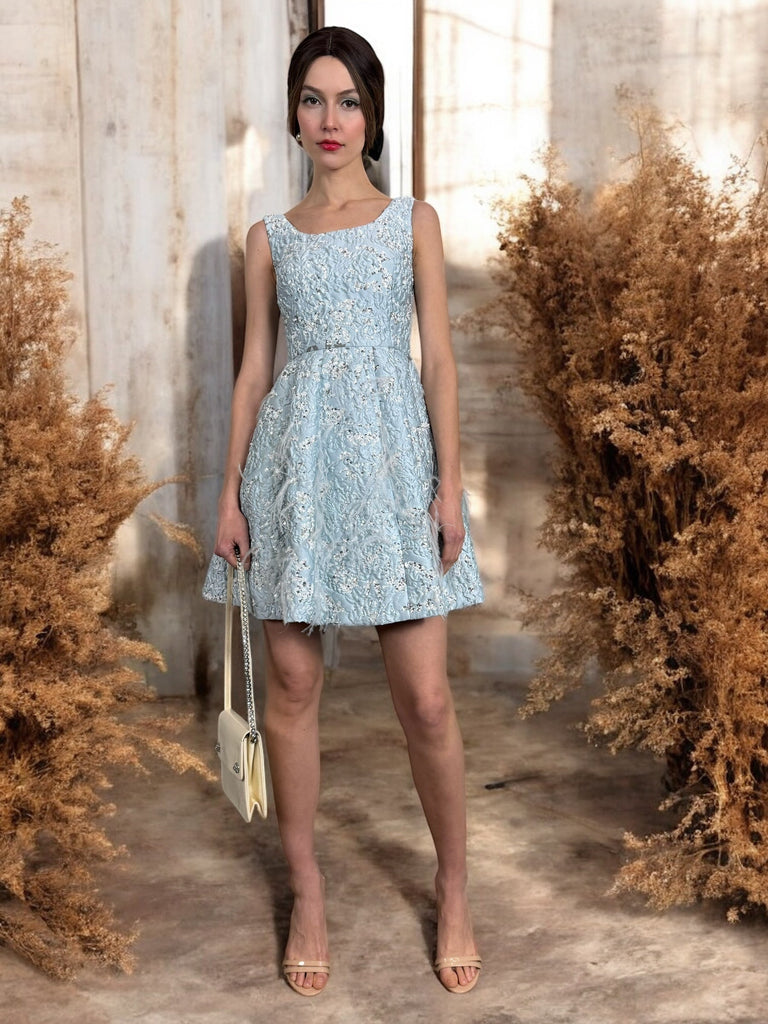 Oscar de la Renta, beaded feather pale blue dress