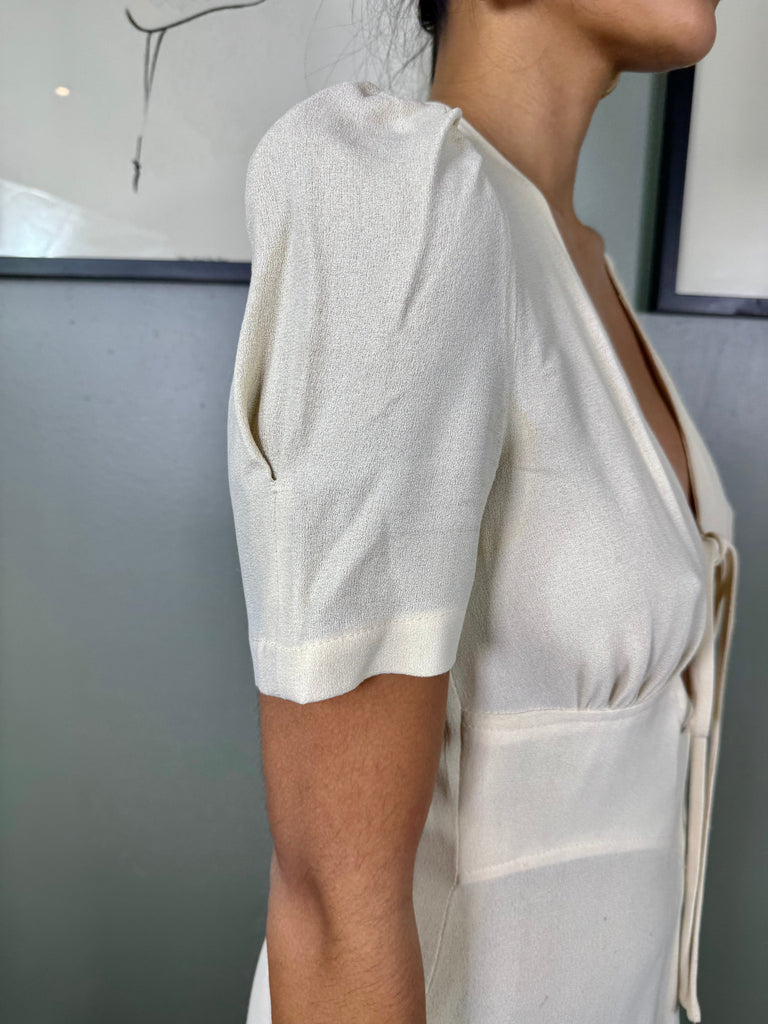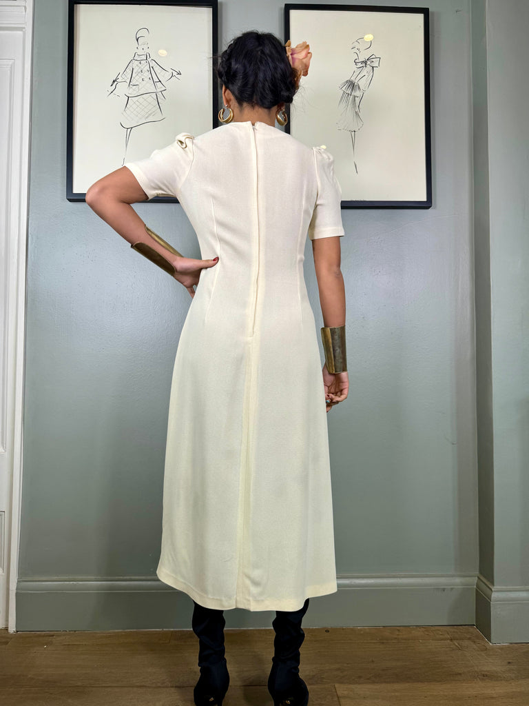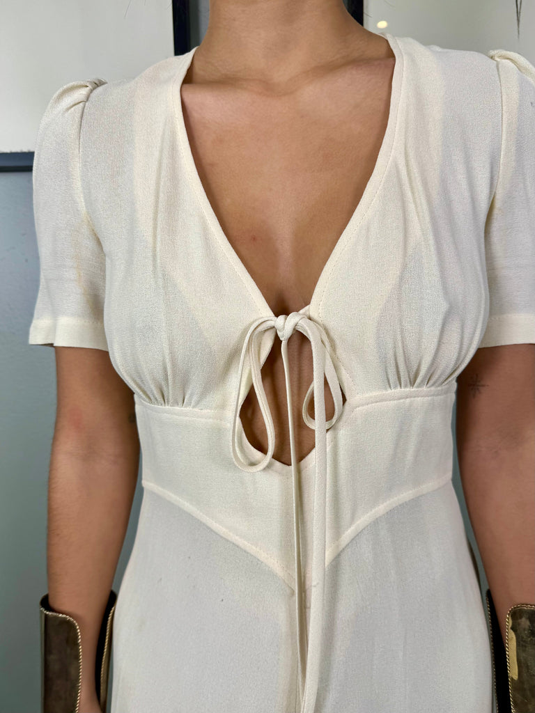 Gorgeous and iconic designer Ossie Clark, 70s, cream crepe dress with front keyhole design that ties across the bust. Has short sleeves and an A line skirt. Zips on the back. Has its original label. Very collectable.