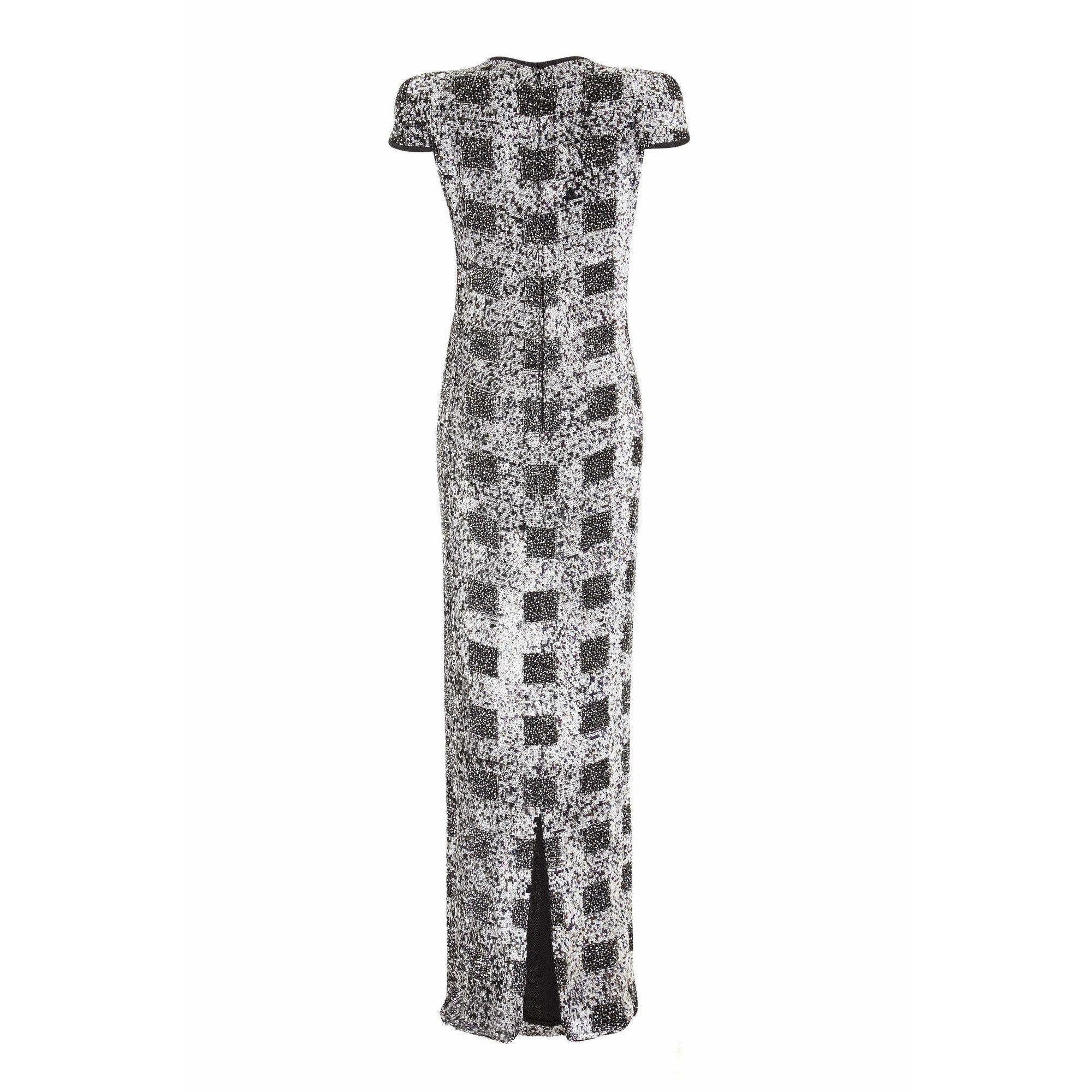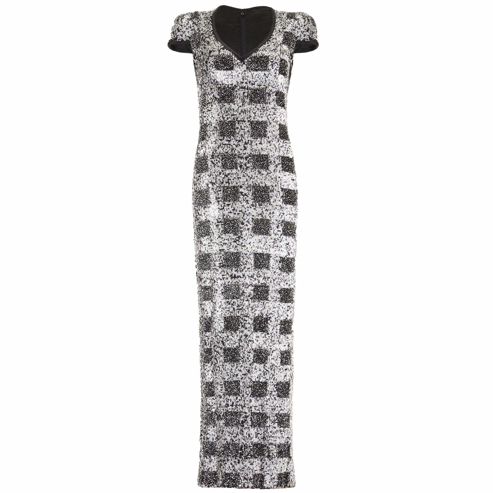 This sensational 1970s fully beaded full-length dress is from classic Italian designer Andre Laug and is of exceptional quality. This incredible dress is embellished in its entirely with monochrome and silver sequins and rocaille beadwork arranged in a chequered design to striking effect. The intensity of the beading creates a pleasing weight and the dress simply exudes timeless Hollywood style glamour. Featuring cap sleeves, a V neckline and a vent at the back of the skirt to allow fluidity of movement, the dress is in excellent vintage condition, it is fully lined in black and fastens with a zip at the centre reverse. Would best suit a US size 6, UK 10.