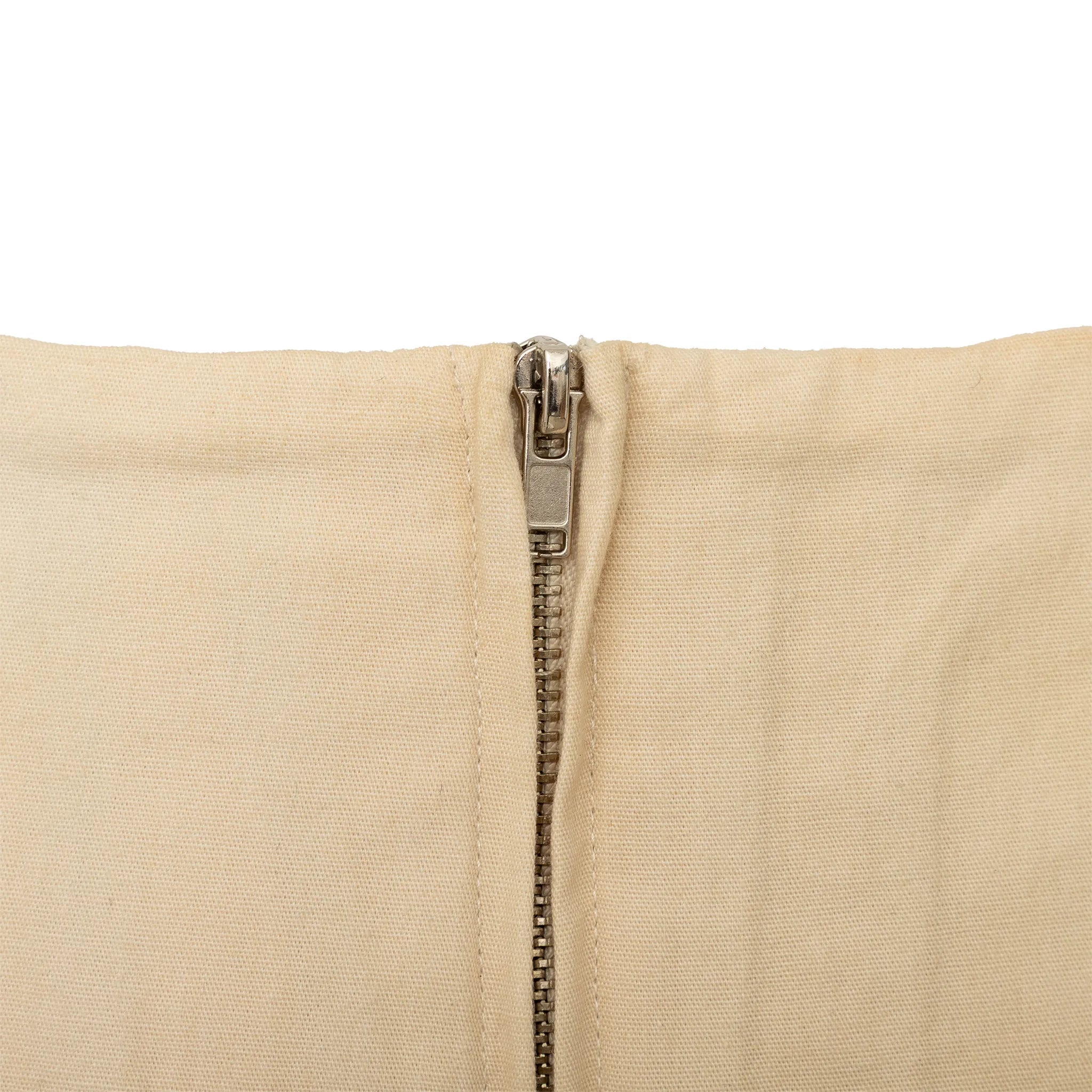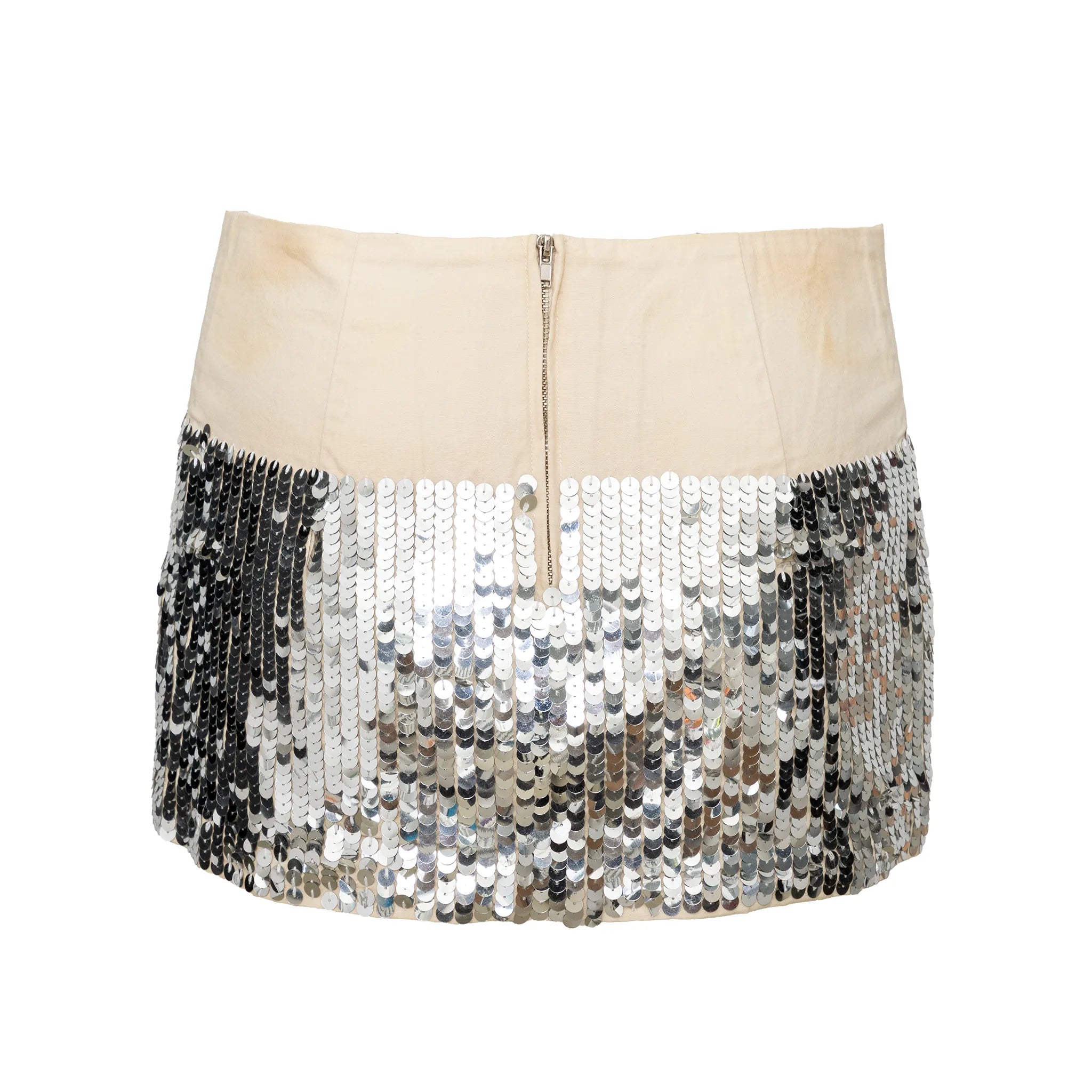 Future Classics mini skirt in off-white cotton canvas features silver sequin-embellishments and a back zipper, blending casual charm with bold sparkle.