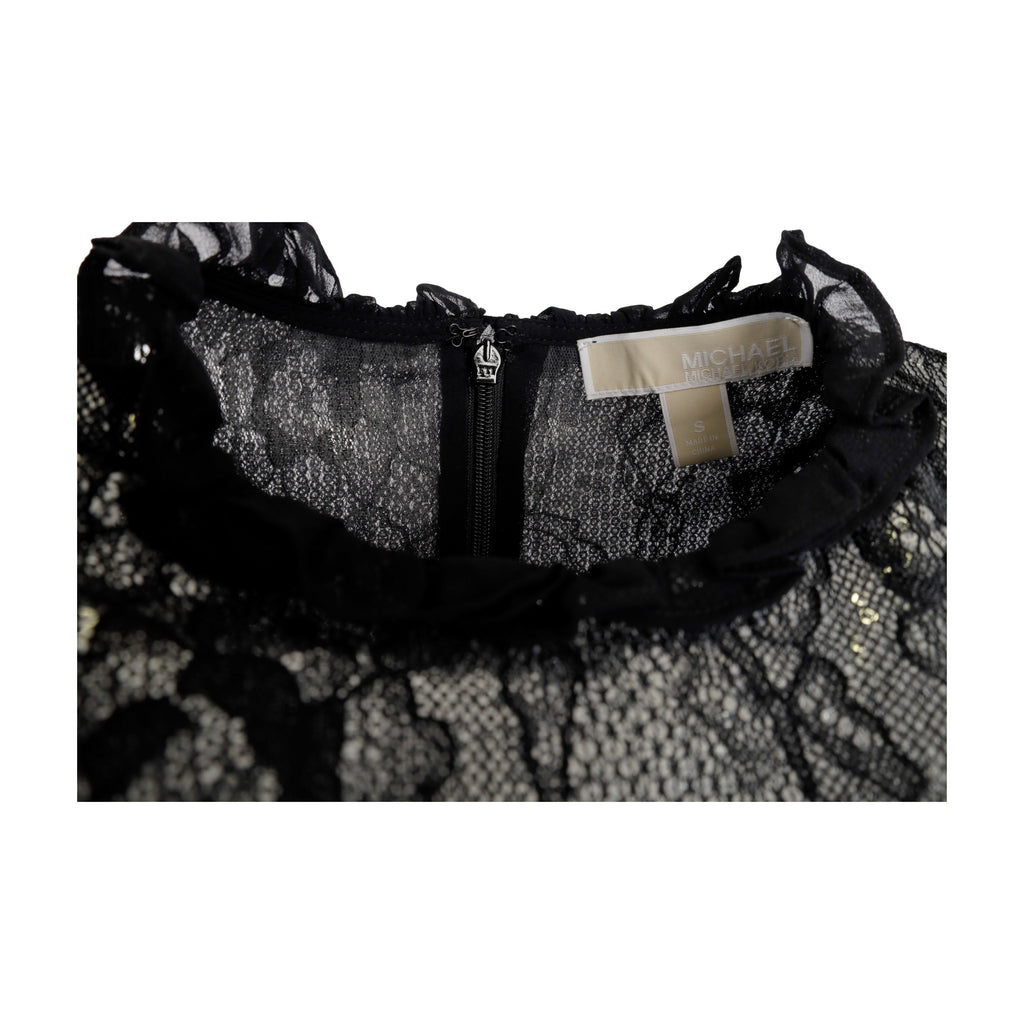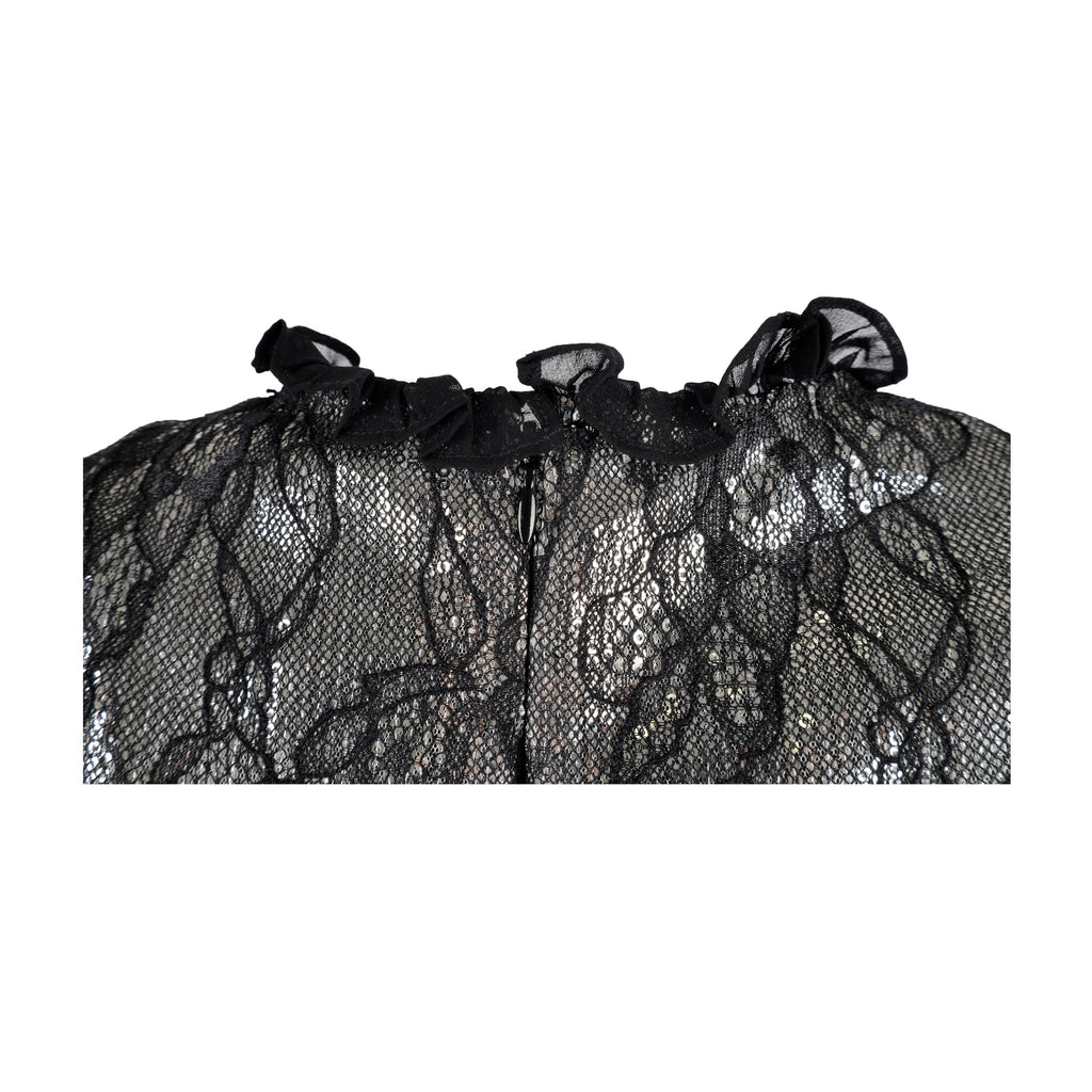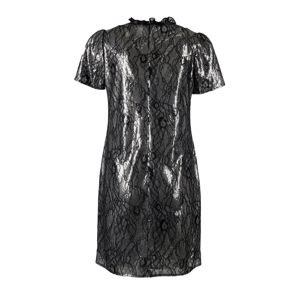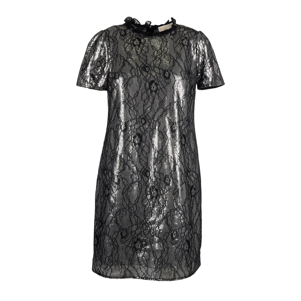 This Michael Kors dress is a modern take on a classic look. Featuring a ruffled collar, short sleeves with pleats along the seam for an enhanced silhouette, and a black inner lining, this garment is complete with silver and black sequin lace for added glamour.