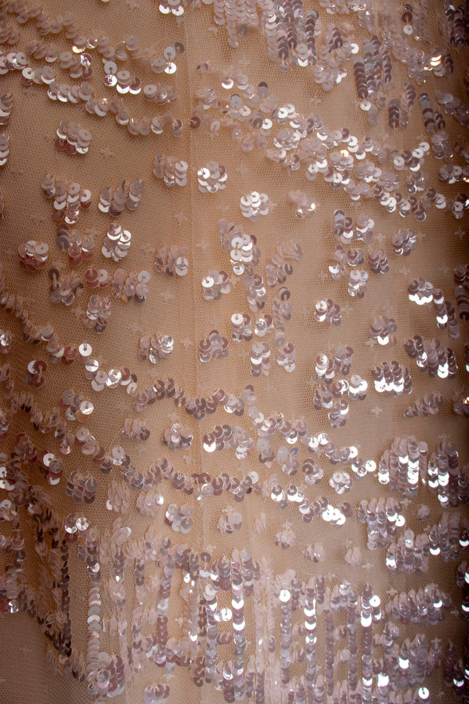 This iridescent tulle maxi dress shines in a way that photos struggle to capture. Featuring delicate blush tulle embellished with shimmering sequins, its floor-length and fully lined princess silhouette is perfect for special occasions or as a wedding dress. Elegant, dreamy, and timeless, it offers a romantic and sophisticated look you'll cherish.