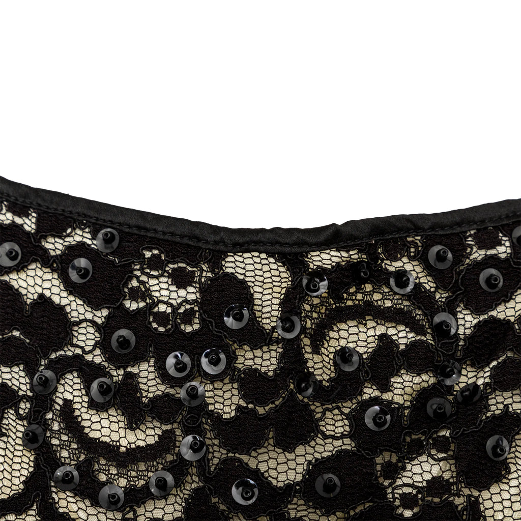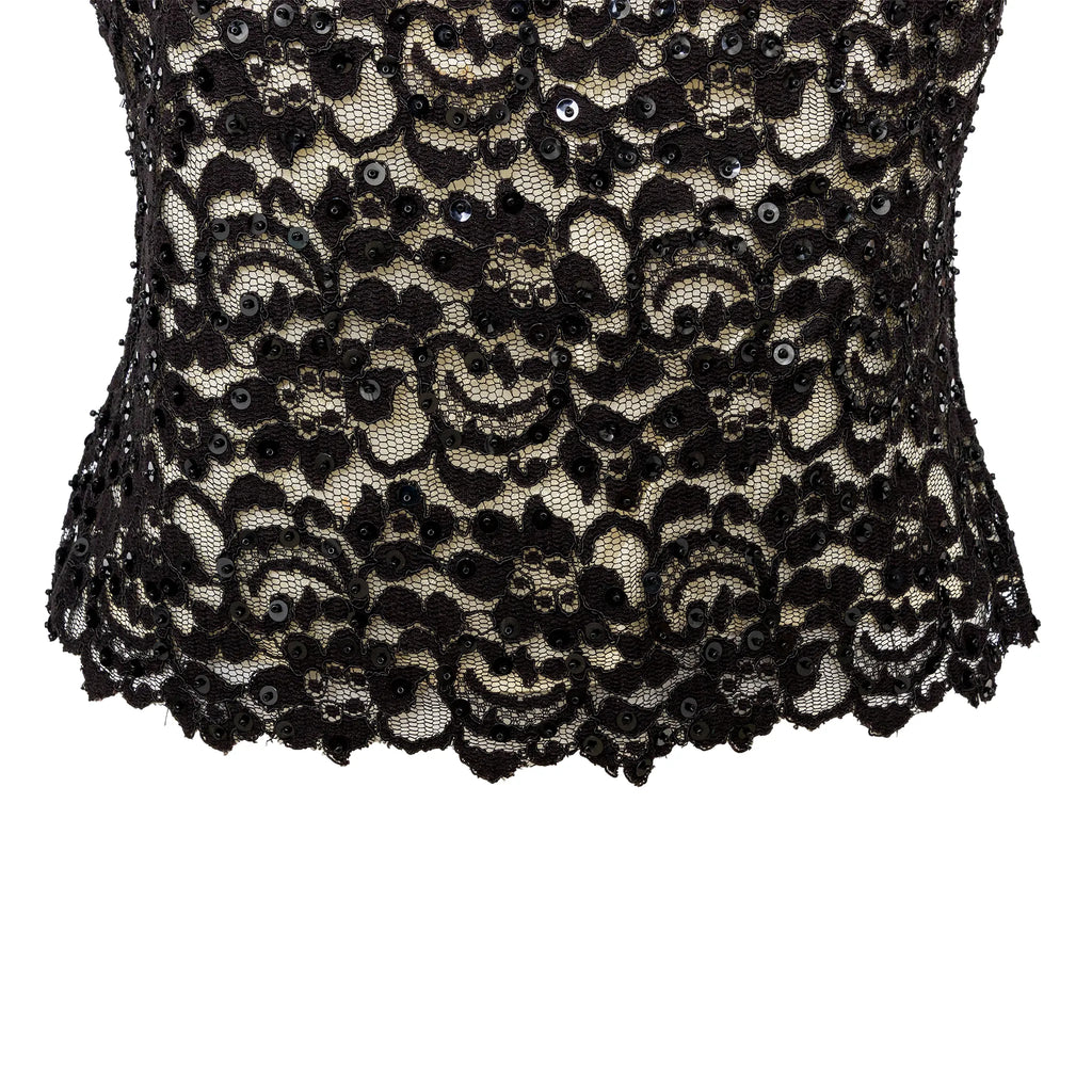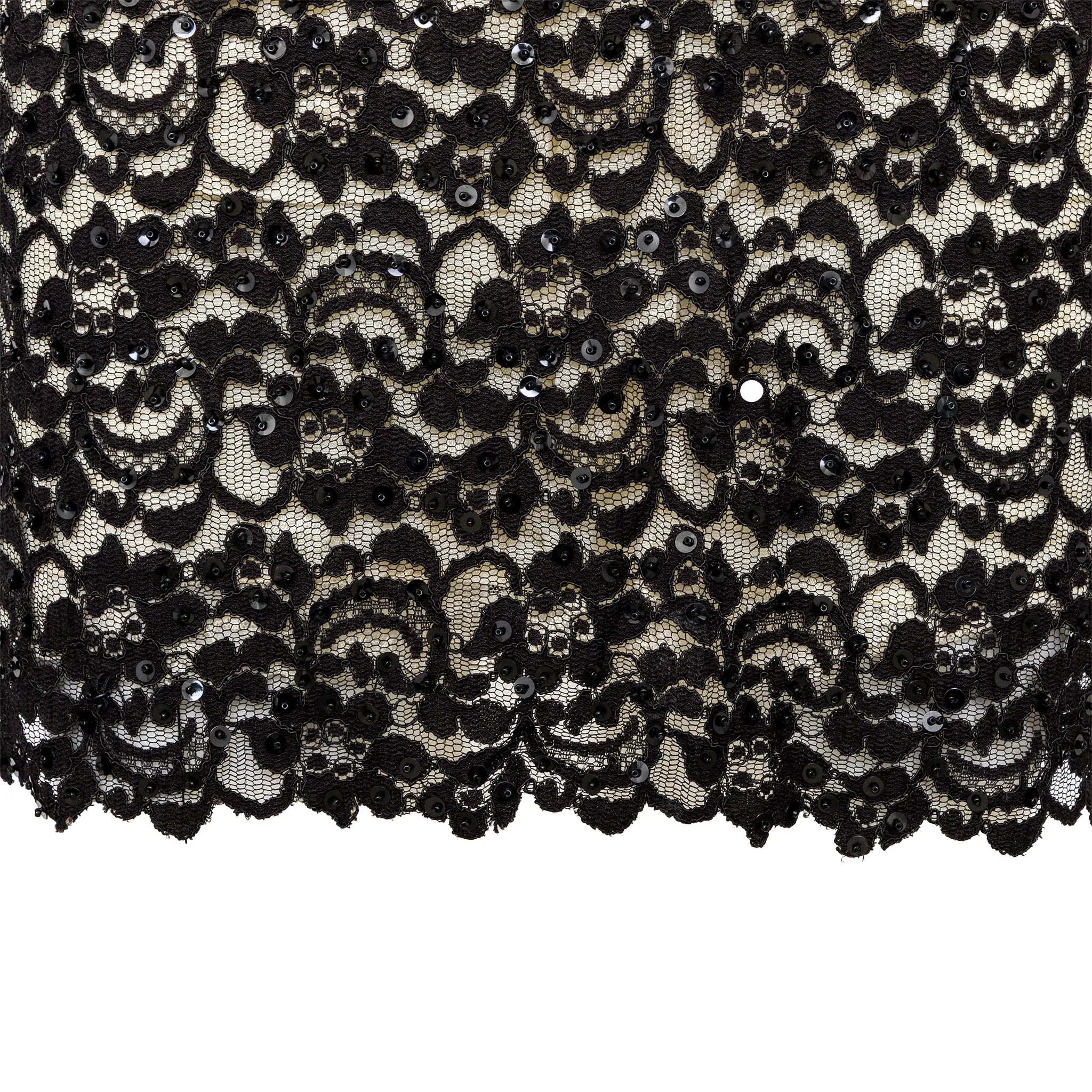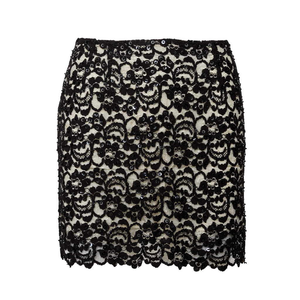 Chic lace sequin set made of viscose with jacquard lining. Camisole top with open back pairs perfectly with a mini skirt featuring a lace scallop hem.