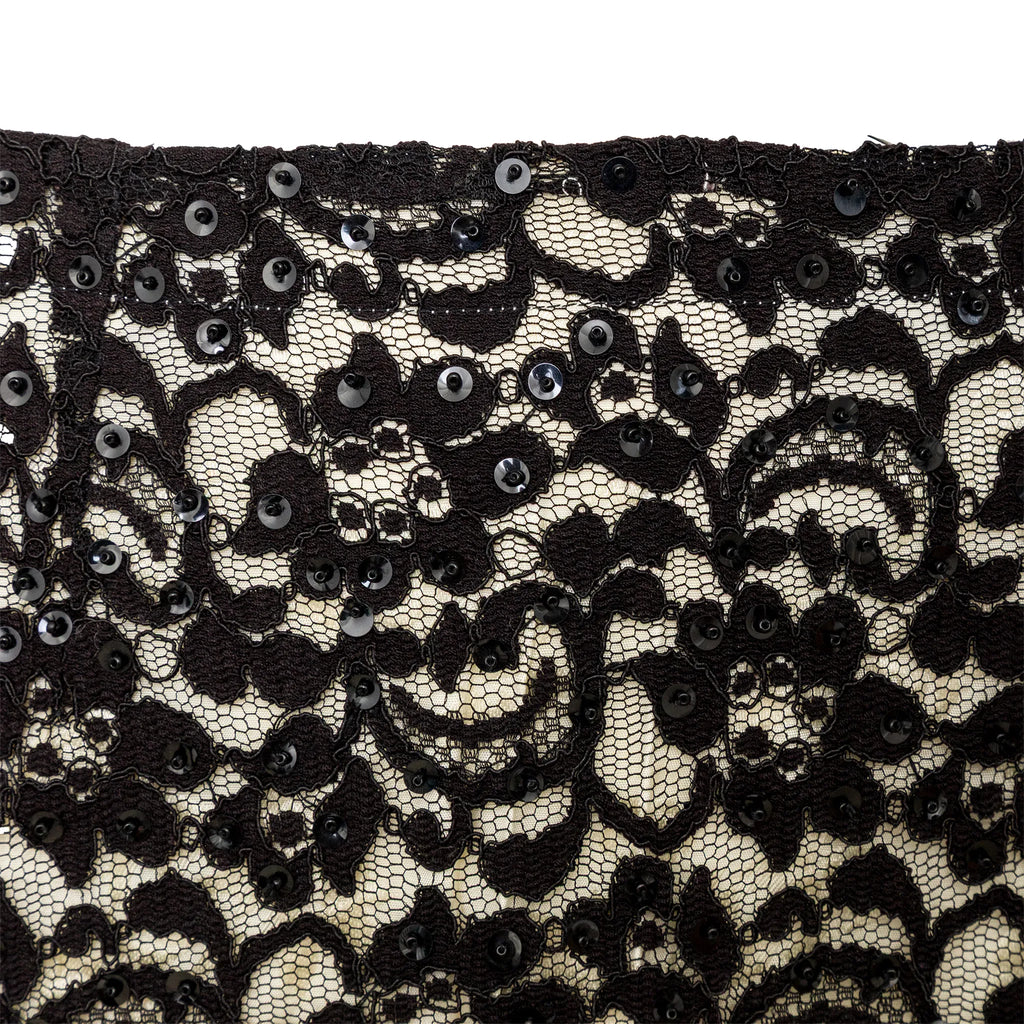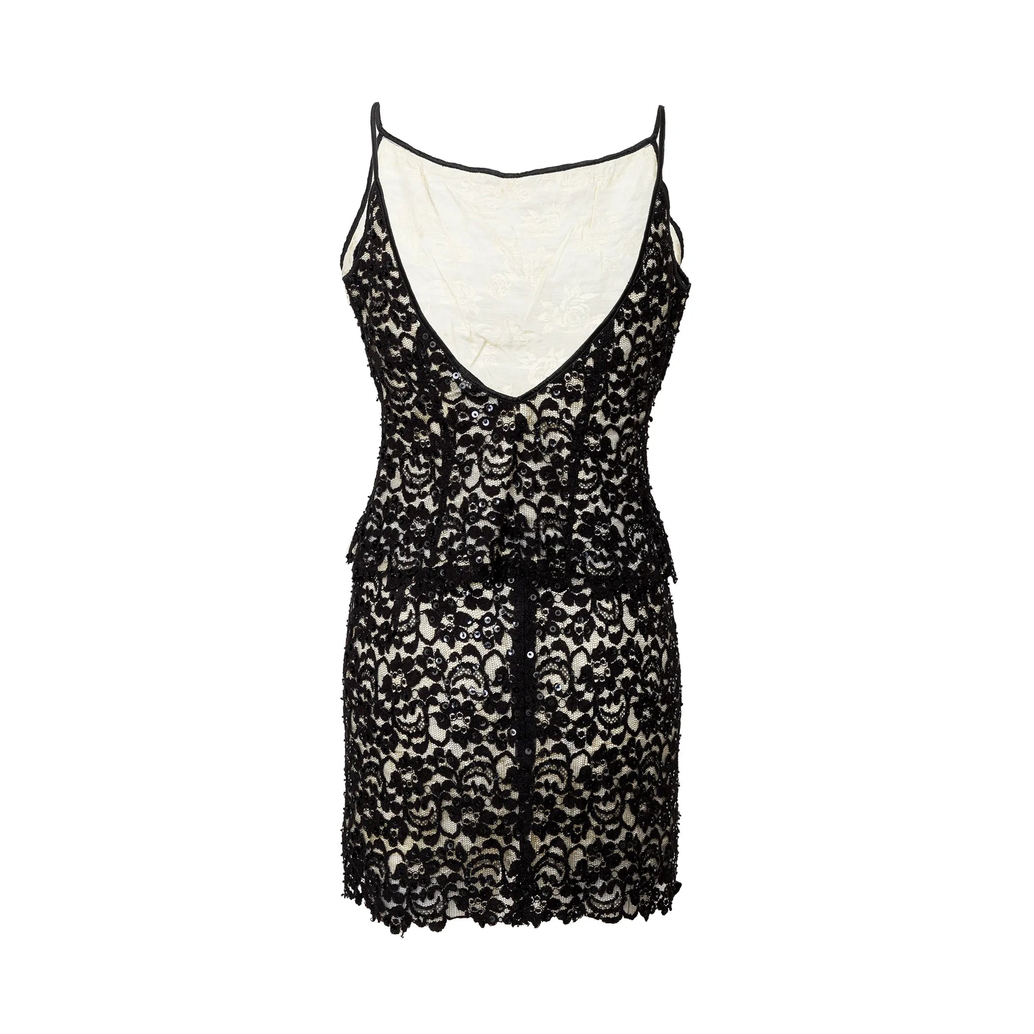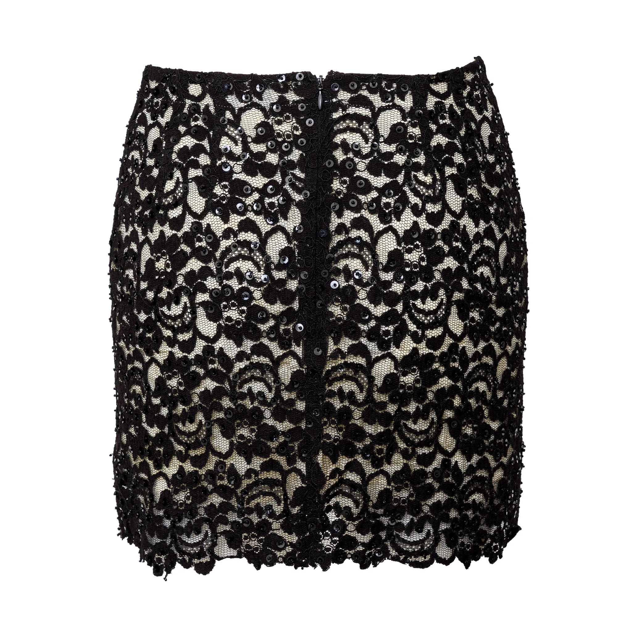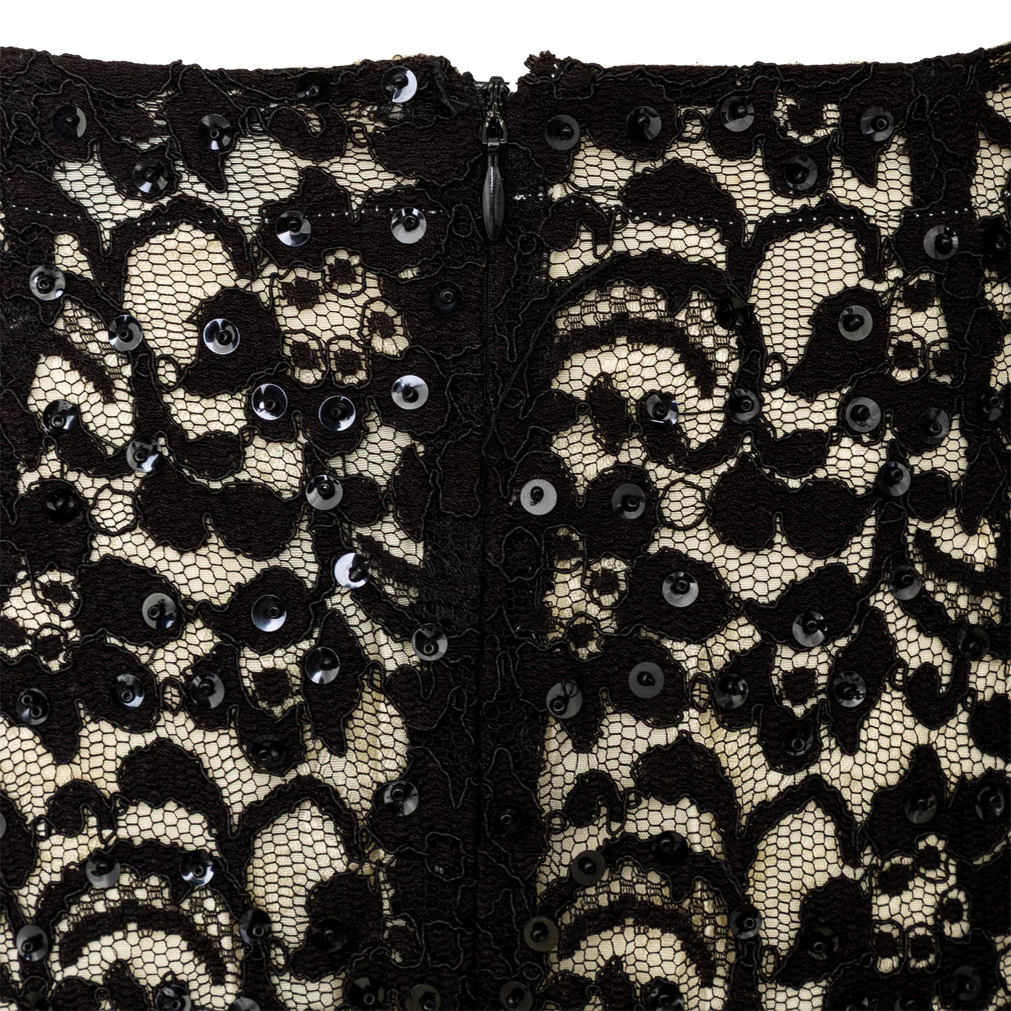 Chic lace sequin set made of viscose with jacquard lining. Camisole top with open back pairs perfectly with a mini skirt featuring a lace scallop hem.
