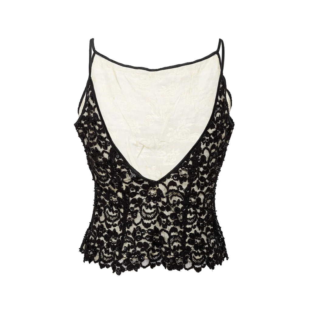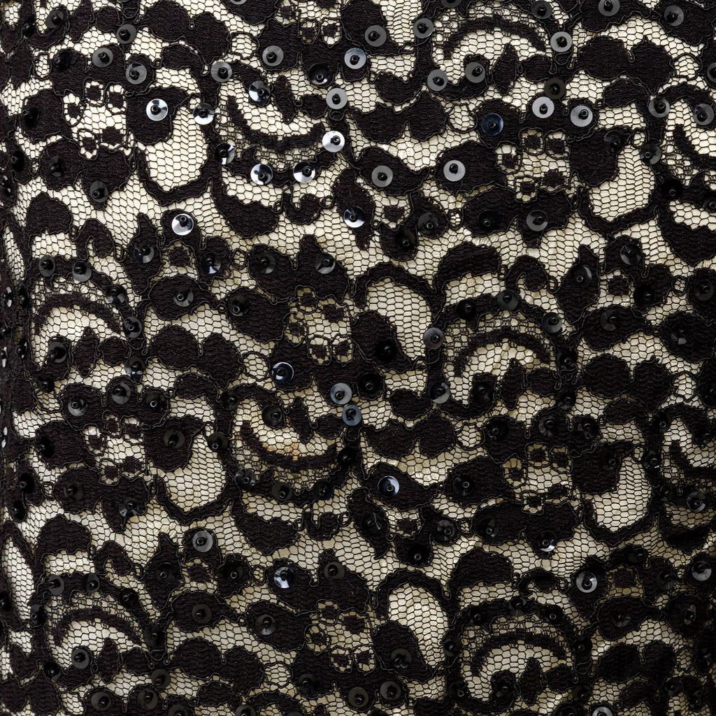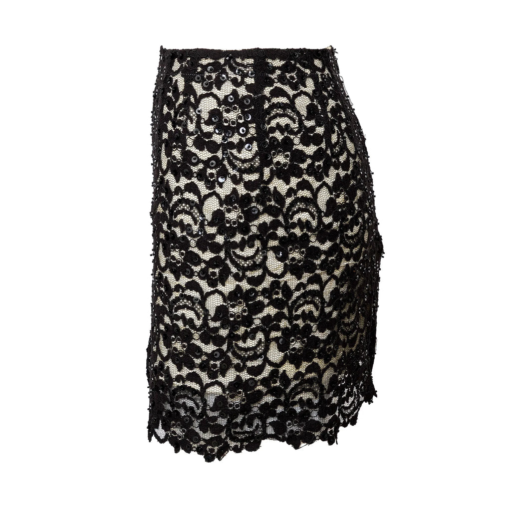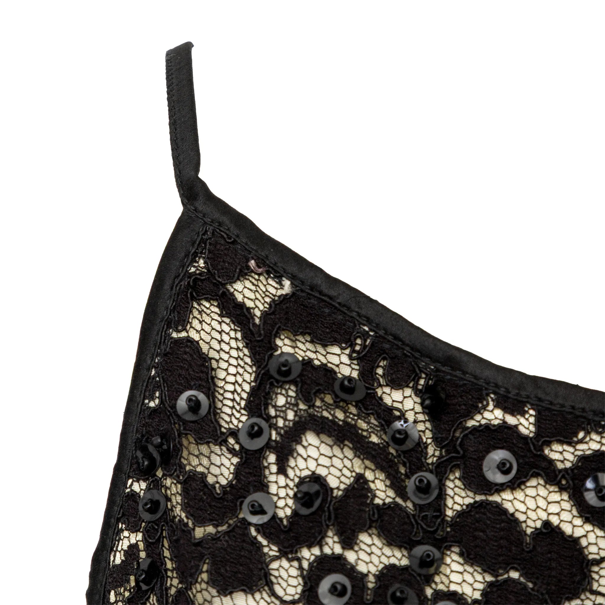Chic lace sequin set made of viscose with jacquard lining. Camisole top with open back pairs perfectly with a mini skirt featuring a lace scallop hem.