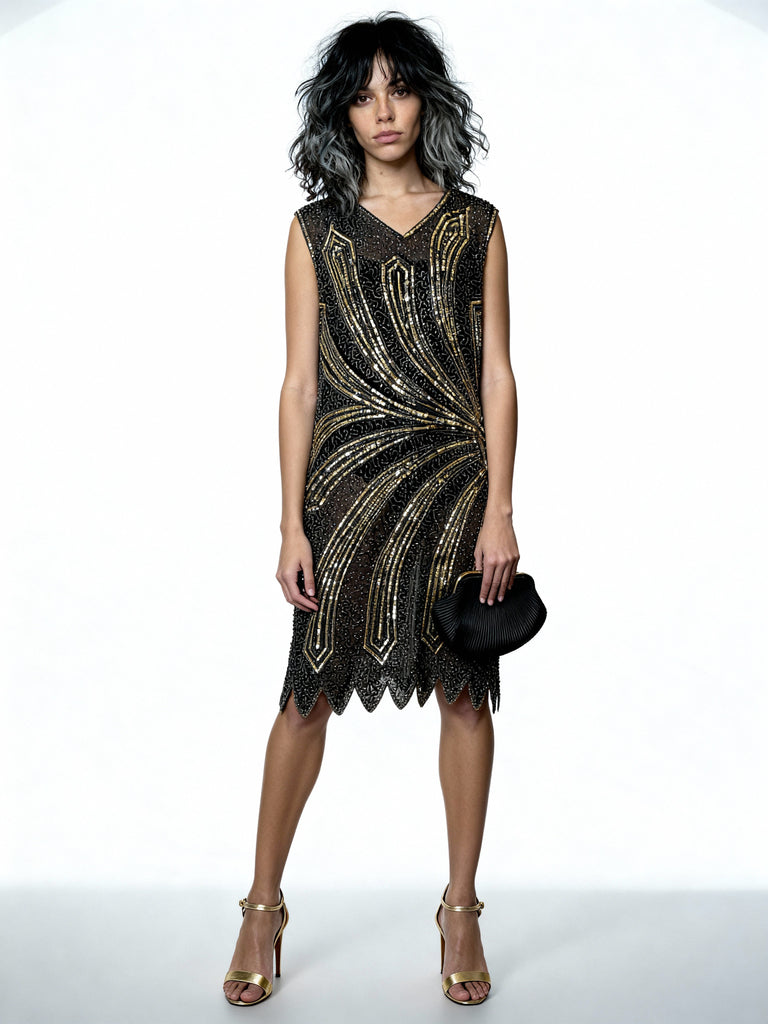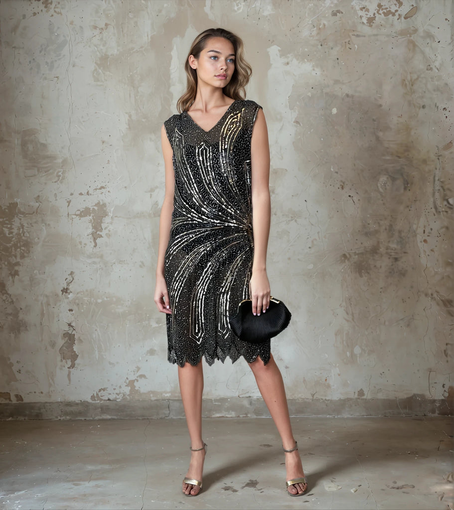 Vintage Black & Silver Sequin Flapper Dress Uk 10 - 12