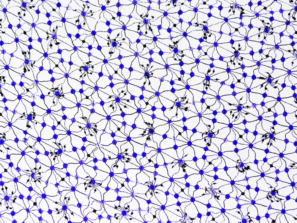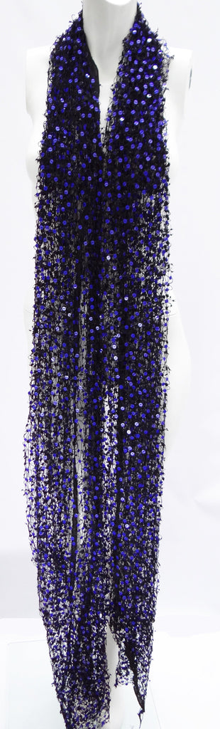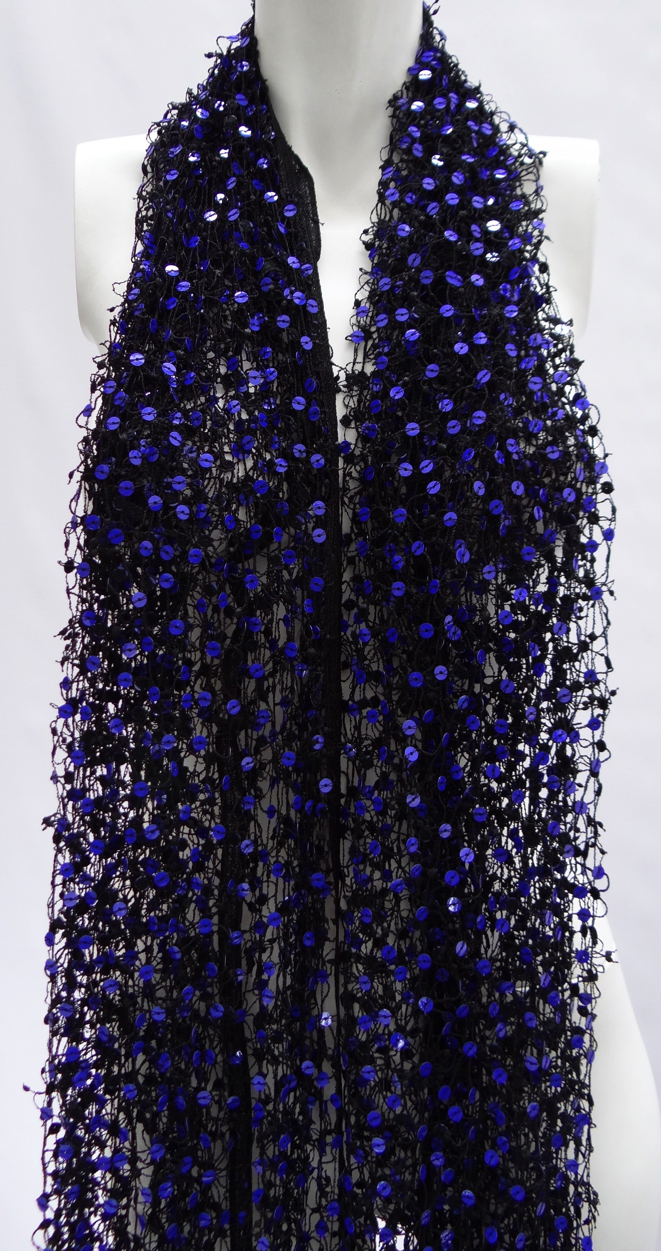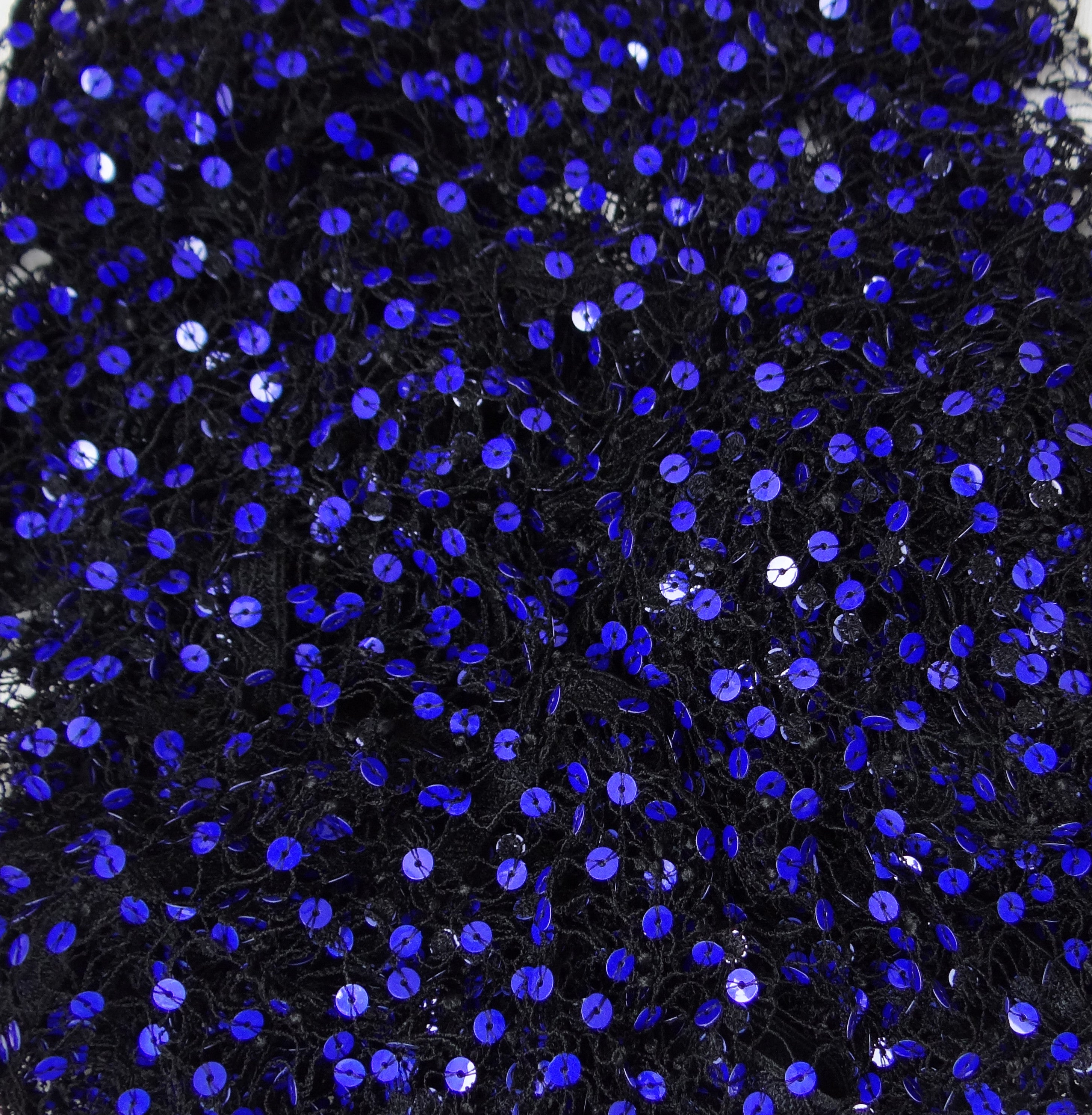 An exquisite length of black filigree fabric covered with tiny sapphire coloured sequins by Rifat Ozbek. With great potential to be fashioned into a truly dazzling, unique garment, it can also be worn as a glamorous evening shawl or veil.