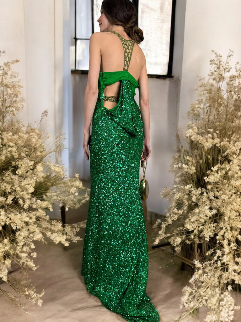 Clara, vintage green sequins dress with rhinestone collar and belt