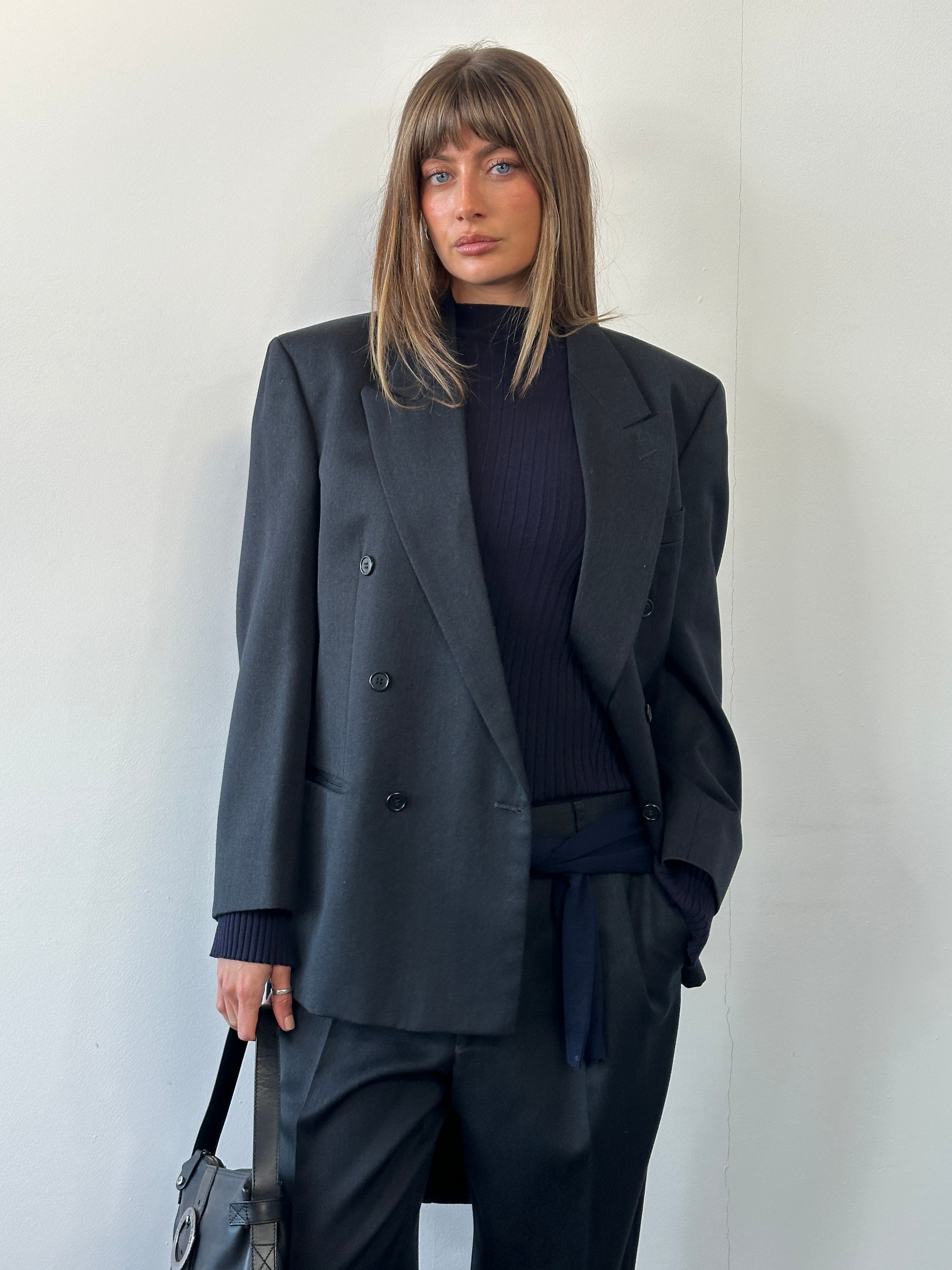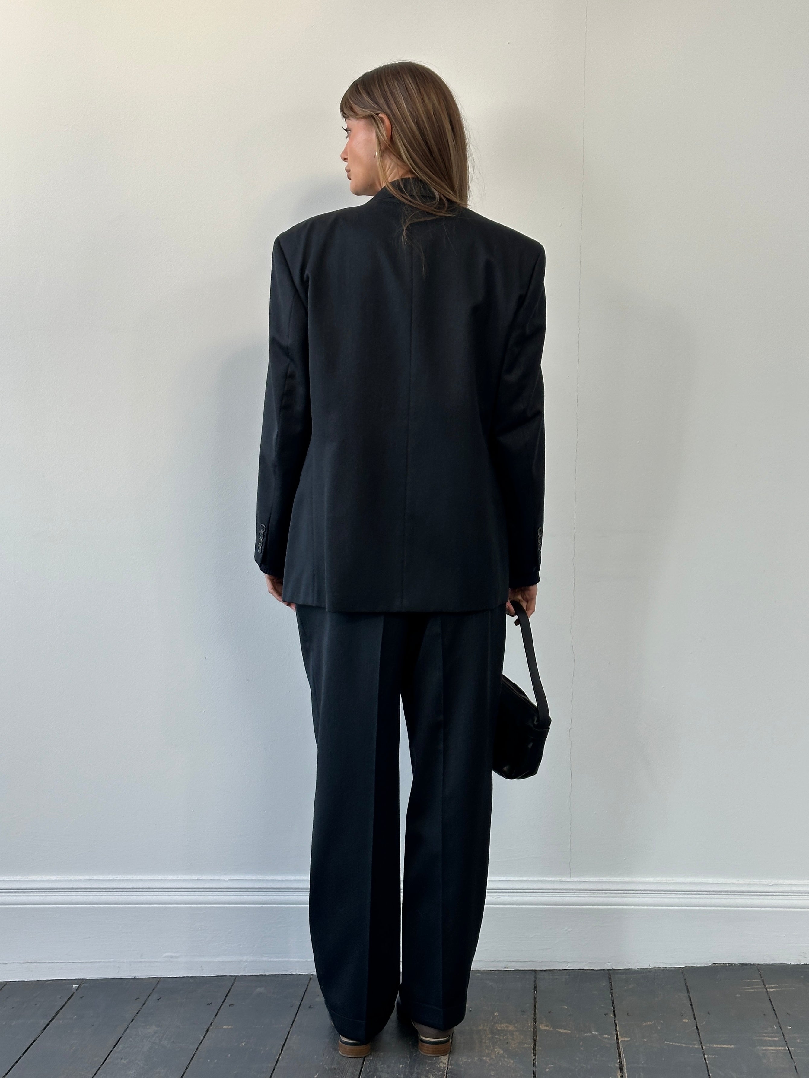 Vintage Pierre Cardin 1990s double-breasted suit in a deep grey pure wool with a soft drape and structured tailoring. The jacket features a peak lapel, monogram lining, and a classic double-breasted front. Trousers come pleated with turn-ups for a clean, traditional finish.