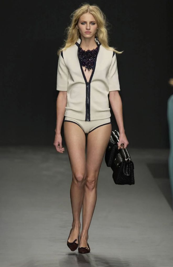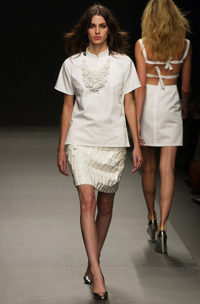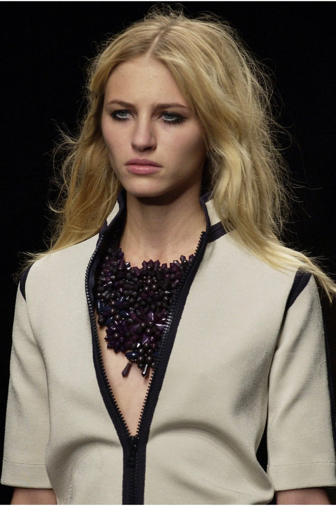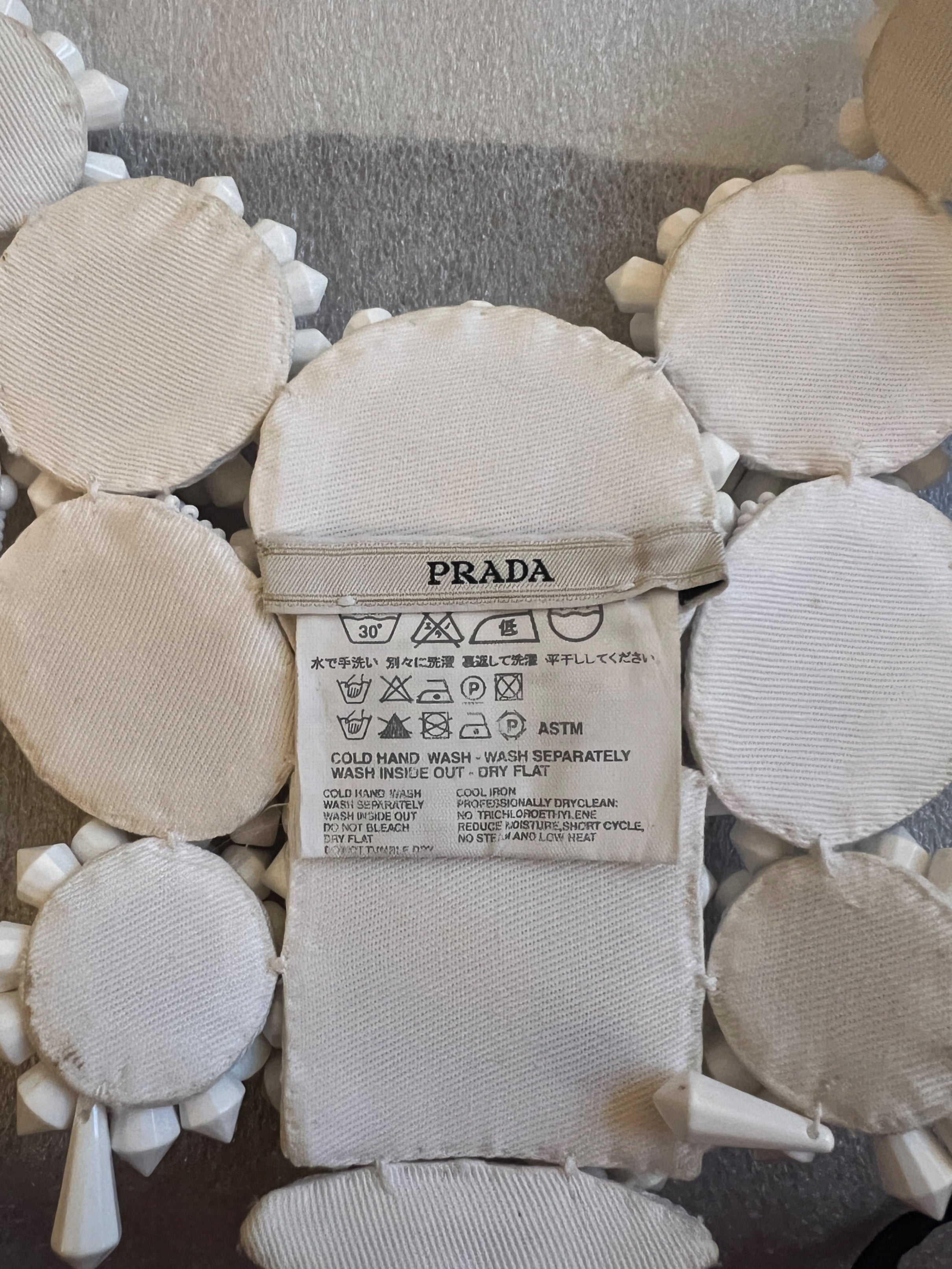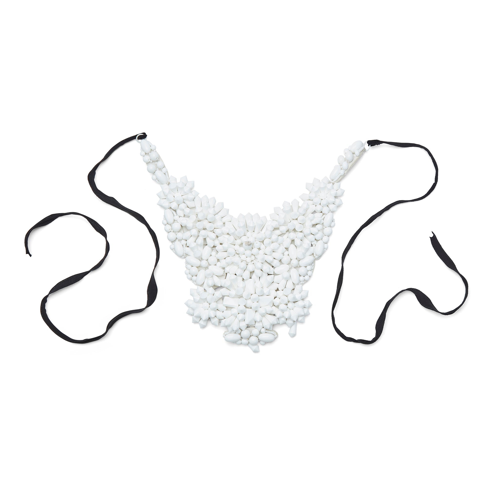 This runway documented necklace adorned the necks of multiple models walking in Prada’s Spring 2003 collection. Appearing in both black (look 22/40) and white (as look 10/44), this heavily beaded piece adds a futuristic glamour to the minimalist Prada tailoring. Highly textured, it is crafted from dozens of high-shine white plastic beads in spherical, oval, diamond and spinning top-esque shapes. These beads are sewn onto white grosgrain-covered, stiffened circles which form a curved bib shape. Attached to the bib with white plastic rings, black ribbon allows this piece to be secured around the neck. The back is detailed with the iconic white-on-cream woven Prada label and a care label.