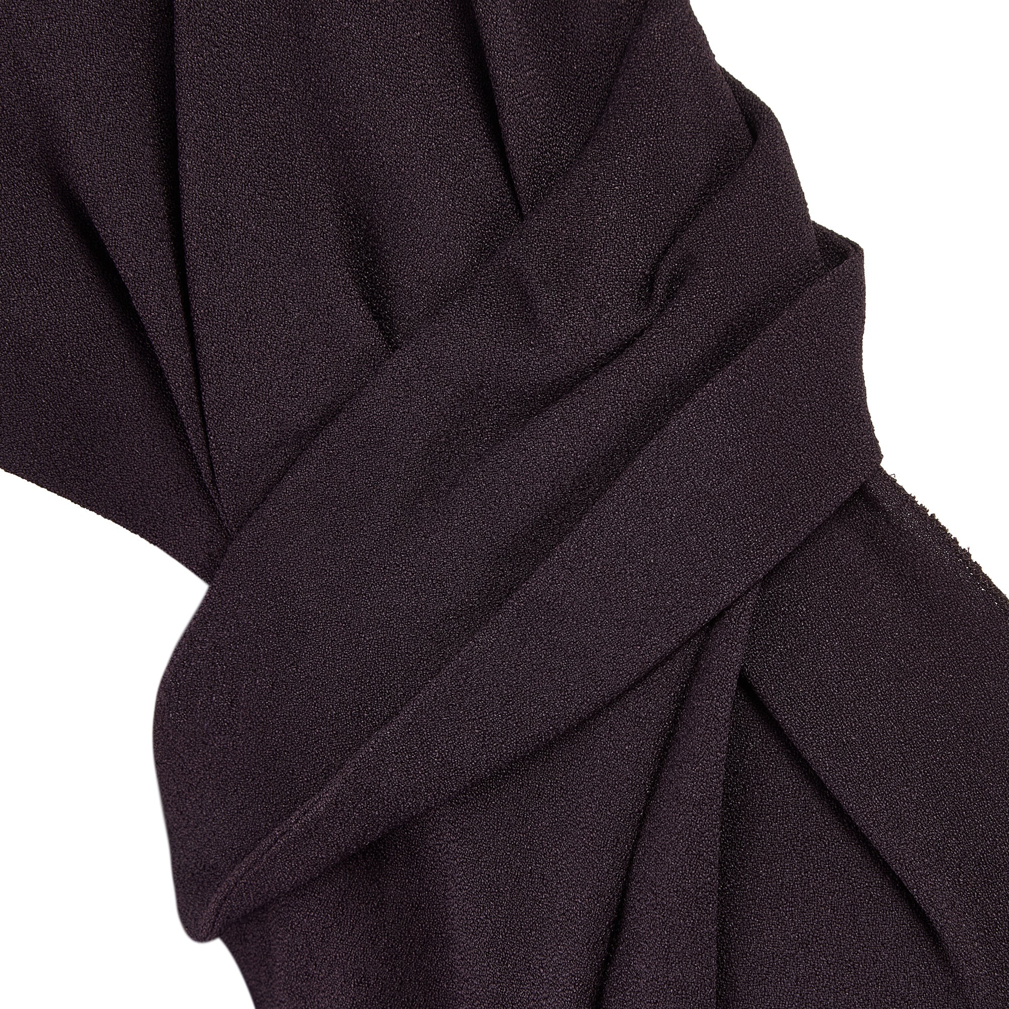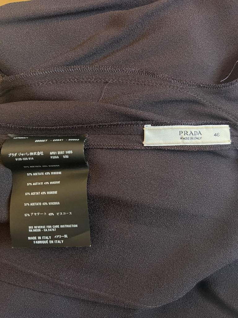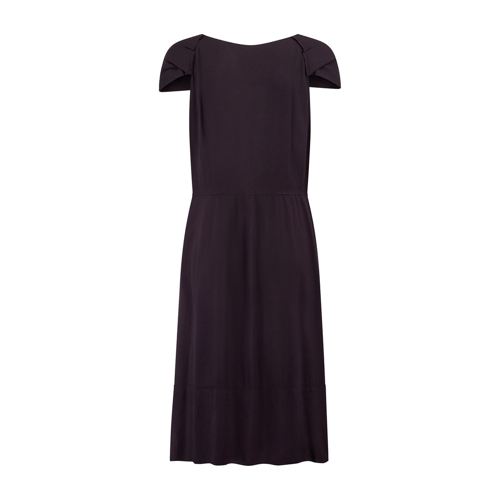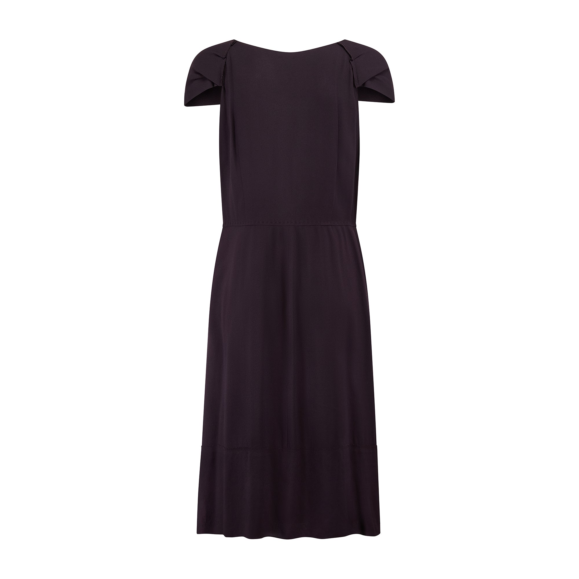 This elegant Prada gown displays all the elevated, feminine trademarks that have become a part of Miuccia Prada’s signature style. Designed in 2007, it is tailored from smooth crepe in a rich, deep plum colourway. Tailored to a 1940s tea-dress shape, the cloth has a fantastic drape and flatteringly skims the curves of the body. It has short-sleeves and a decollétage-revealing V-neckline. The waist is lightly tailored and the skirt falls to the mid-calf with several soft pleats adding movement. At the side of the bust, plum crepe wraps around the edge of the sleeves - a detail typical of the Italian brand’s grown-up take on pretty. This dress is unlined.