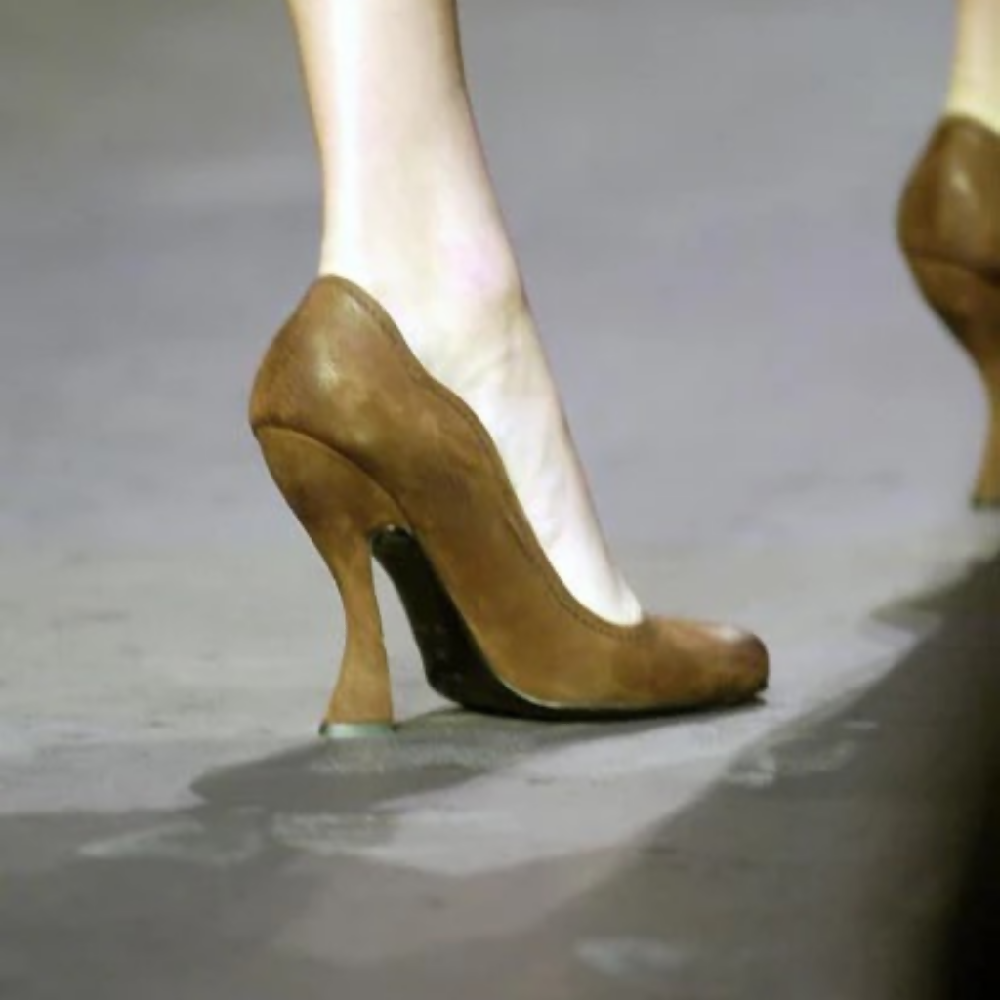 These leather pumps are certainly a treat for those that wear them. The FW 2004 collection presented several shoes with such a silhouette, taking from the fifties and combining this with eighteenth century romanticism. In fact, this silhouette with the heel curved inwards became so beloved by Miuccia, that it kept reappearing in later collections.