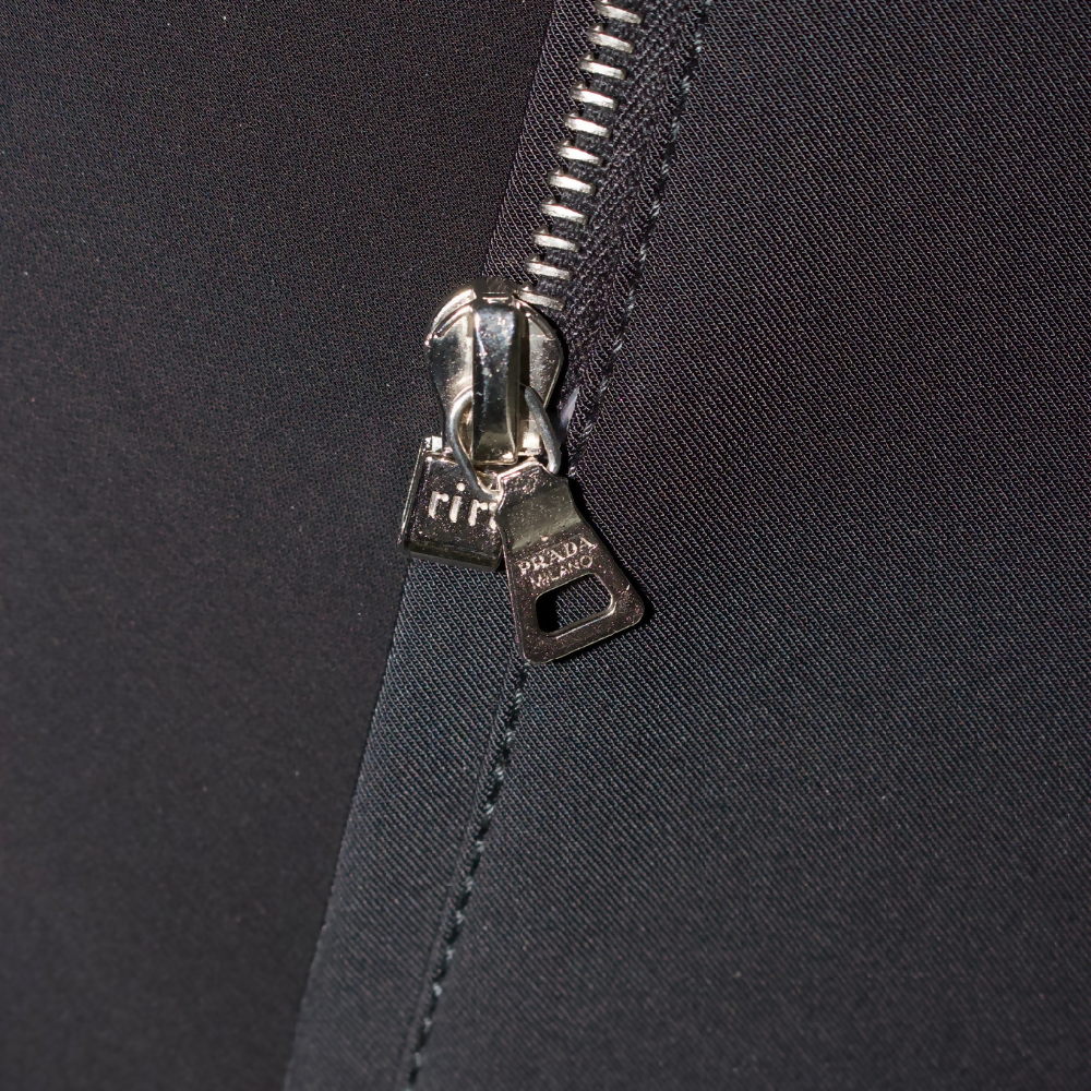 Stretchy polyester fabric with a zipper running down the middle and a belted waist.