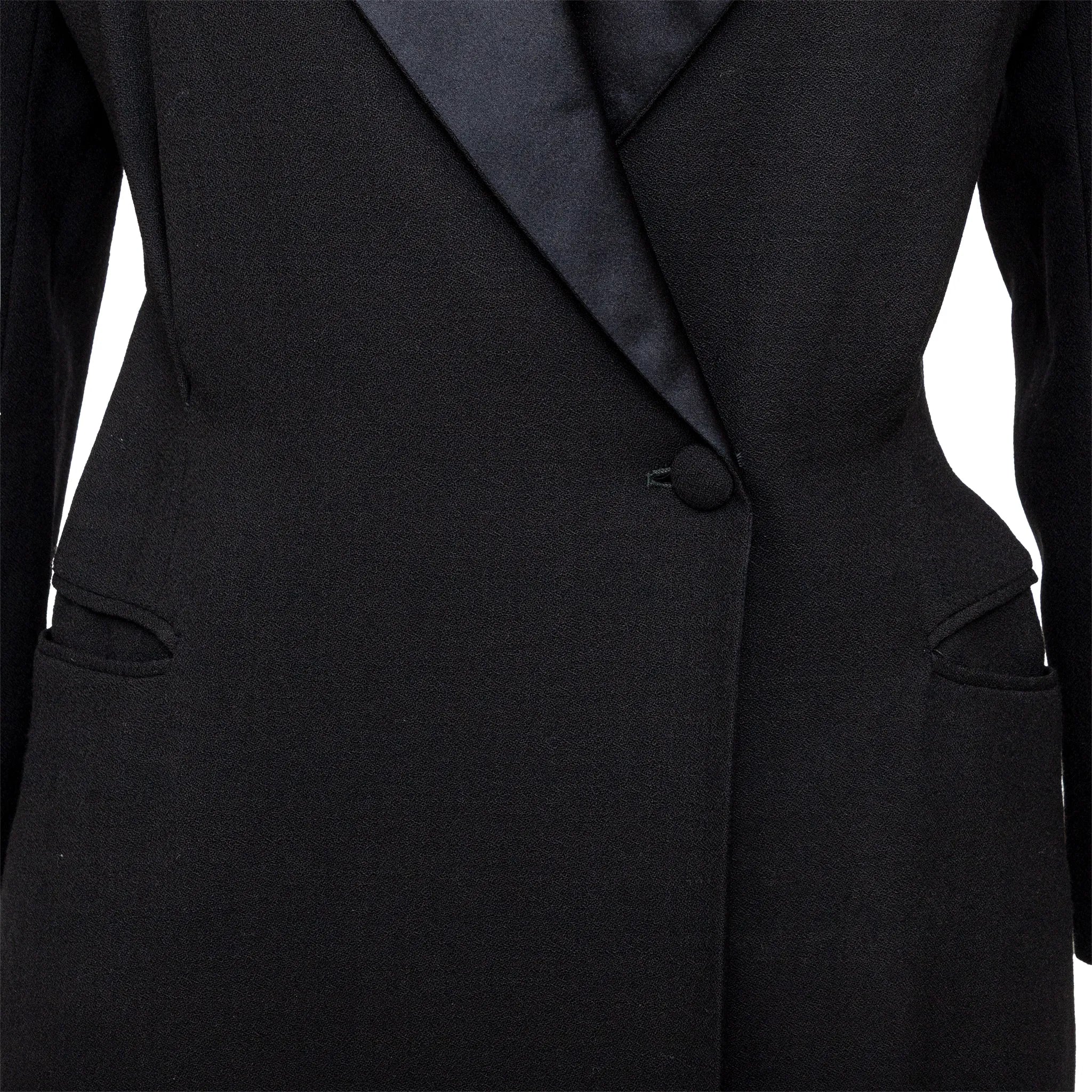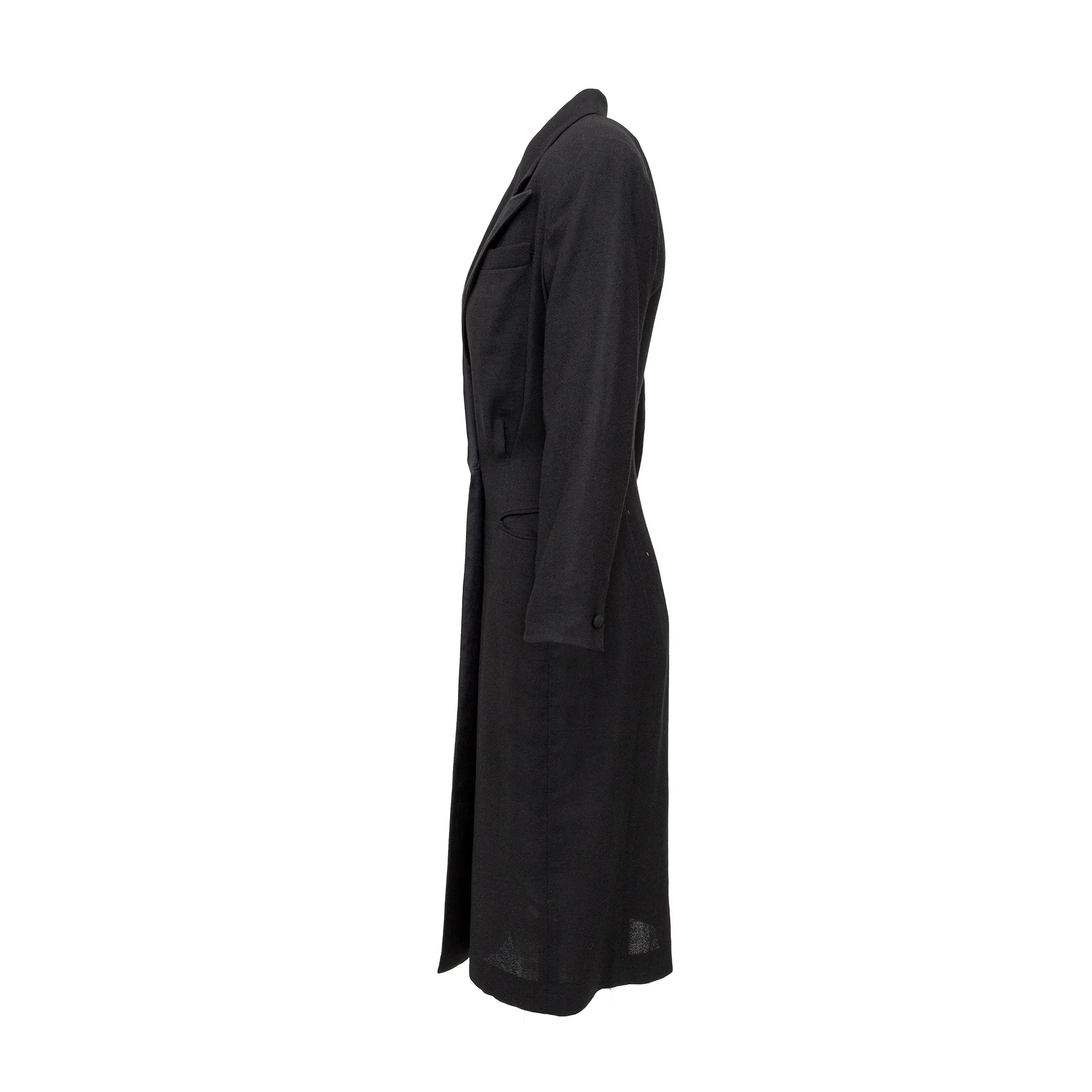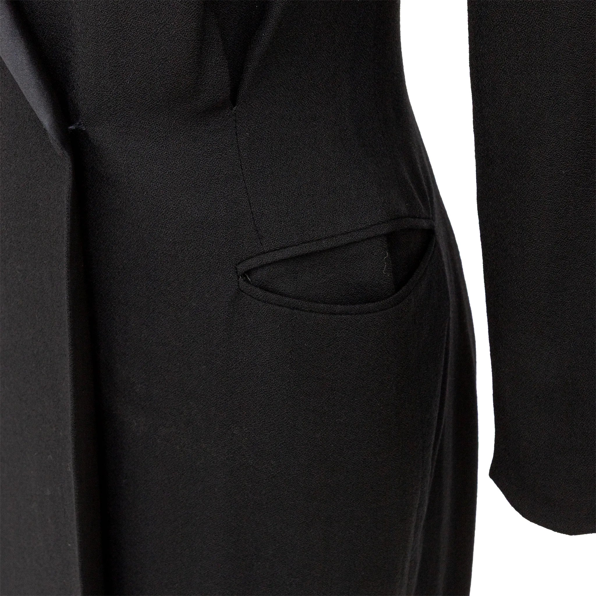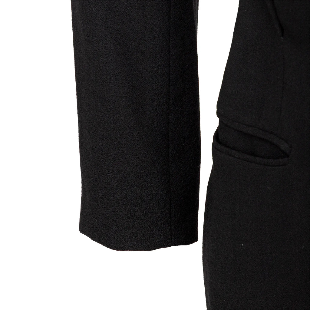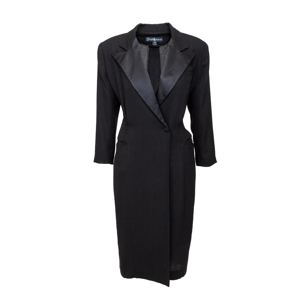 Midi length dress in black wool features satin lapel collars, one-button closure, front pockets, and structured shoulders for a sleek, tailored look.