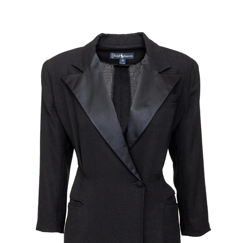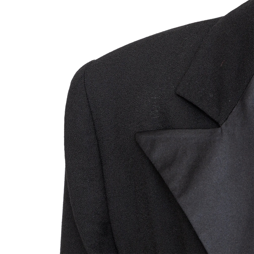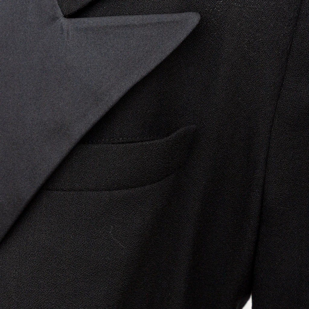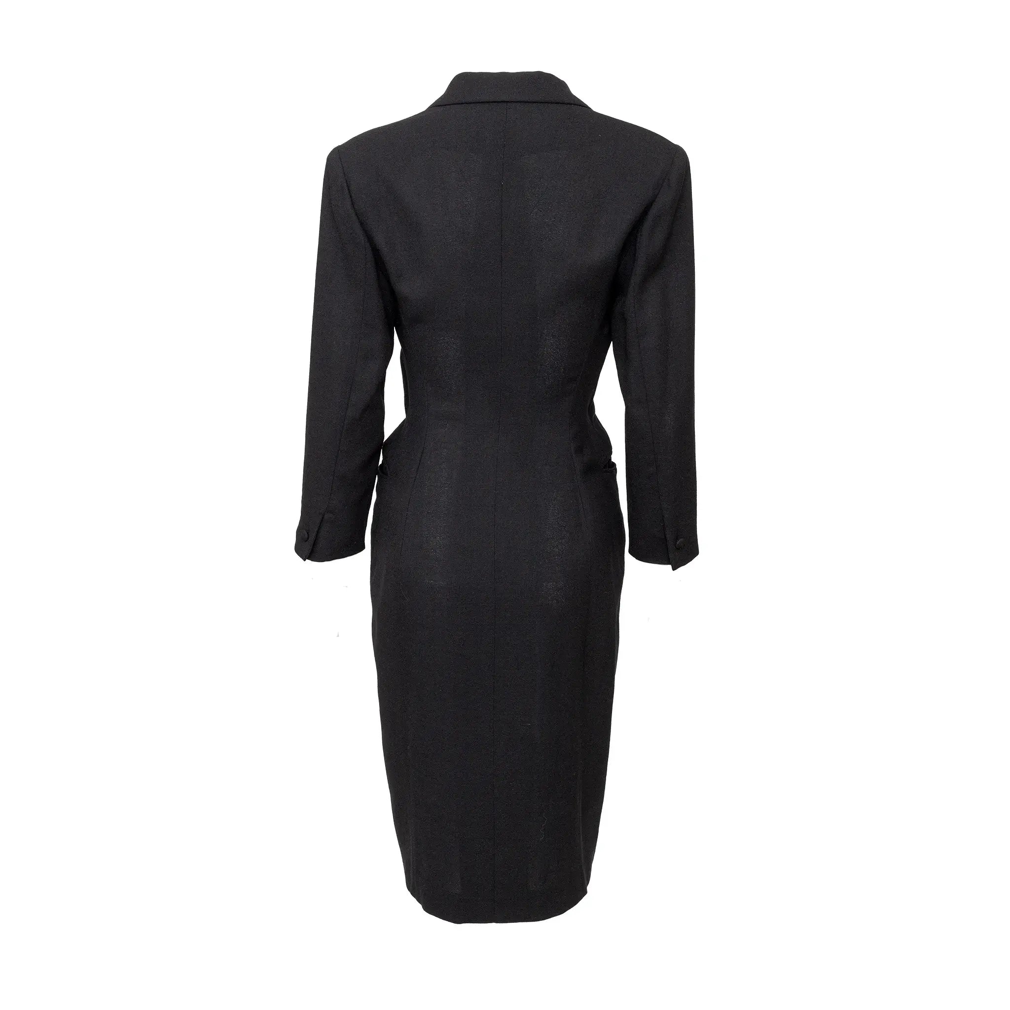 Midi length dress in black wool features satin lapel collars, one-button closure, front pockets, and structured shoulders for a sleek, tailored look.
