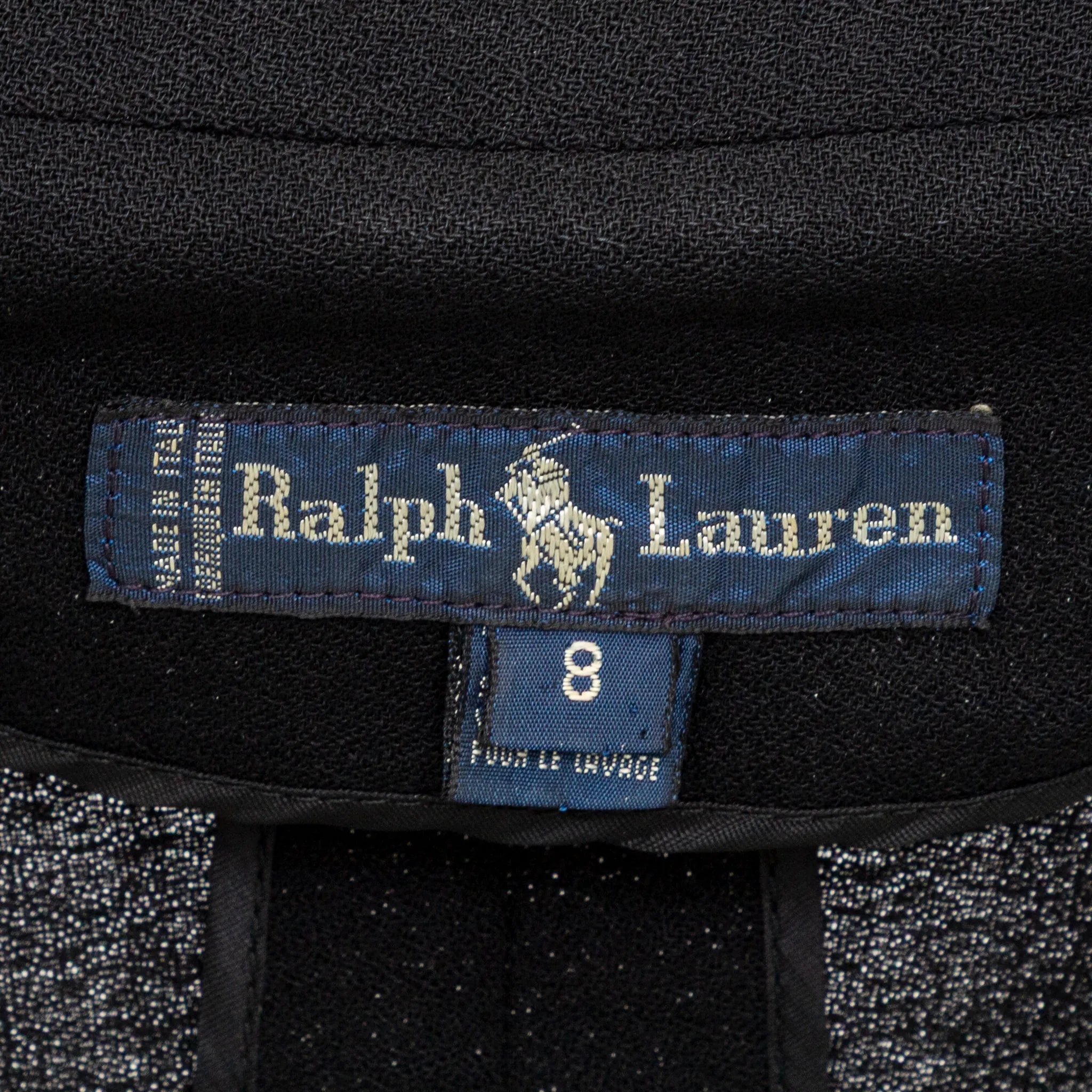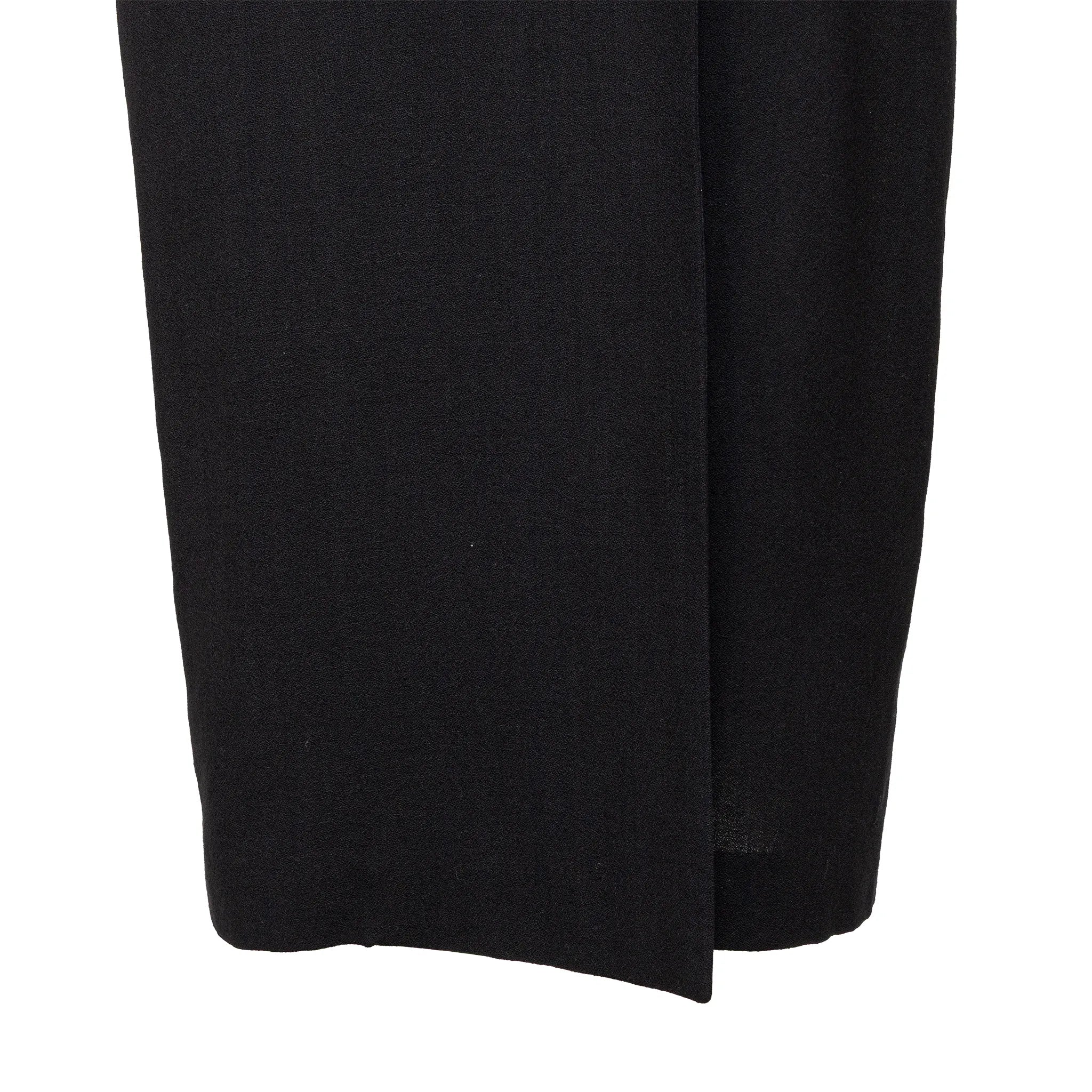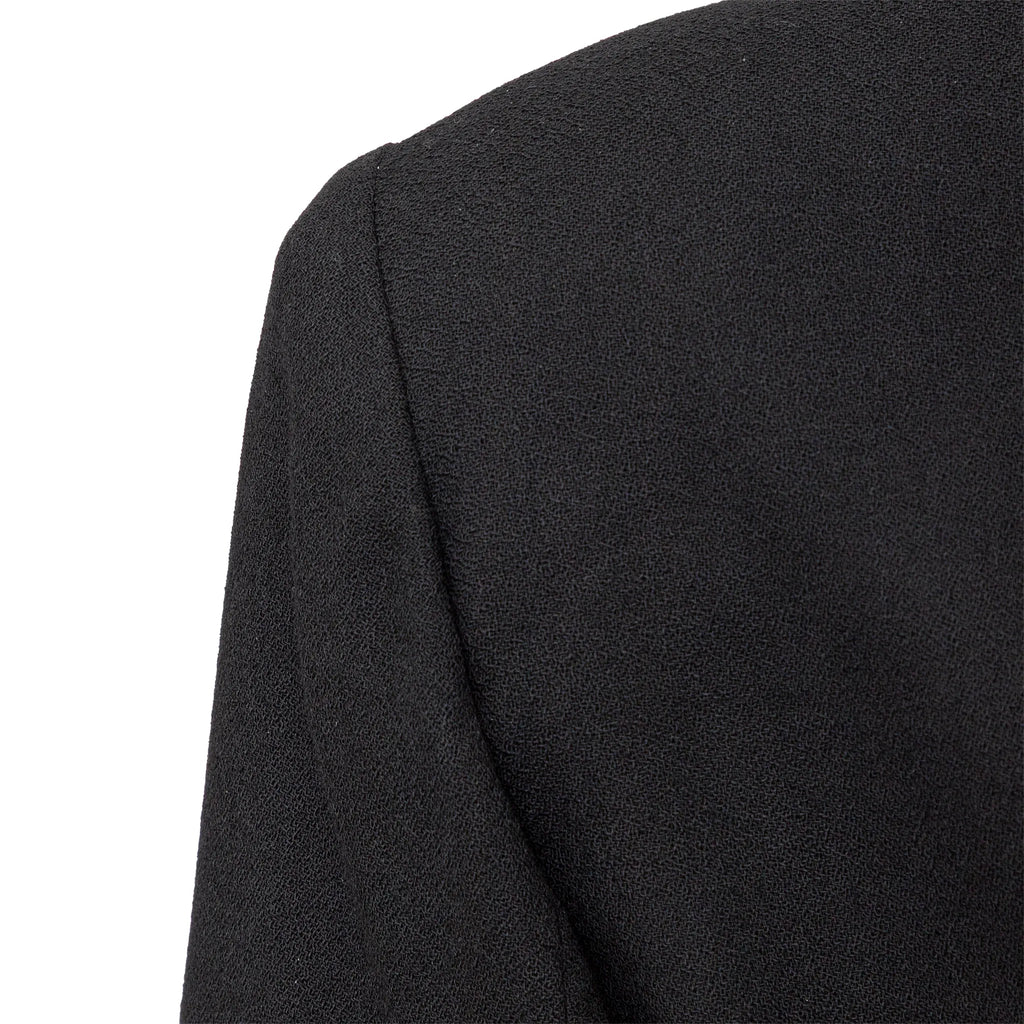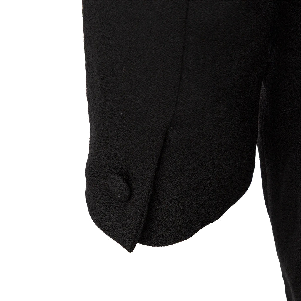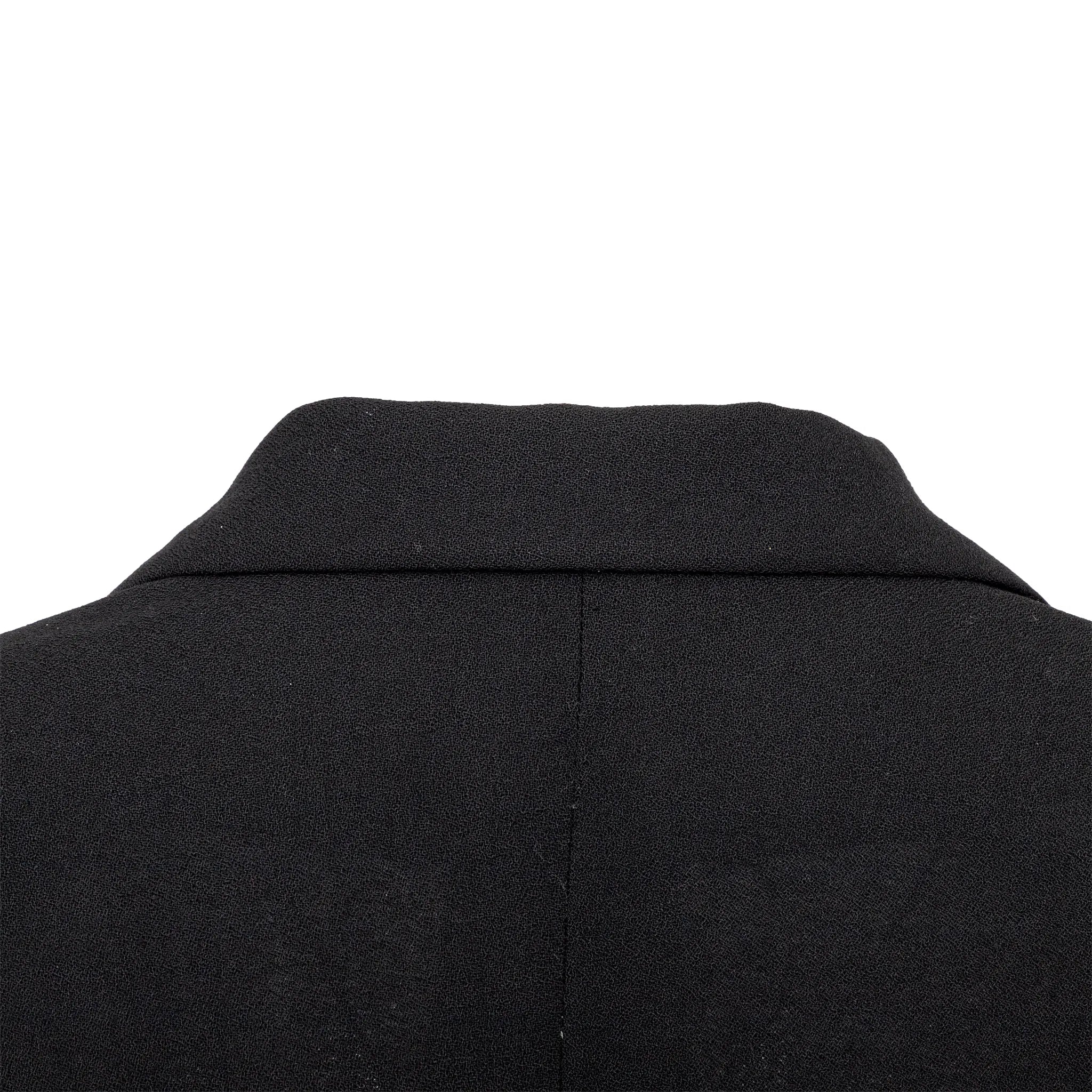 Midi length dress in black wool features satin lapel collars, one-button closure, front pockets, and structured shoulders for a sleek, tailored look.