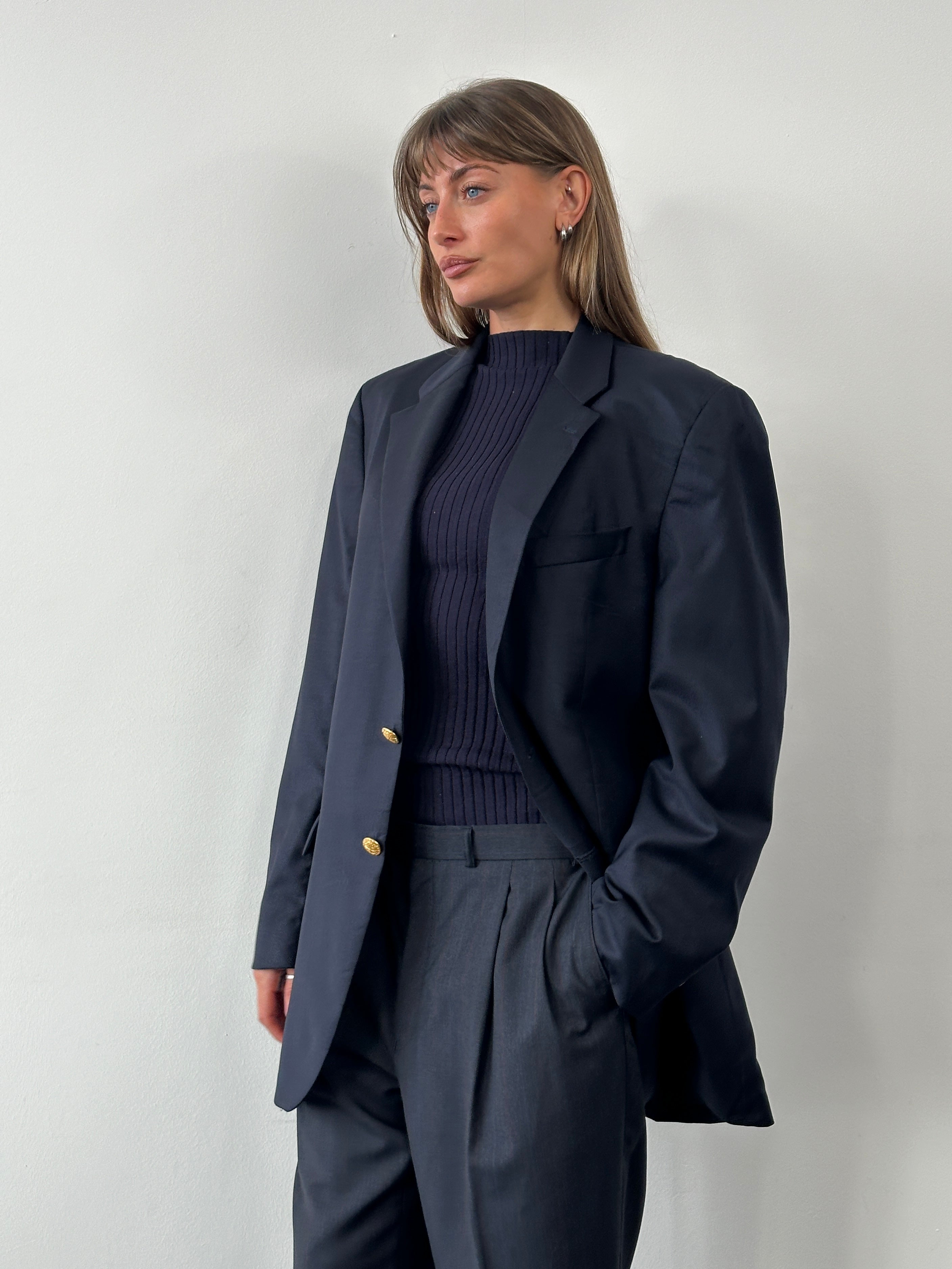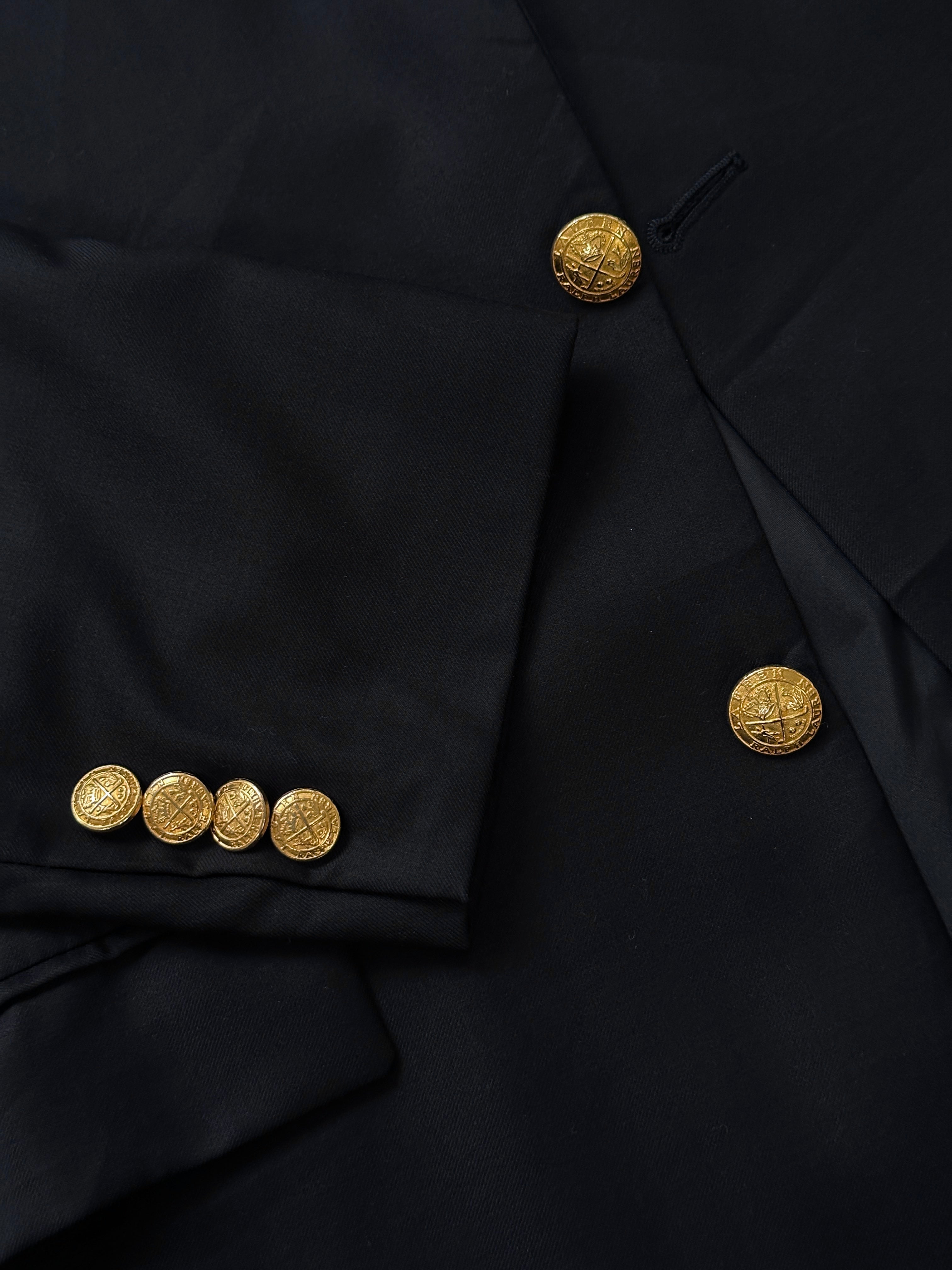 Lauren Ralph Lauren single breasted blazer featuring branded gold tone bespoke logo buttons and a clean tailored front. Structured silhouette typical of the 1990s.