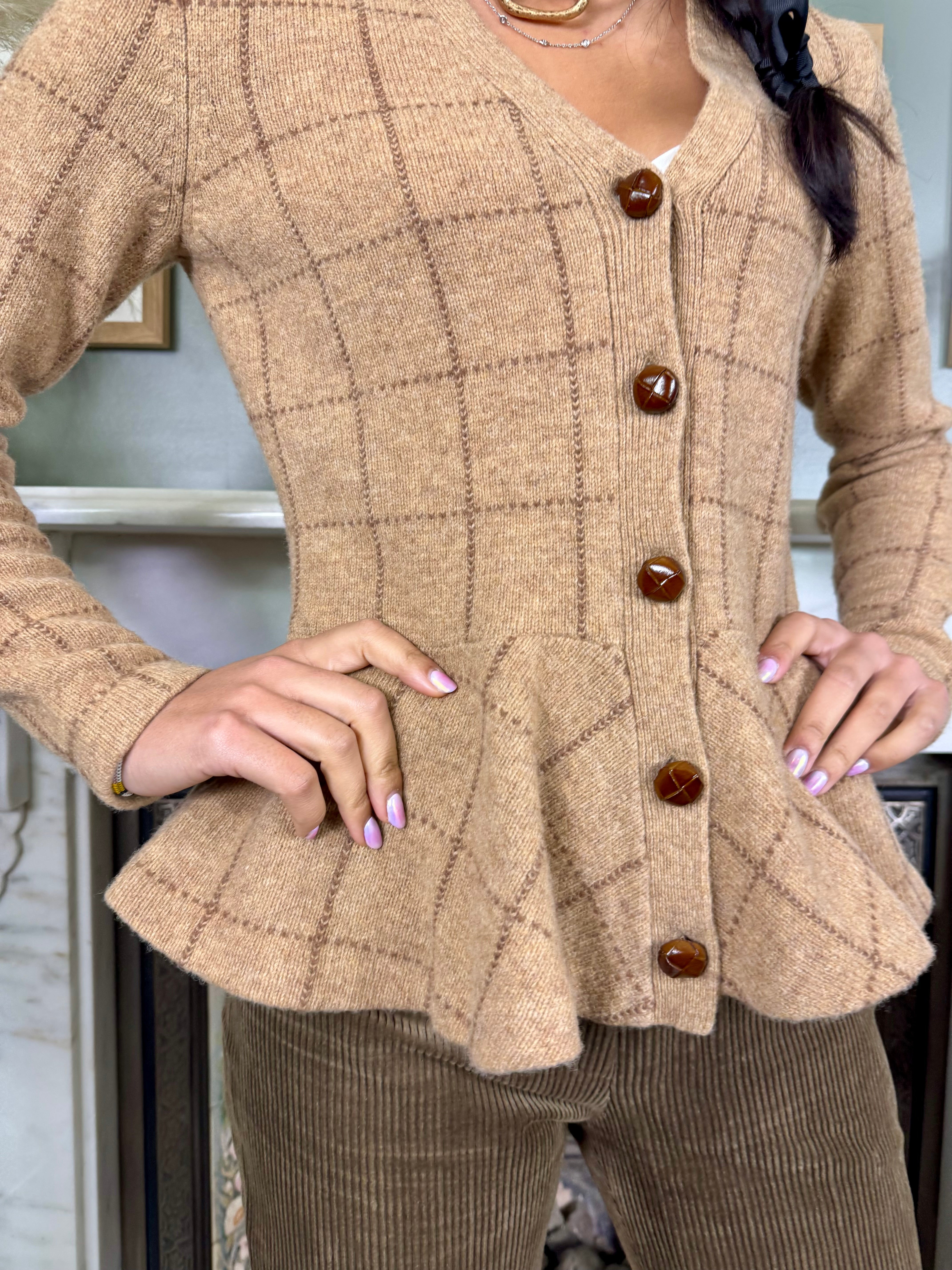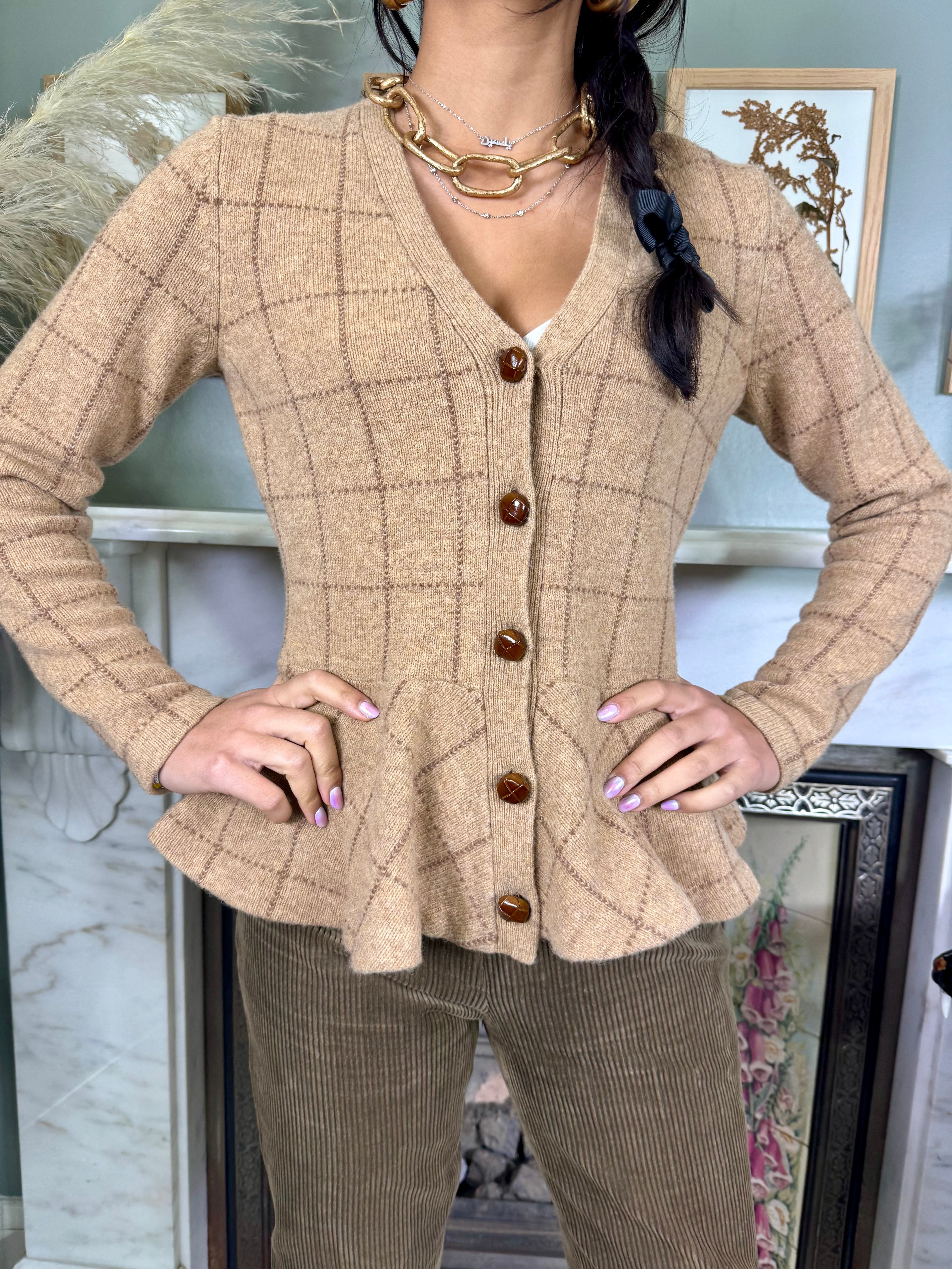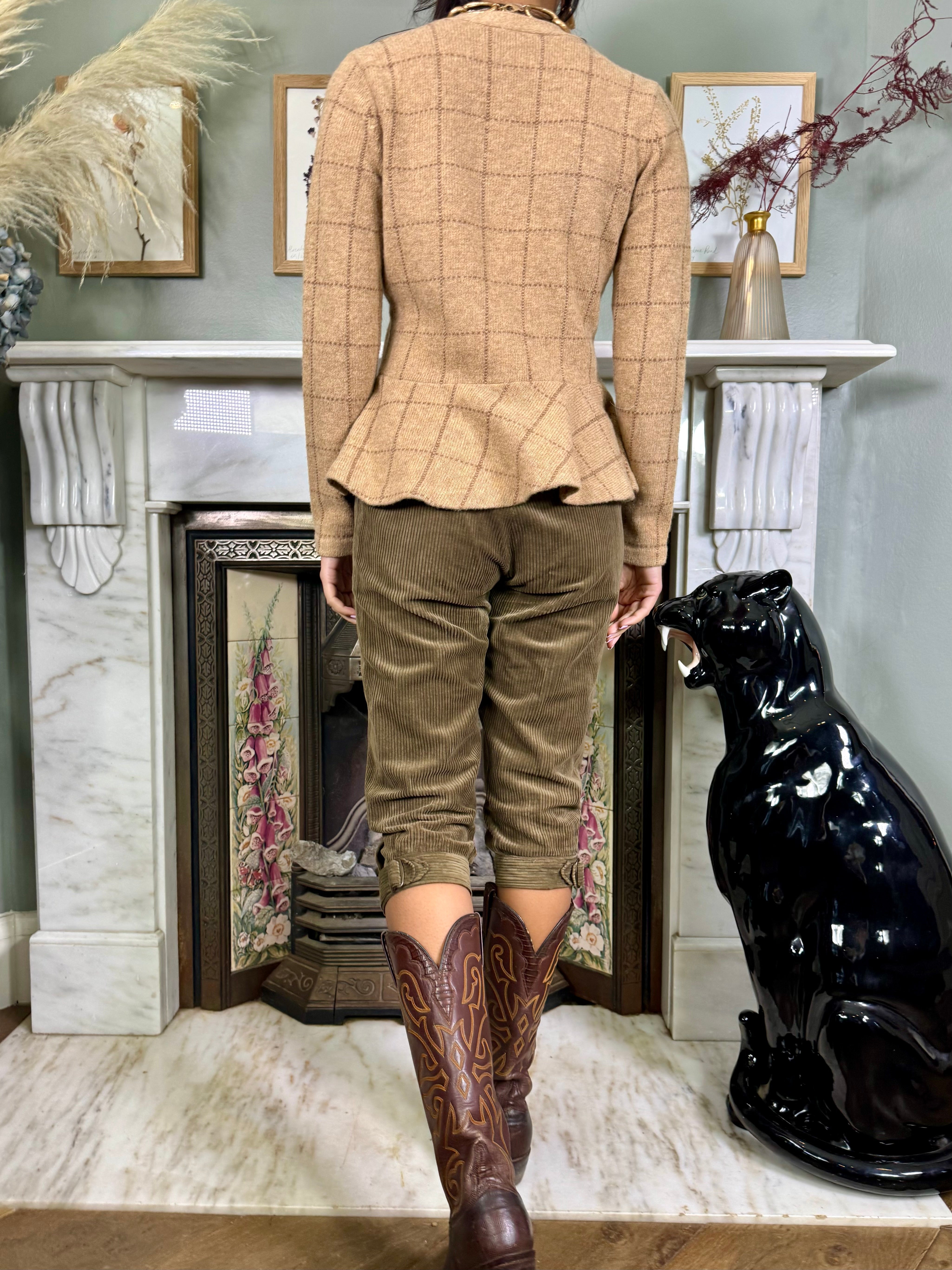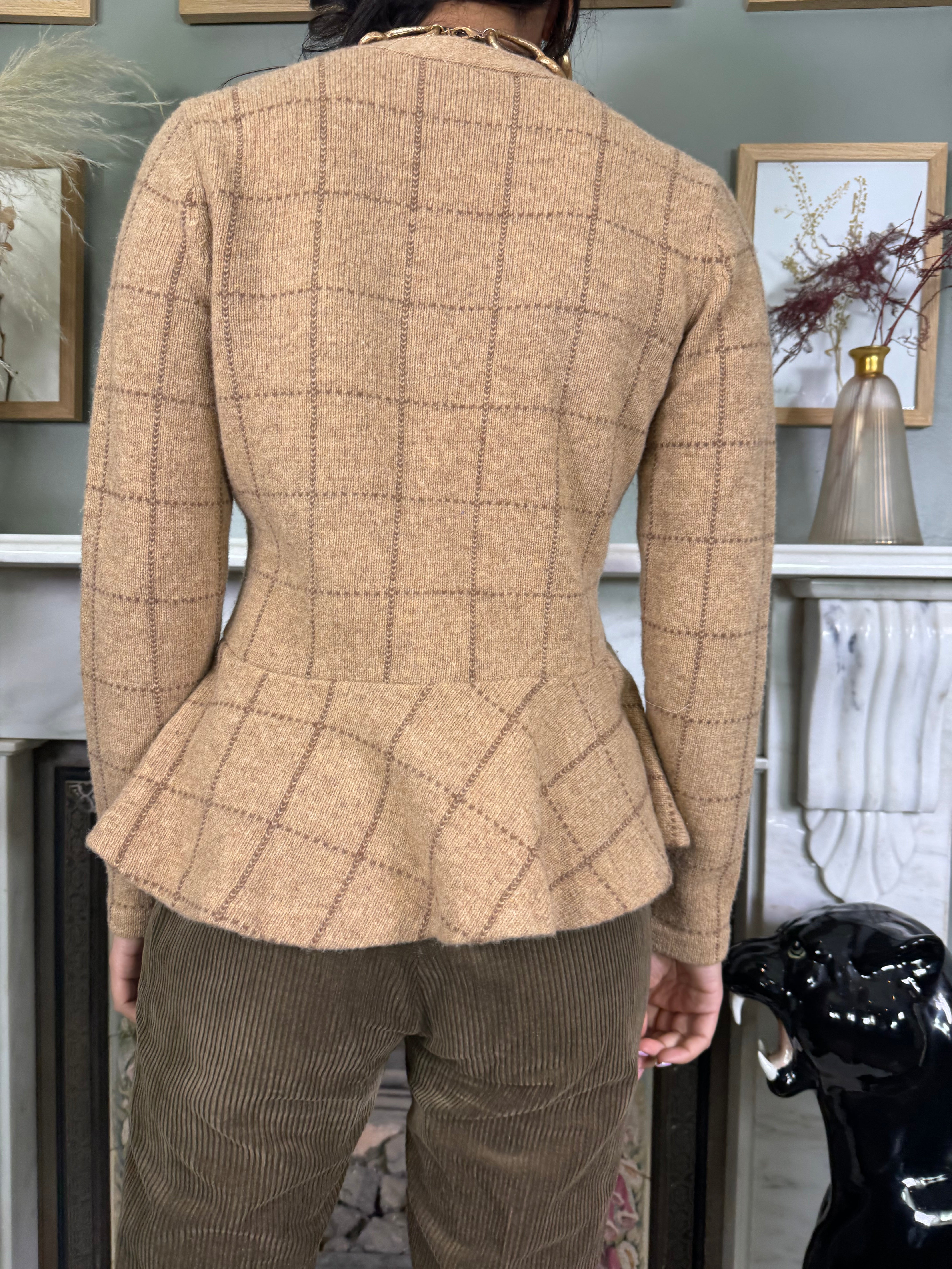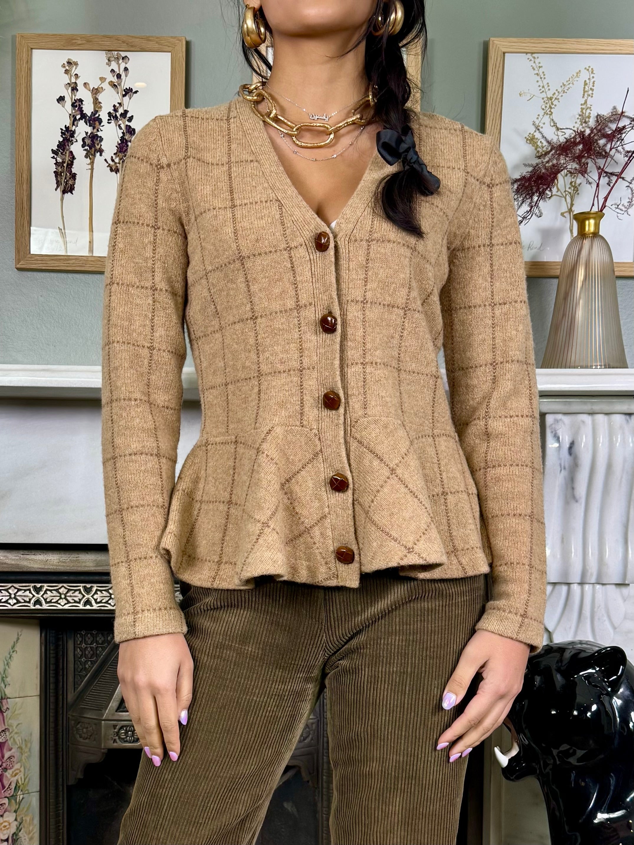Gorgeous and soft vintage Ralph Lauren checked camel cardigan in wool. Has long sleeves, a front V neckline and a peplum silhouette. Has front leather woven buttons and looks fab belted too. In excellent condition.