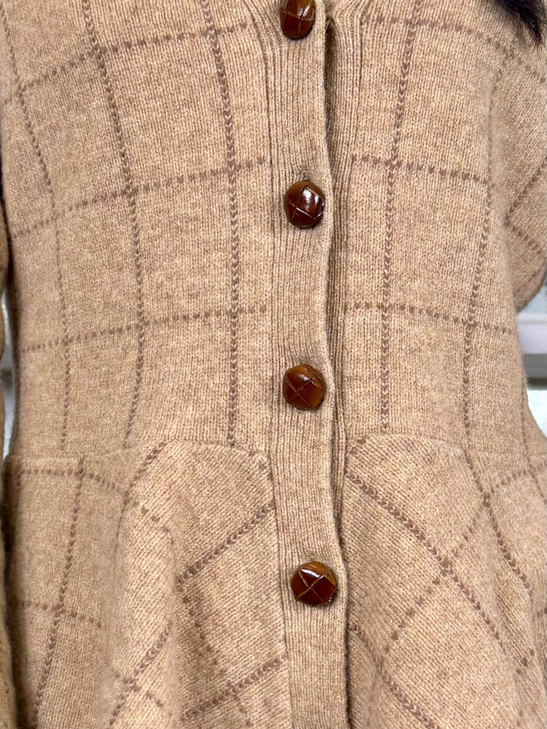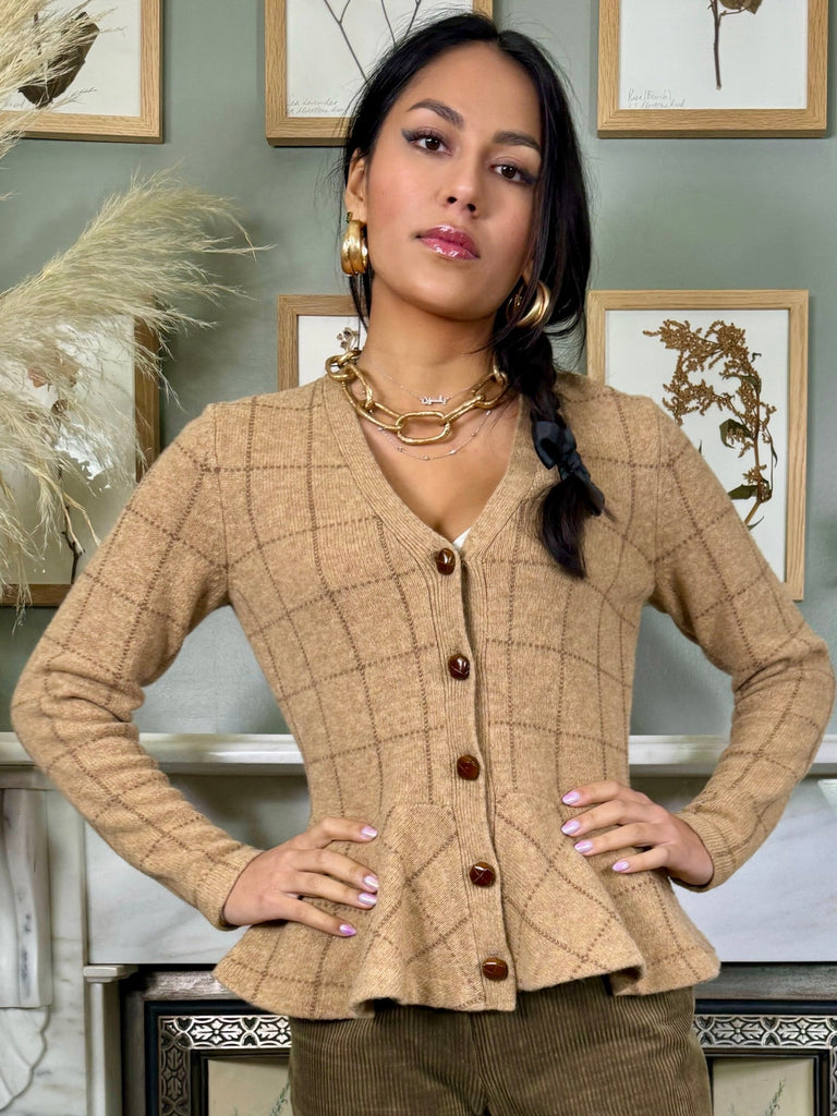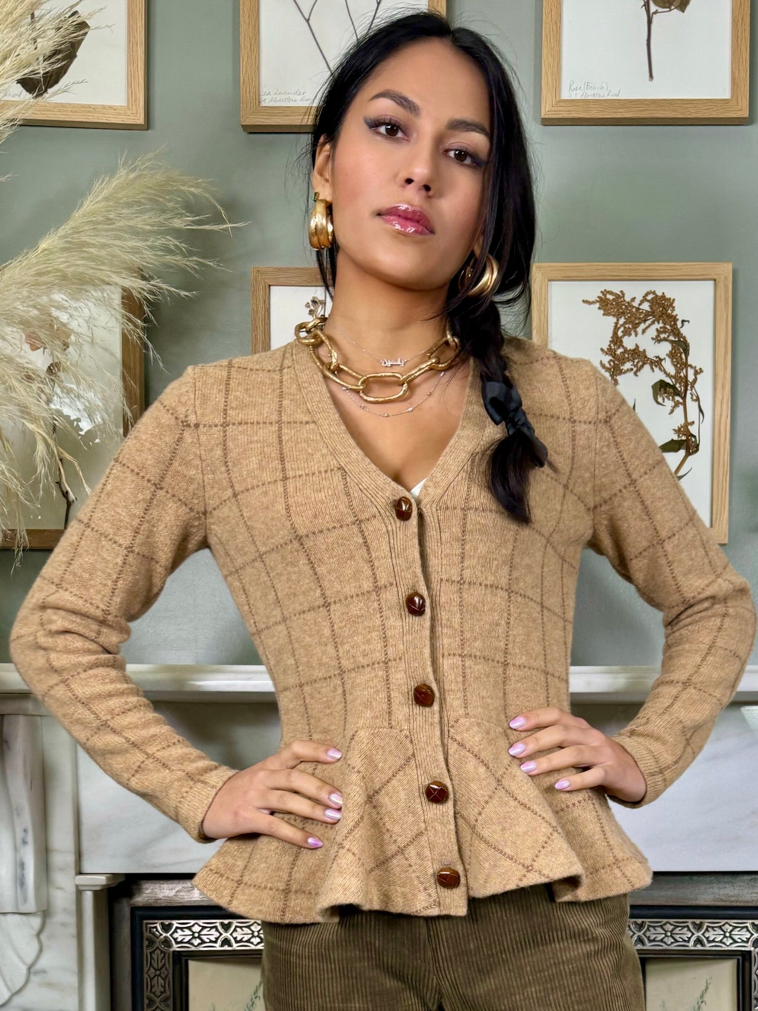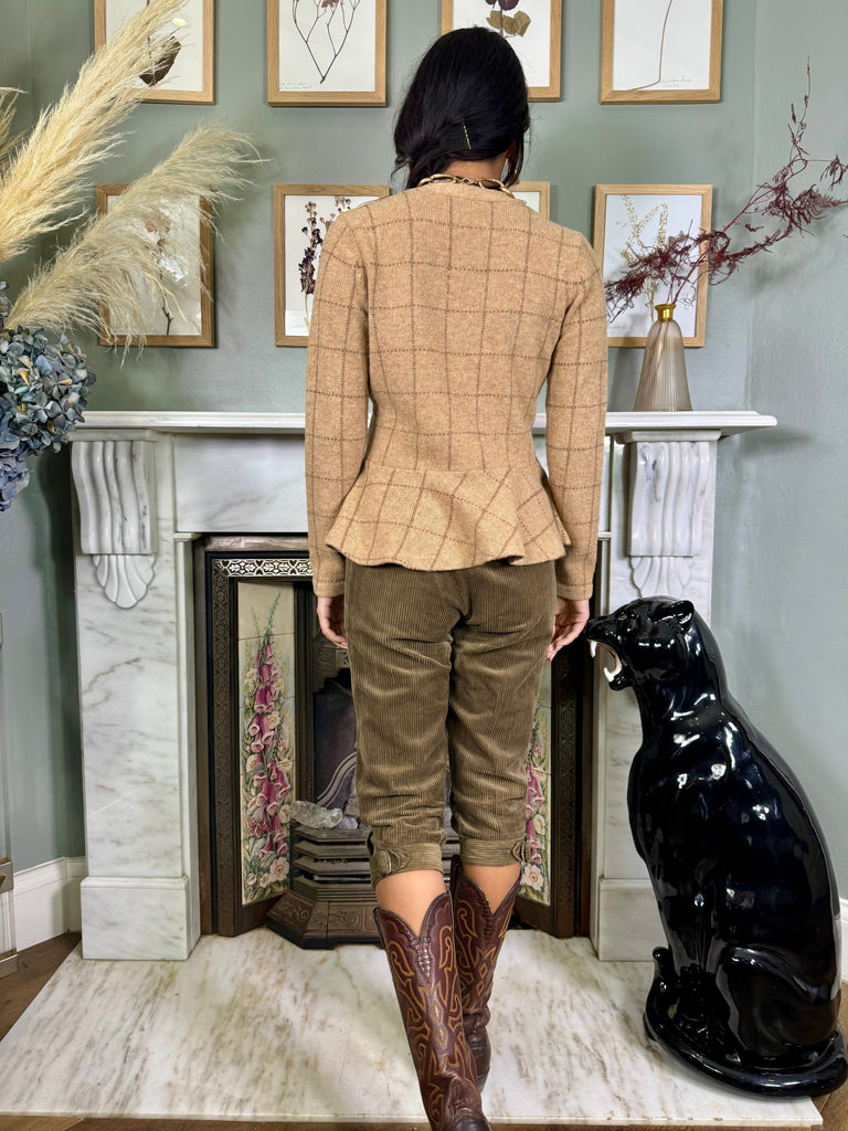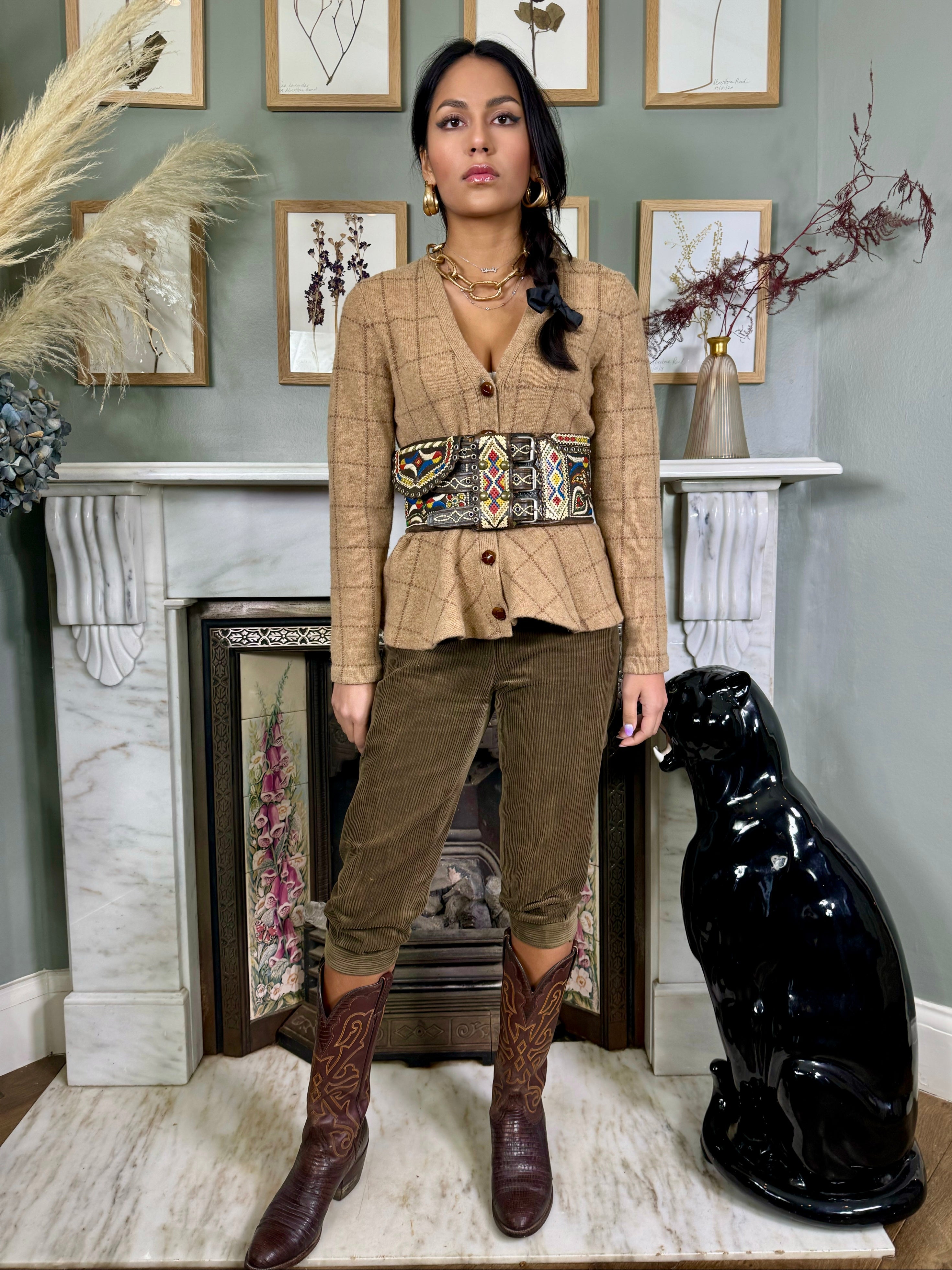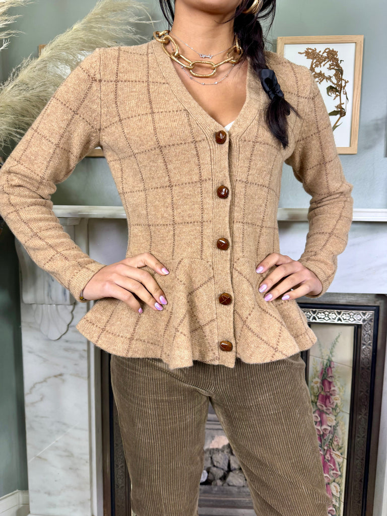 Gorgeous and soft vintage Ralph Lauren checked camel cardigan in wool. Has long sleeves, a front V neckline and a peplum silhouette. Has front leather woven buttons and looks fab belted too. In excellent condition.