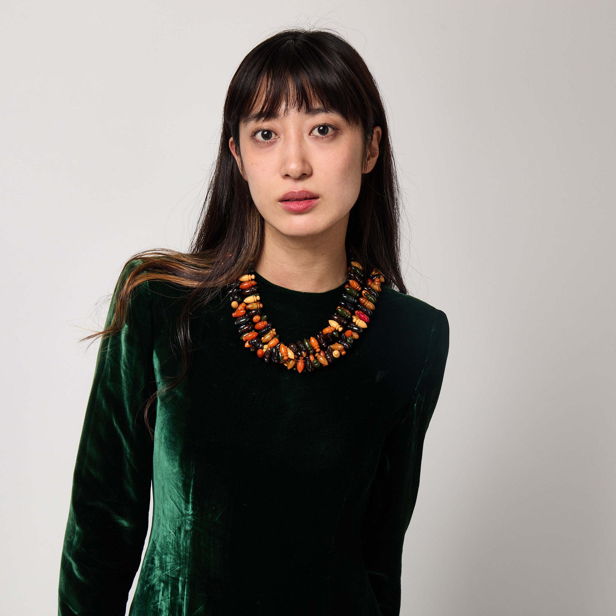 Originally used for industrial purposes thanks to its ability to withstand heat, moulded Bakelite and its cast cousin, Catalin, made the jump to costume jewellery in the 1920s and had their heyday in the 1930s and 1940s with this necklace being one of the more decadent examples. When worn, the piece makes an impressive statement thanks to its substantial size and colourful appearance. Its generous length makes it possible to slip easily on and off overhead or it can be worn looped over. Truly a rare find which belongs in a serious collection.