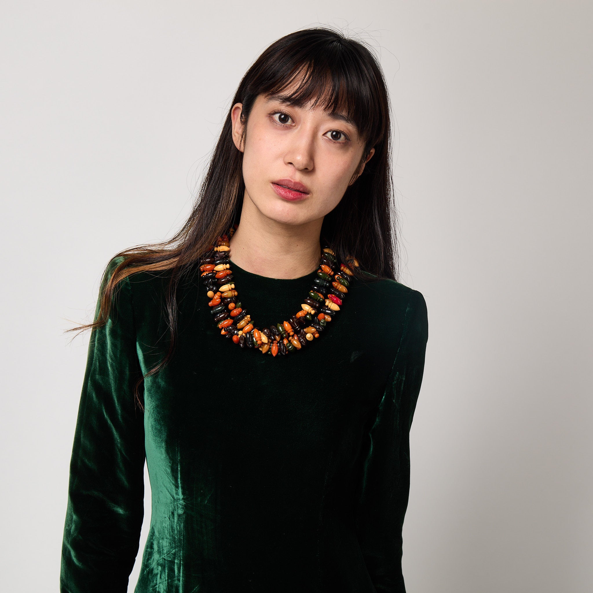 Impressive 1930s Bakelite necklace made up of multicoloured beads in various shades of dark green, mustard, orange, tan, red, brown and black - colours which were given food-related names such as Creamed Corn, Butterscotch, Egg Yolk, and Salmon. Each bead is reminiscent of a chess piece, with rounded lines that very much echo the art deco styles of the era.