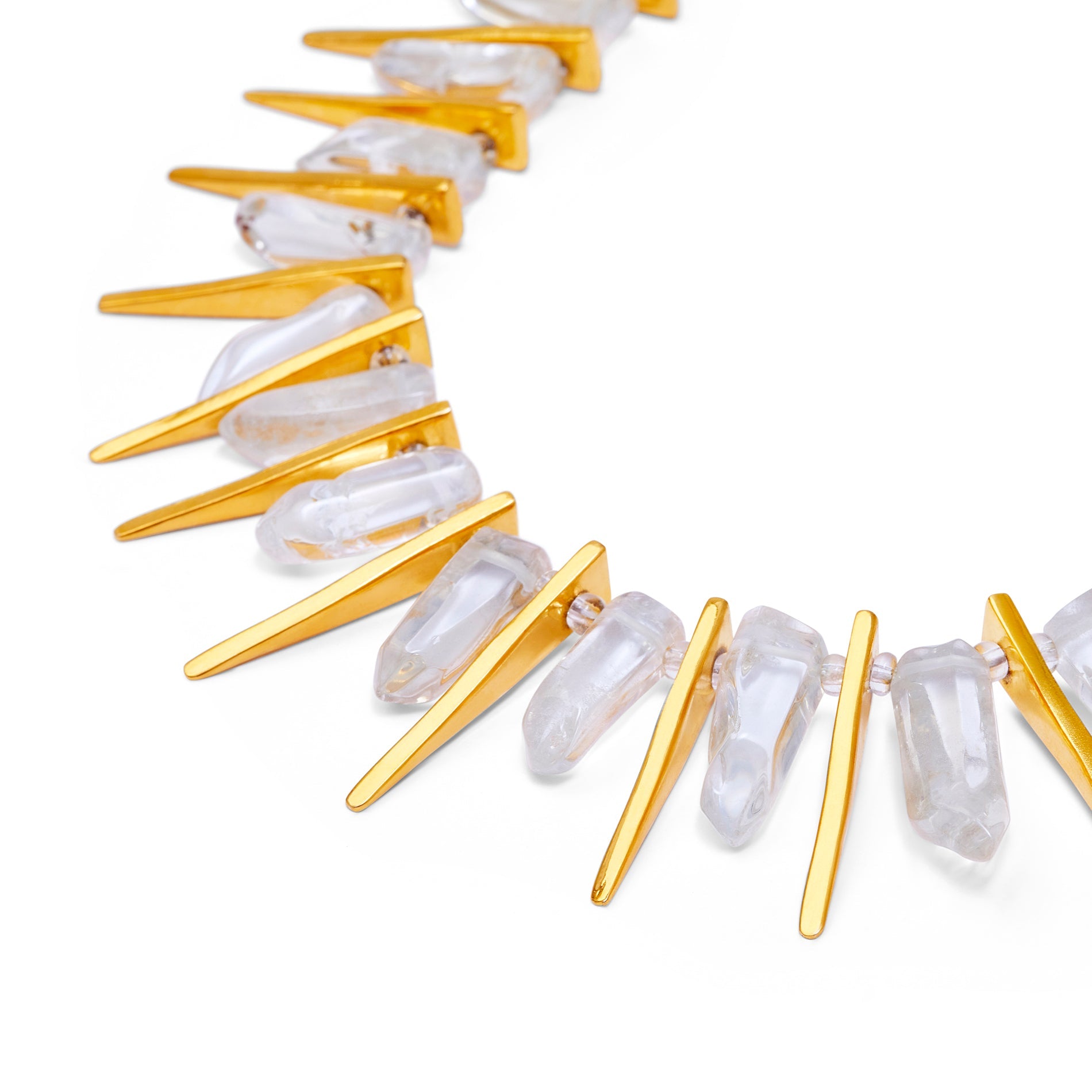 This incredible 1990s necklace by Kenneth Jay Lane makes a real statement and was designed to turn heads! It features a two strand chain comprised of elongated gold pieces, and clear glass beads which very realistically emulate rock crystal. The unique interlocking clasp is incredibly distinctive to Kenneth Jay Lane designs, and so the necklace can comfortably be dated to the mid 1990s, with its modern design and dynamic use of Lucite typical to the radicalism of the era. Weighty and extravagant, it would make a spectacular evening piece, perfect for a cocktail party or black tie event.