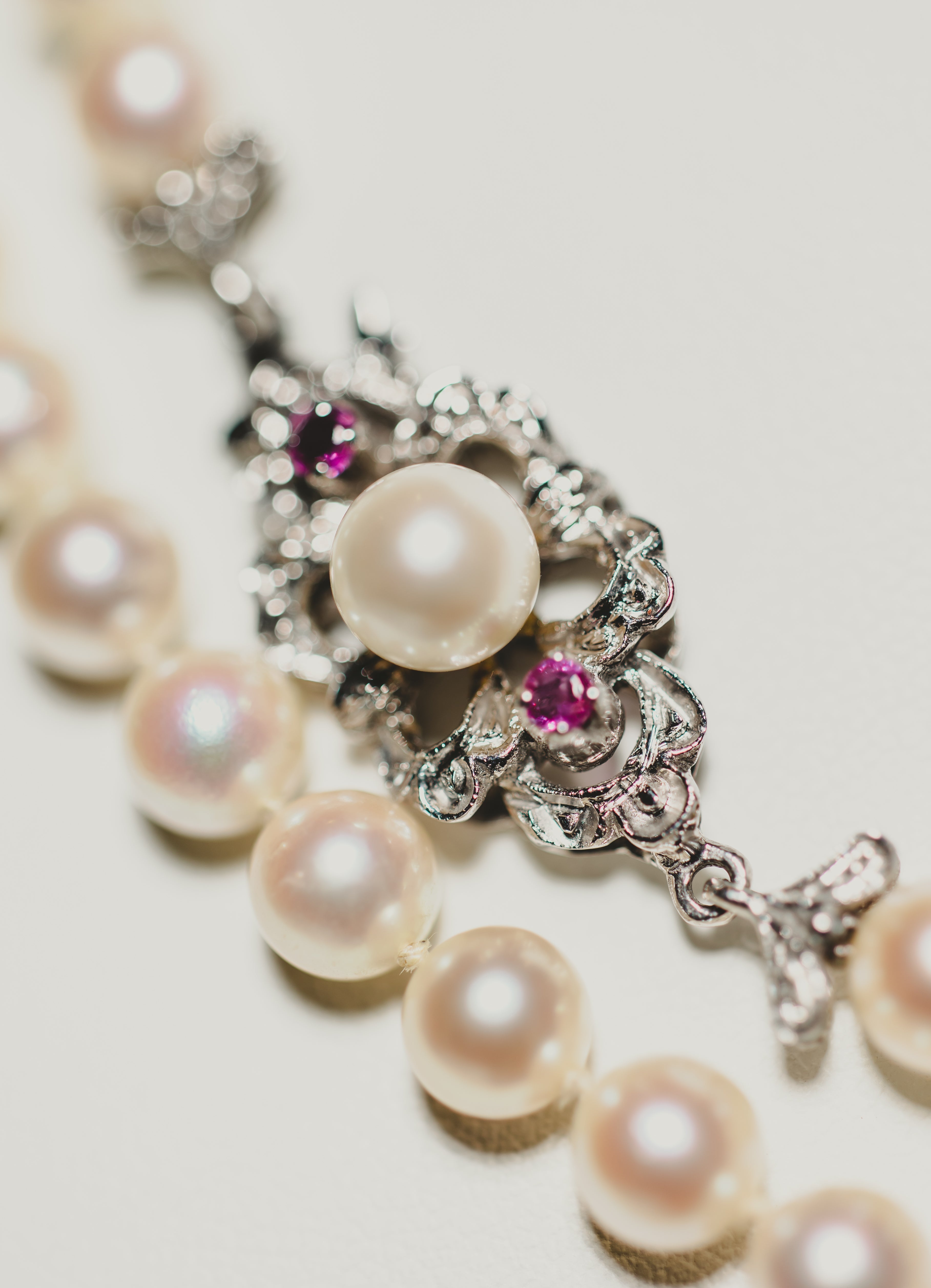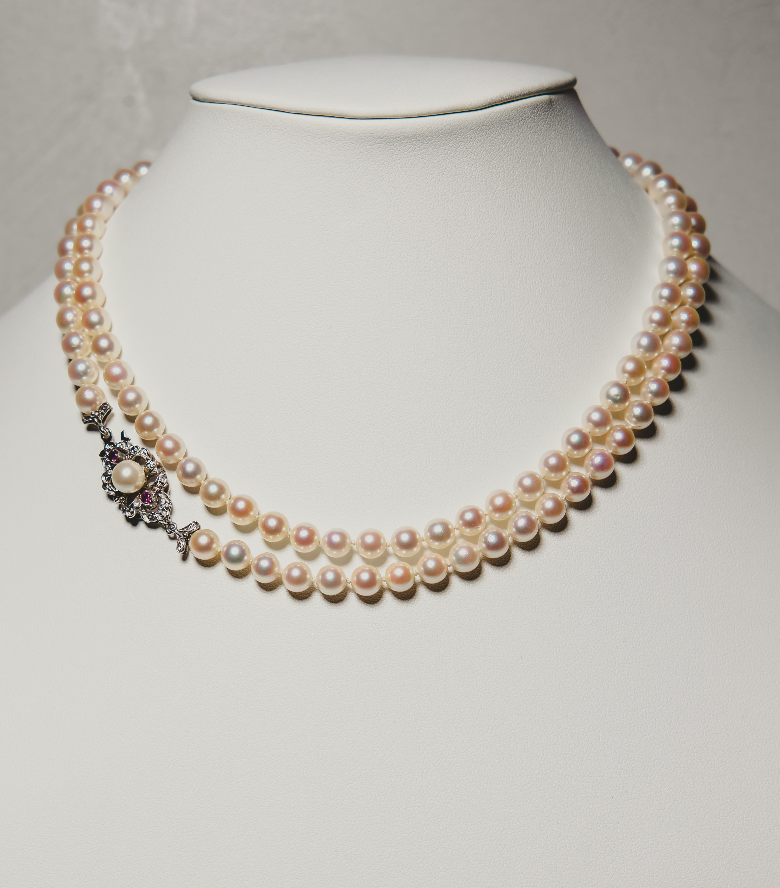 Akoya Pearl Necklace with Diamond and Ruby Clasp.
