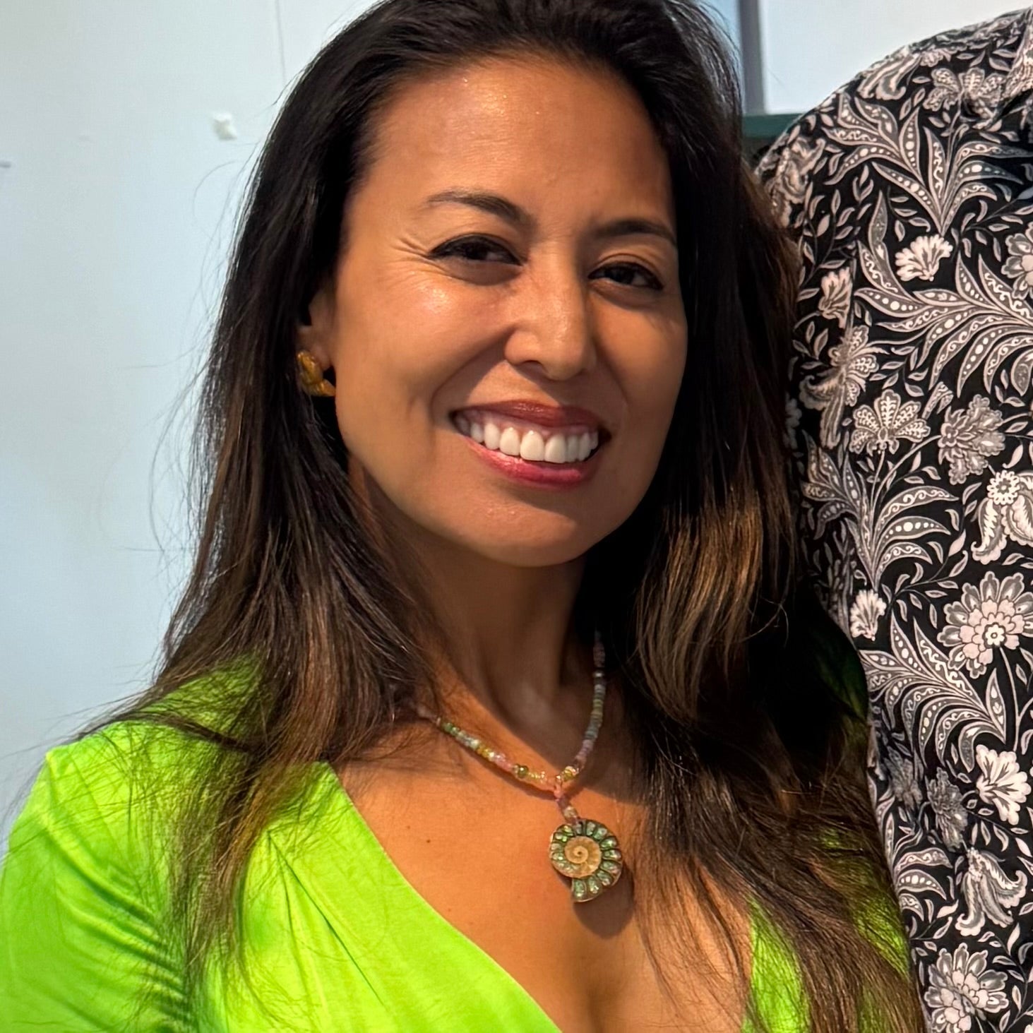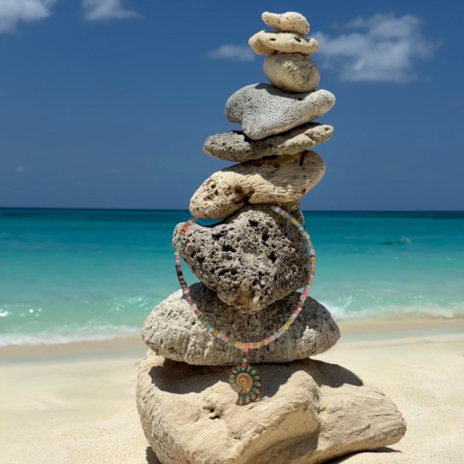 This beautiful necklace is handmade from pale neon ombré shades of lime, aqua, yellow and pink Ethiopian opal, aquamarine and citrine. Centred by a ombré glass filled natural ammonite, it has a 24kt gold vermeil clasp.