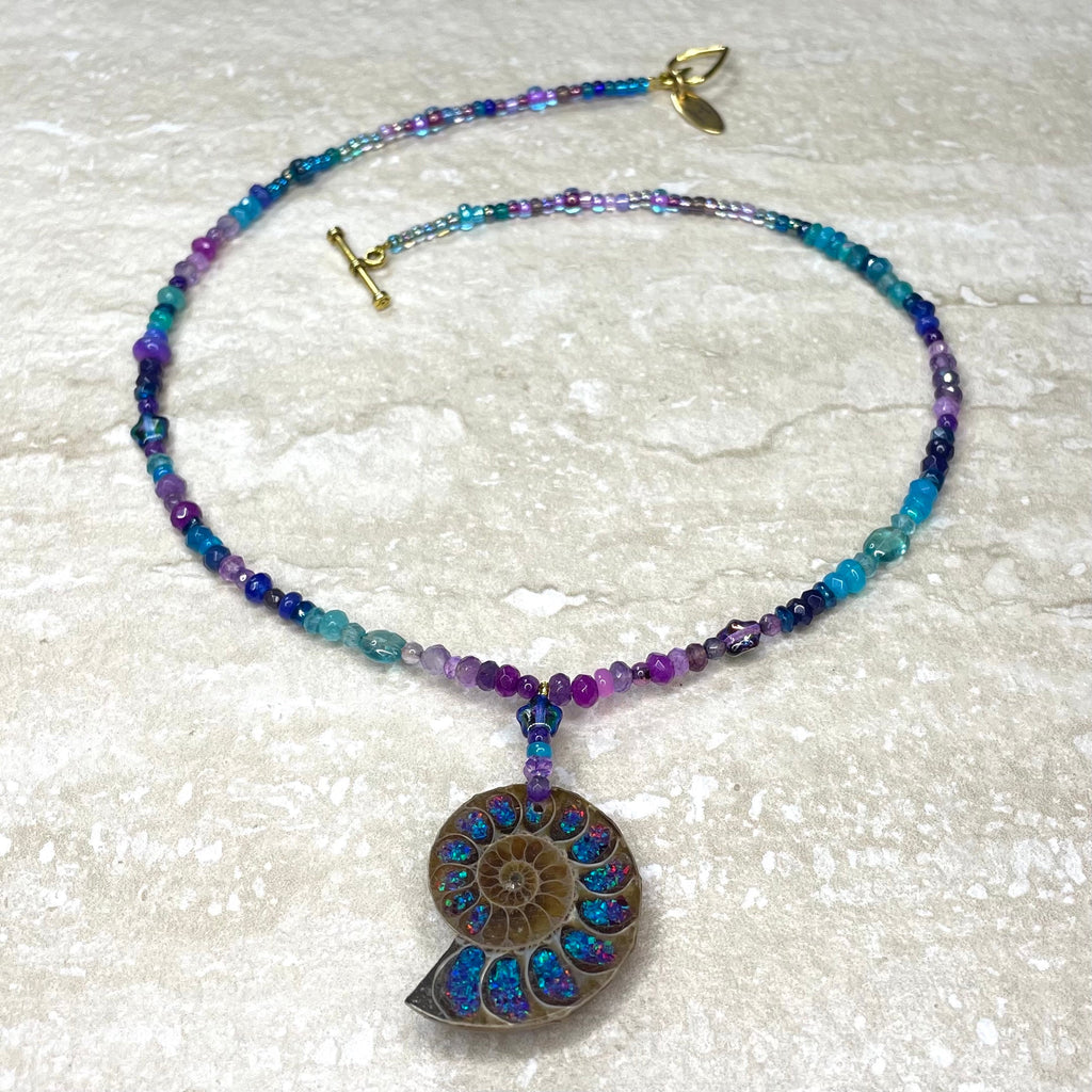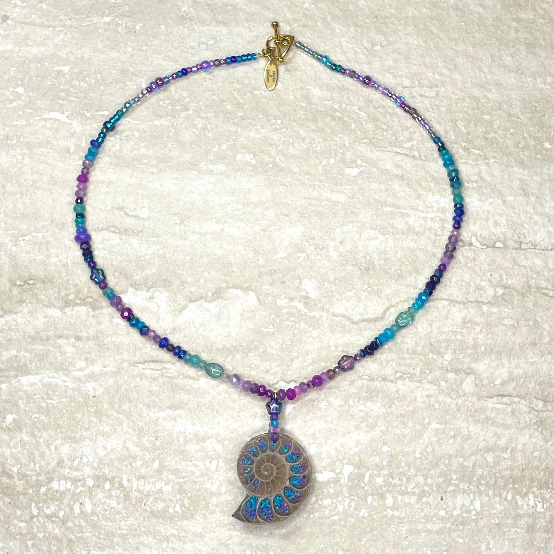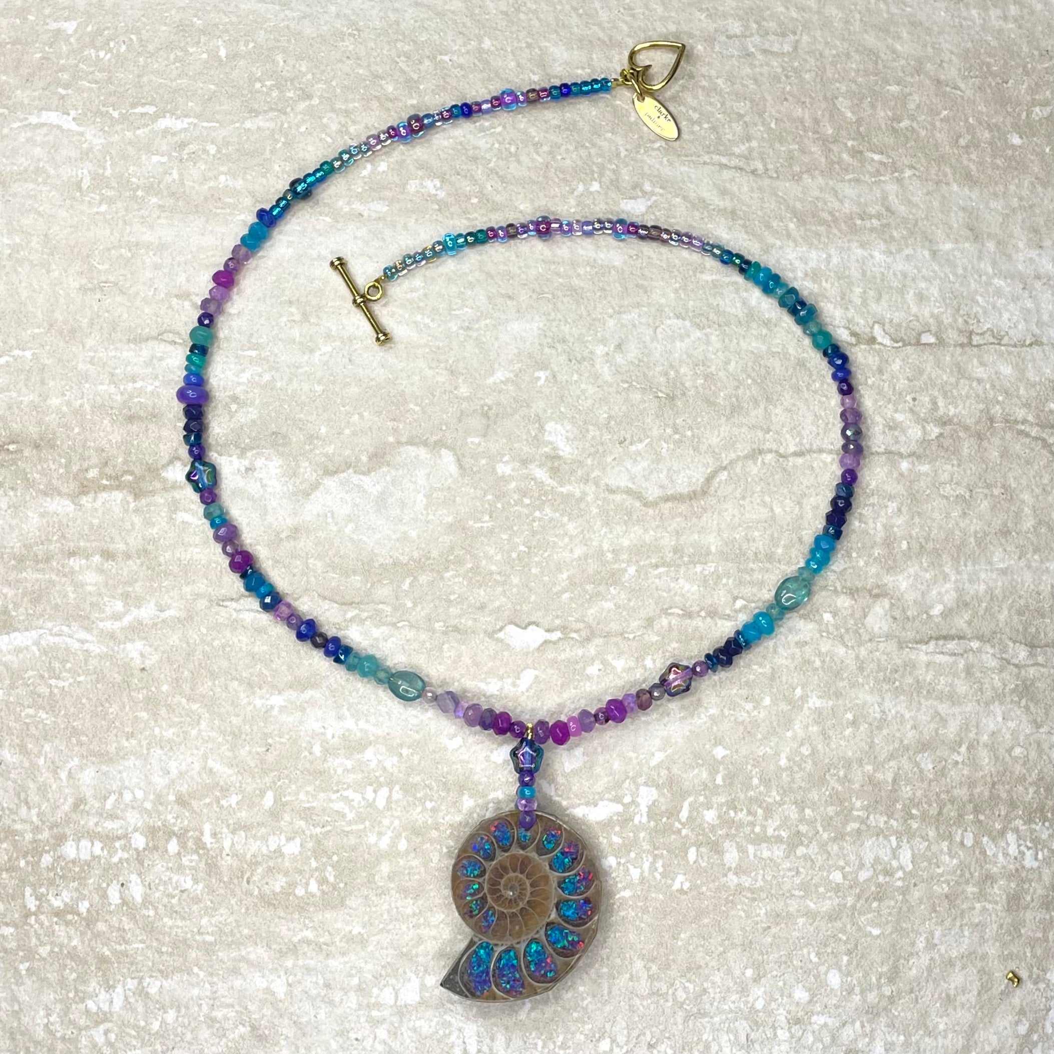 This beautiful necklace is handmade from bright turquoise, ultramarine and purple ombré shades of Ethiopian opal, amethyst, topaz, agate, aquamarine and Preciosa glass stars. Centred by a ombré glass filled natural ammonite, it has a 24kt gold vermeil heart clasp.