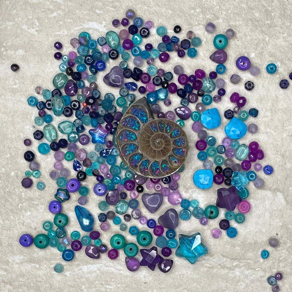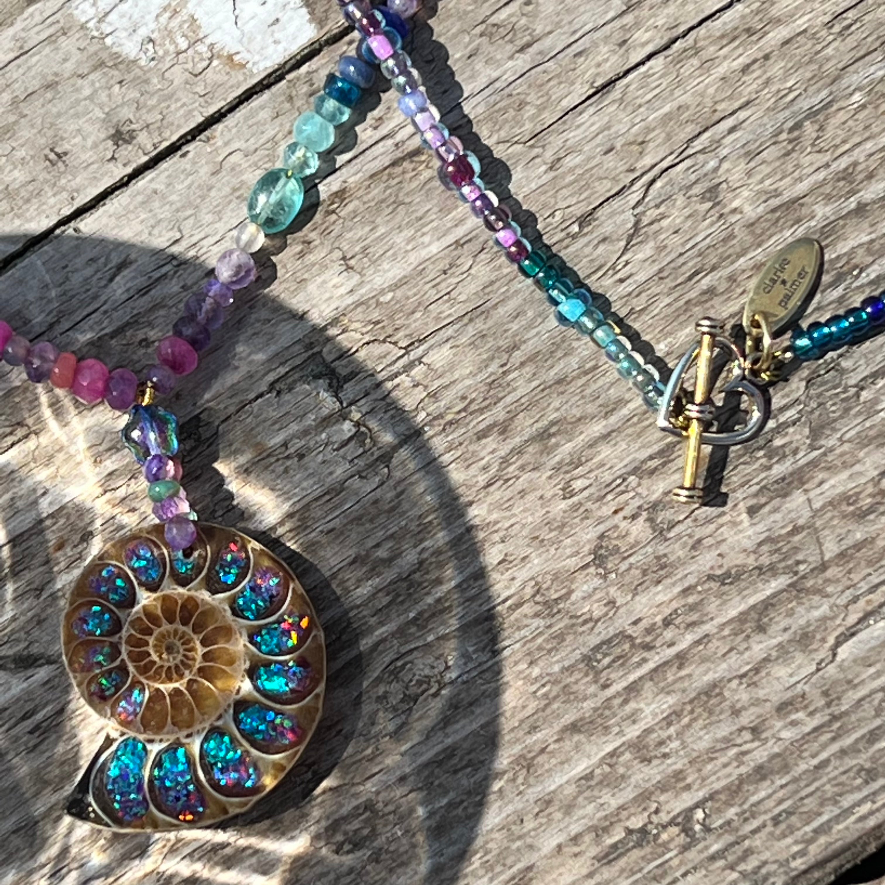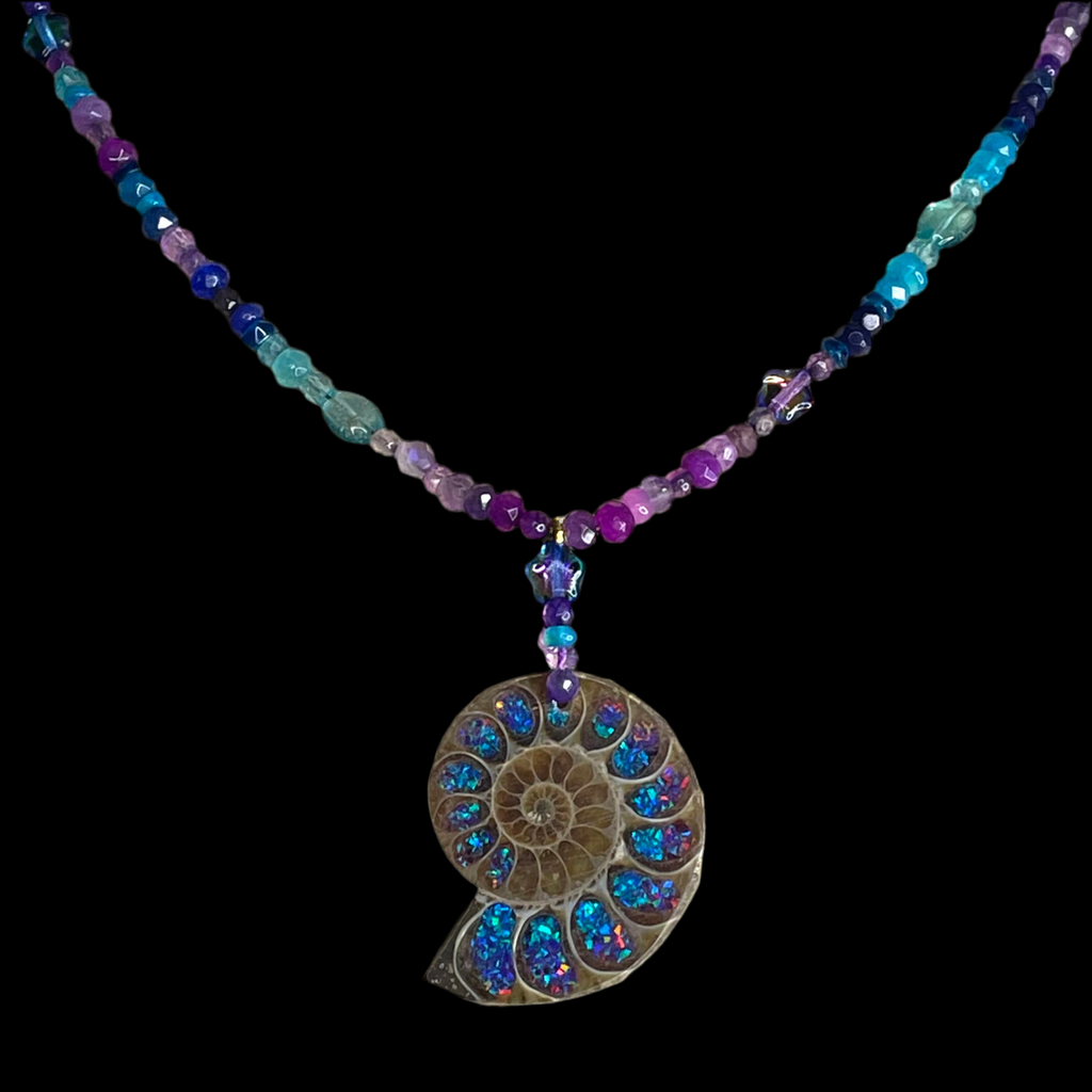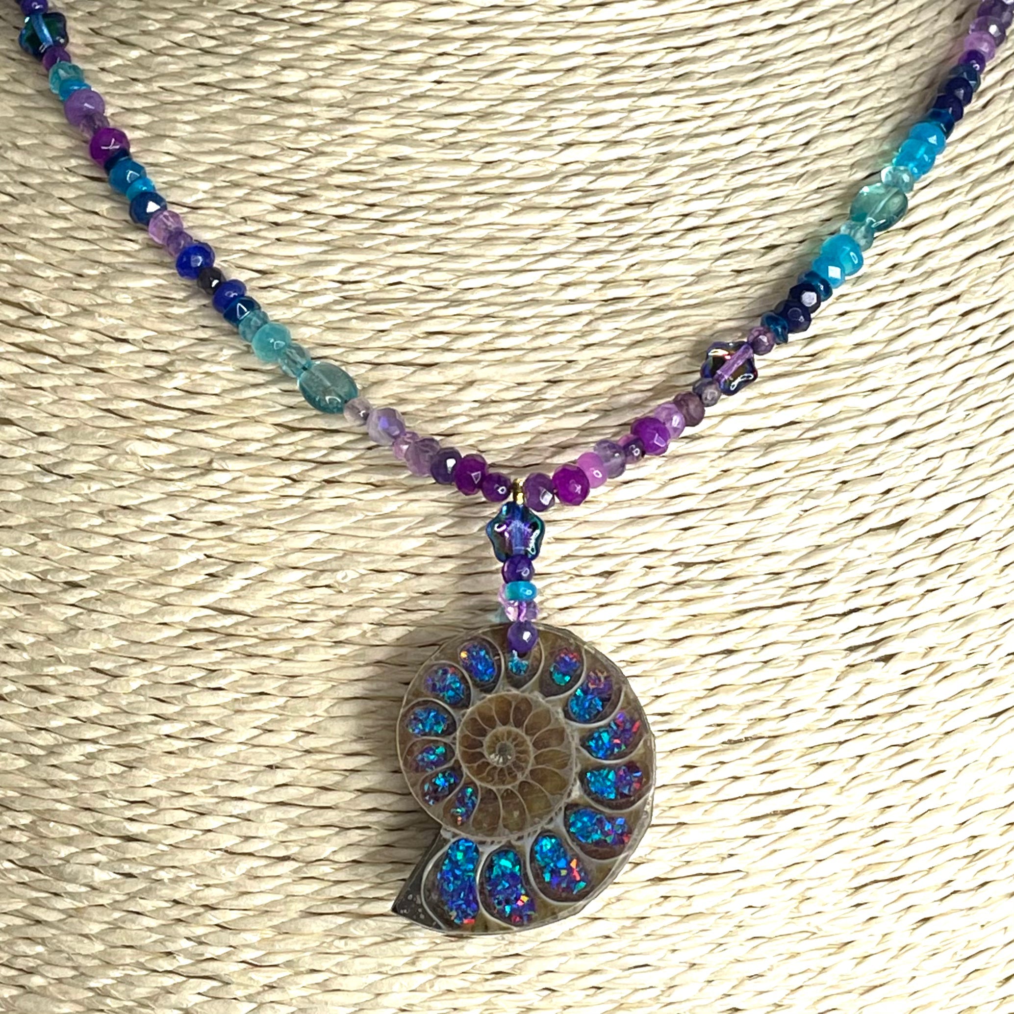 This beautiful necklace is handmade from bright turquoise, ultramarine and purple ombré shades of Ethiopian opal, amethyst, topaz, agate, aquamarine and Preciosa glass stars. Centred by a ombré glass filled natural ammonite, it has a 24kt gold vermeil heart clasp.