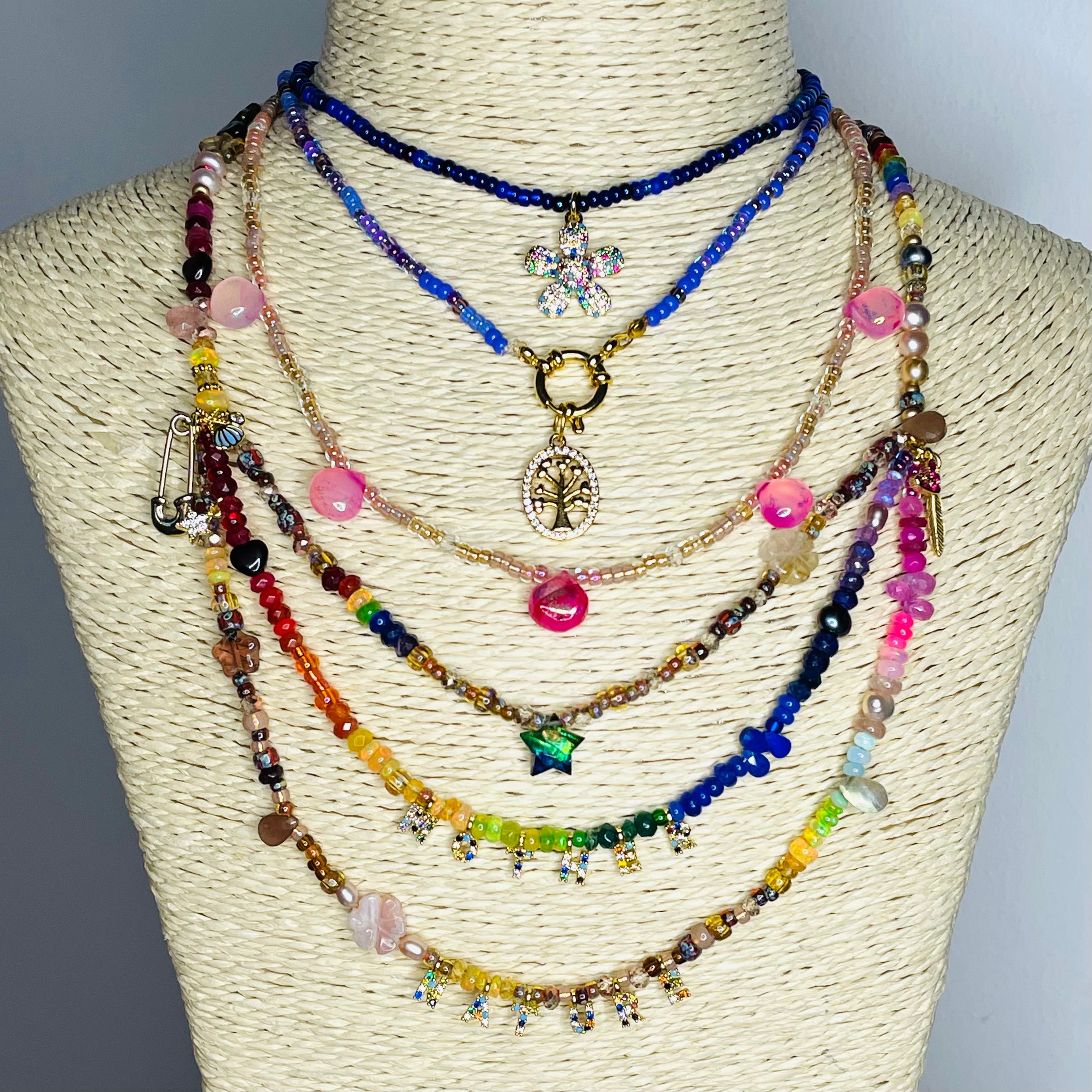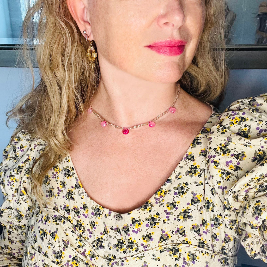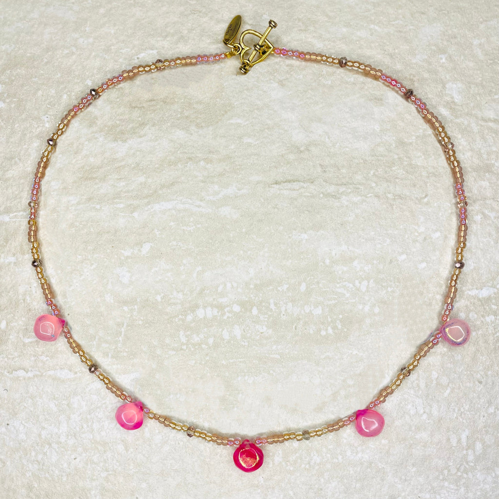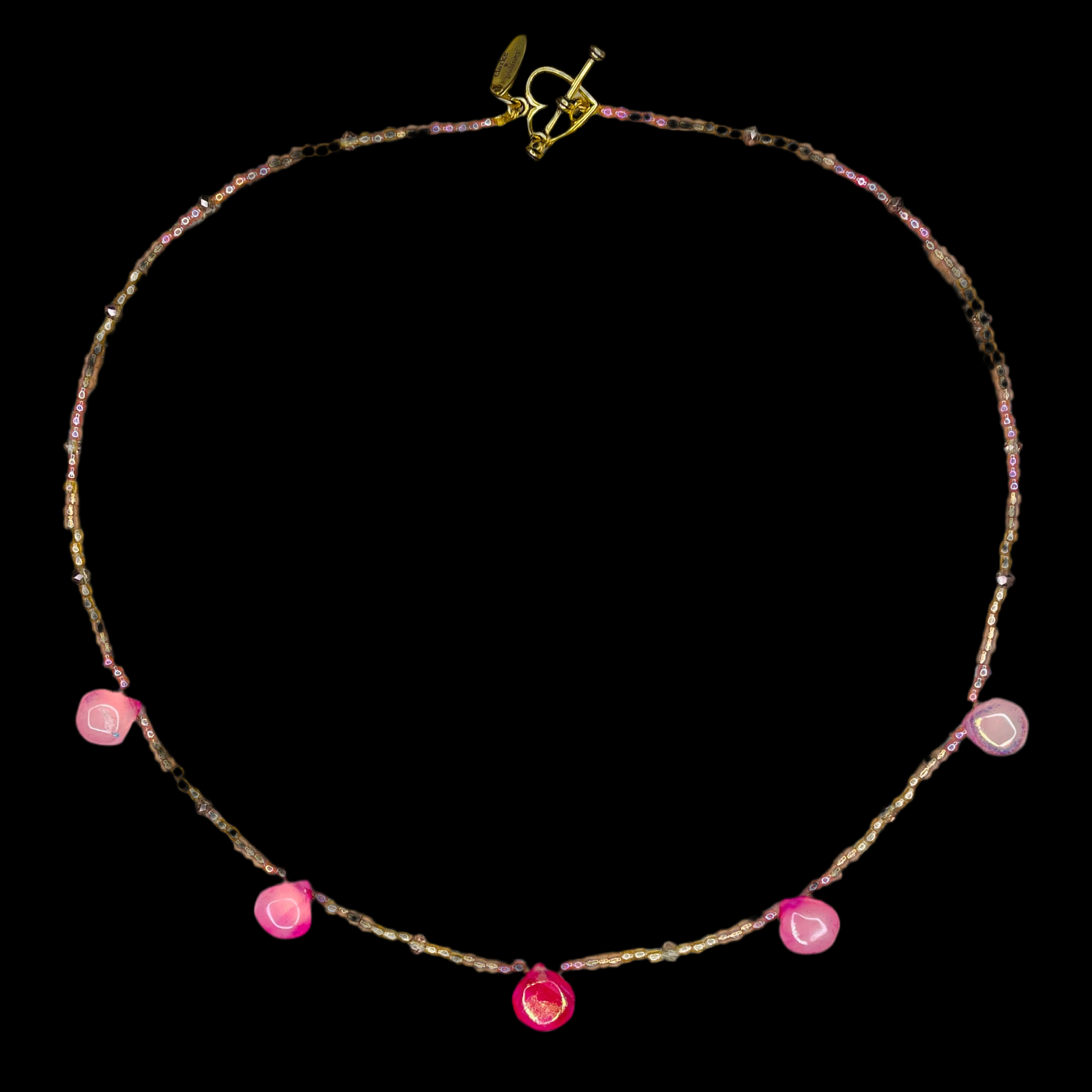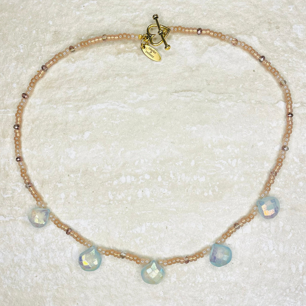 This beautiful necklace is handmade from rose gold coloured glass Preciosa and Miyuki beads, and centred by five gemstone briolettes - teardrop shaped stones.