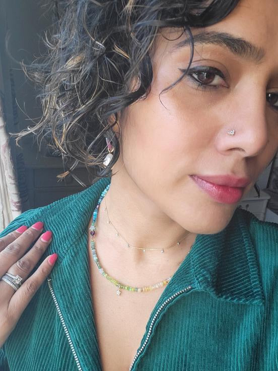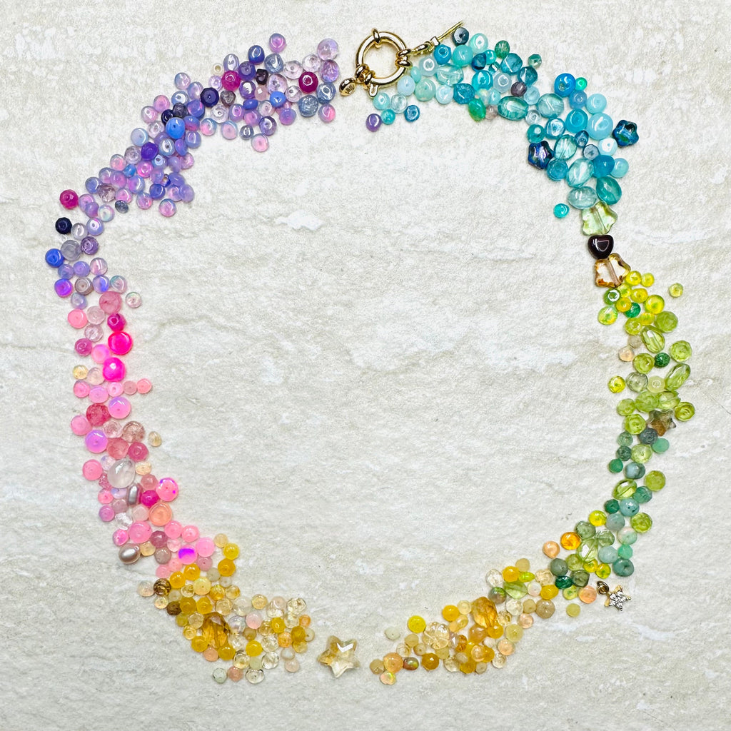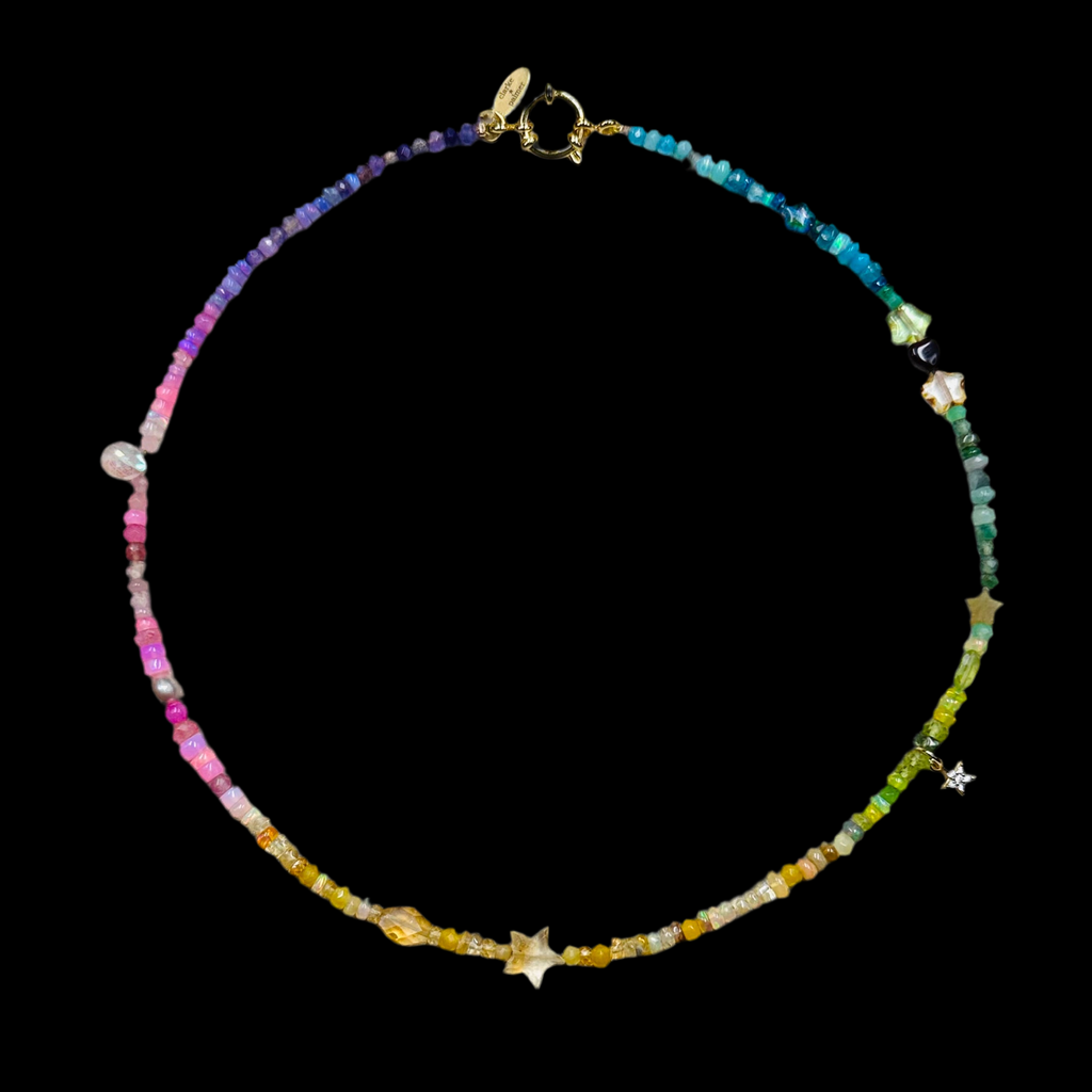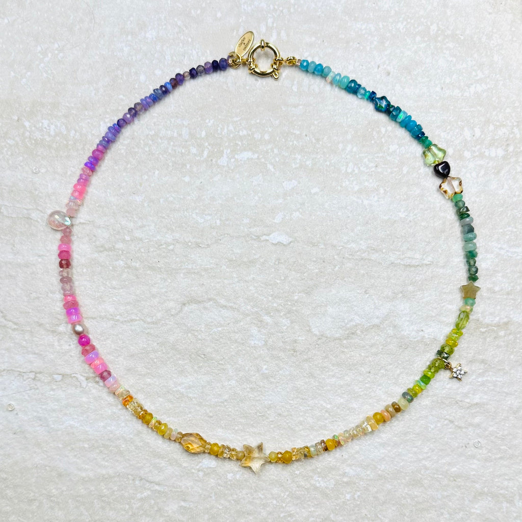 In a subtle rainbow blend of gemstone rondelles, this very special necklace includes opals, emeralds, amethyst, aquamarine, topaz, citrine, peridot, tourmaline, moonstone, rose Quartz, chalcedony, andesine and pearl. These beautiful sustainably sourced sherbert hued stones can help align your root, sacral, solar plexus, heart, throat, third eye & crown chakras. It features a deep yellow citrine star and has a 24kt gold vermeil heart shaped toggle clasp.