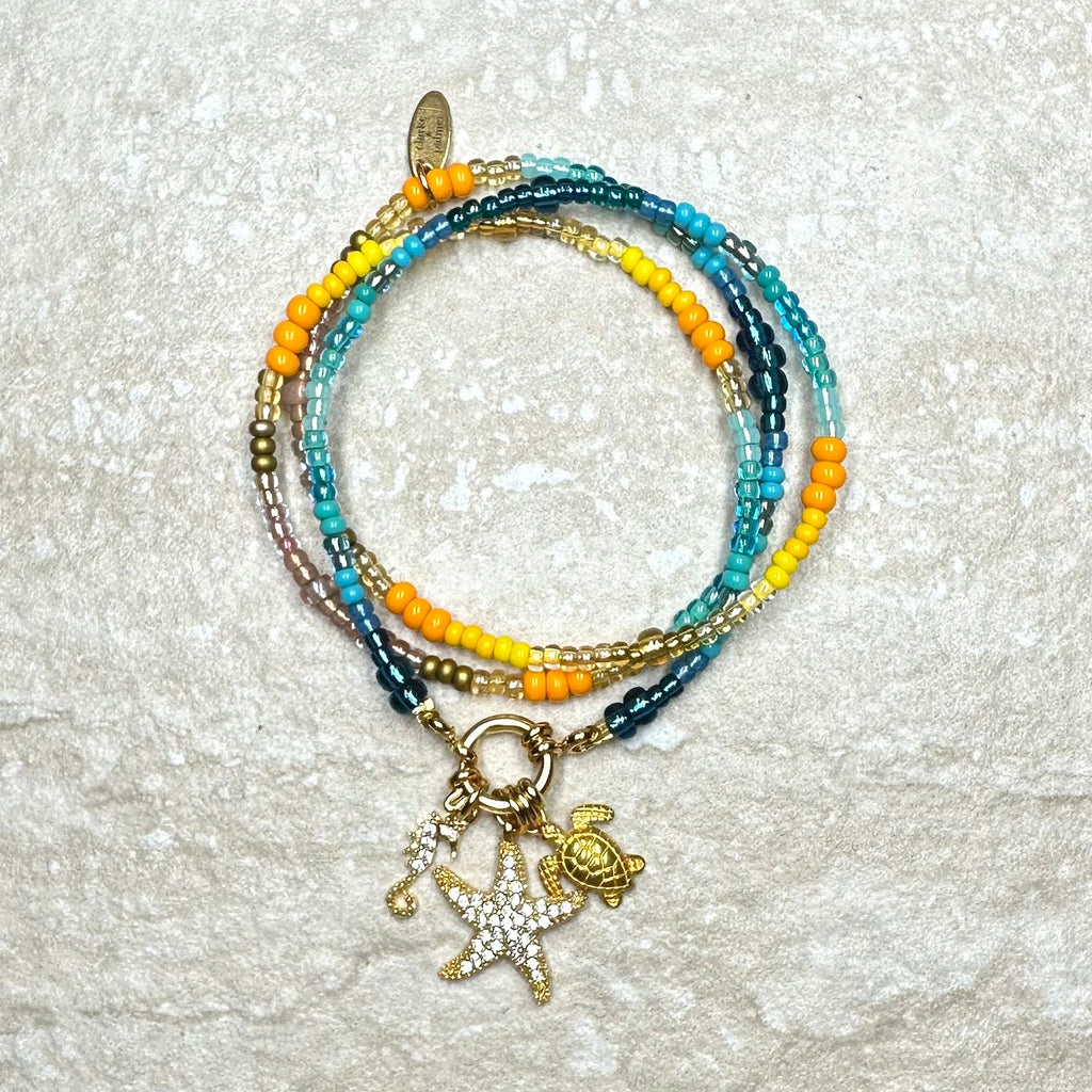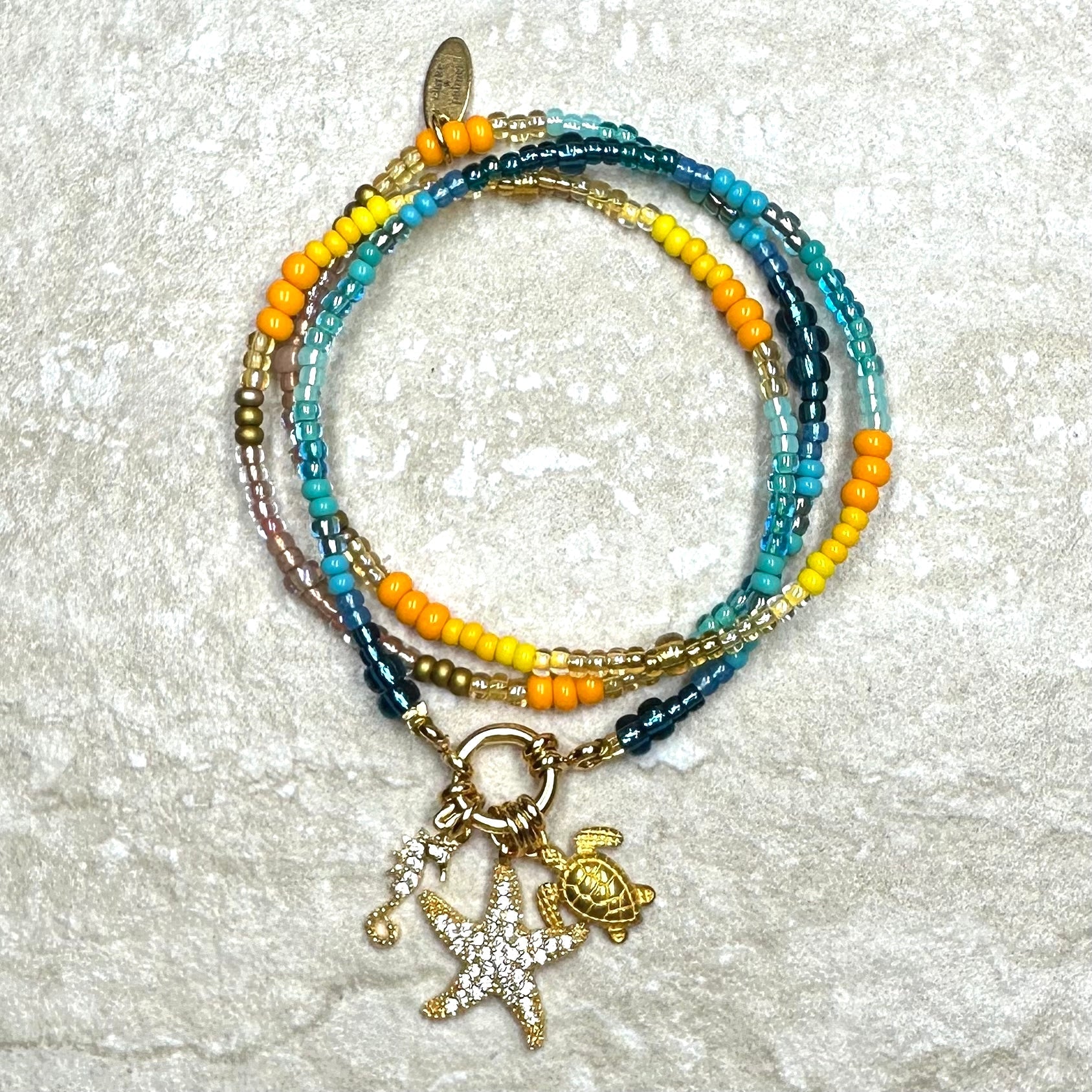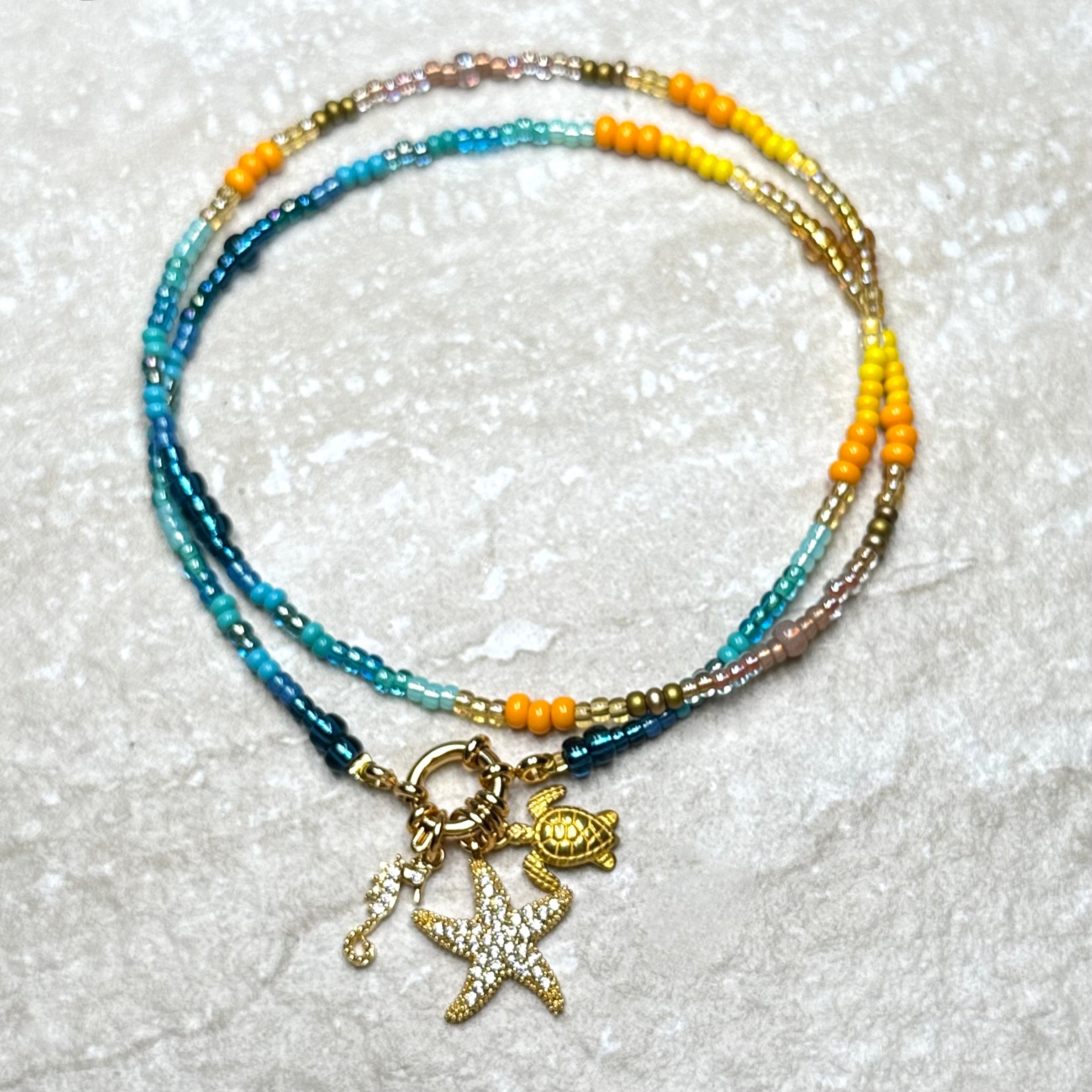 Handmade from shades of gold, yellow, turquoise and azure Preciosa and Miyuki glass beads with a 24kt gold vermeil clasp and 3 charms (including letter charms) of your choice, it brightens up any outfit and any day. Perfect for Summer dreaming or to pack for that Winter getaway. Enjoy!