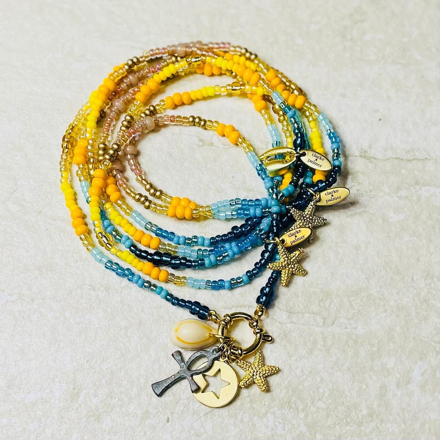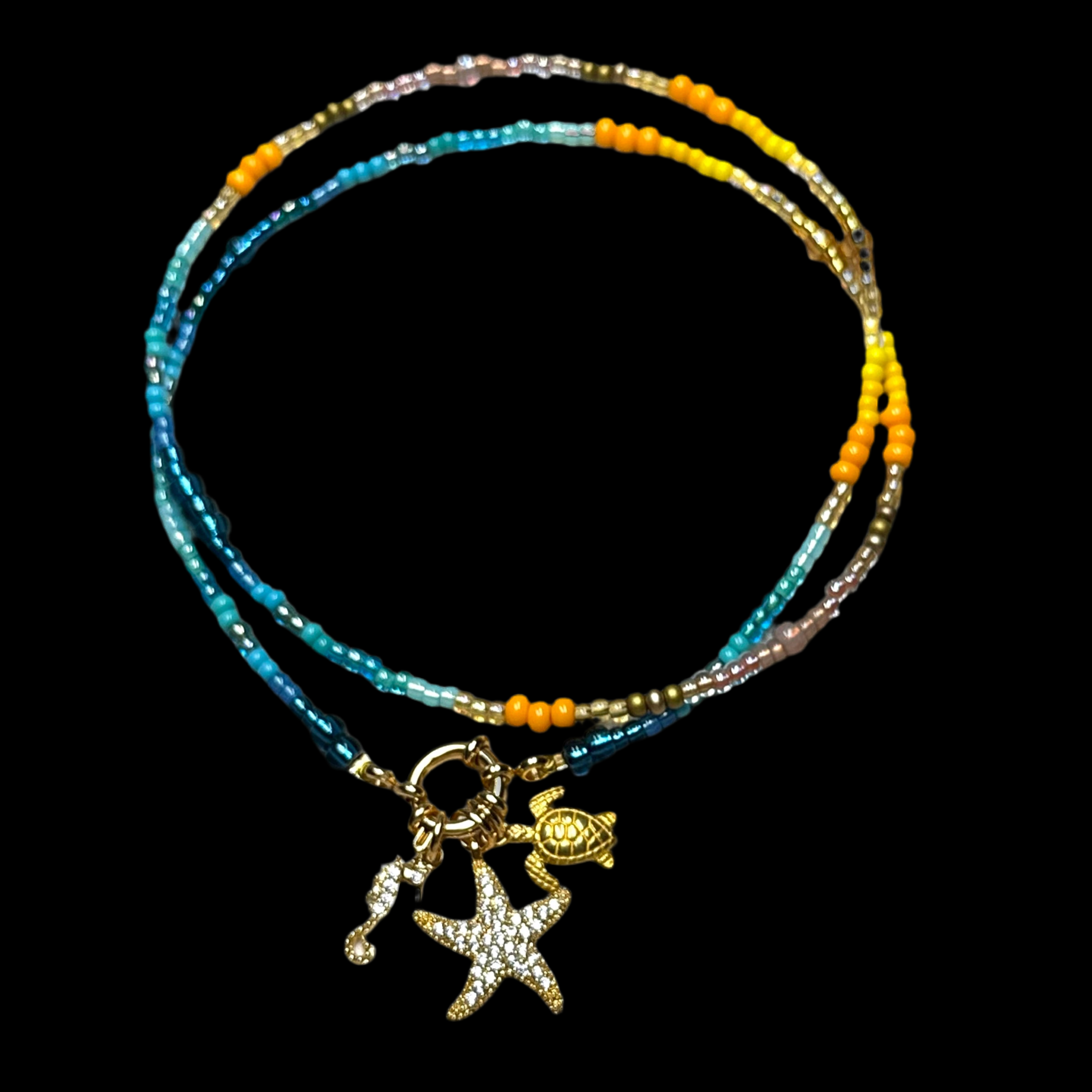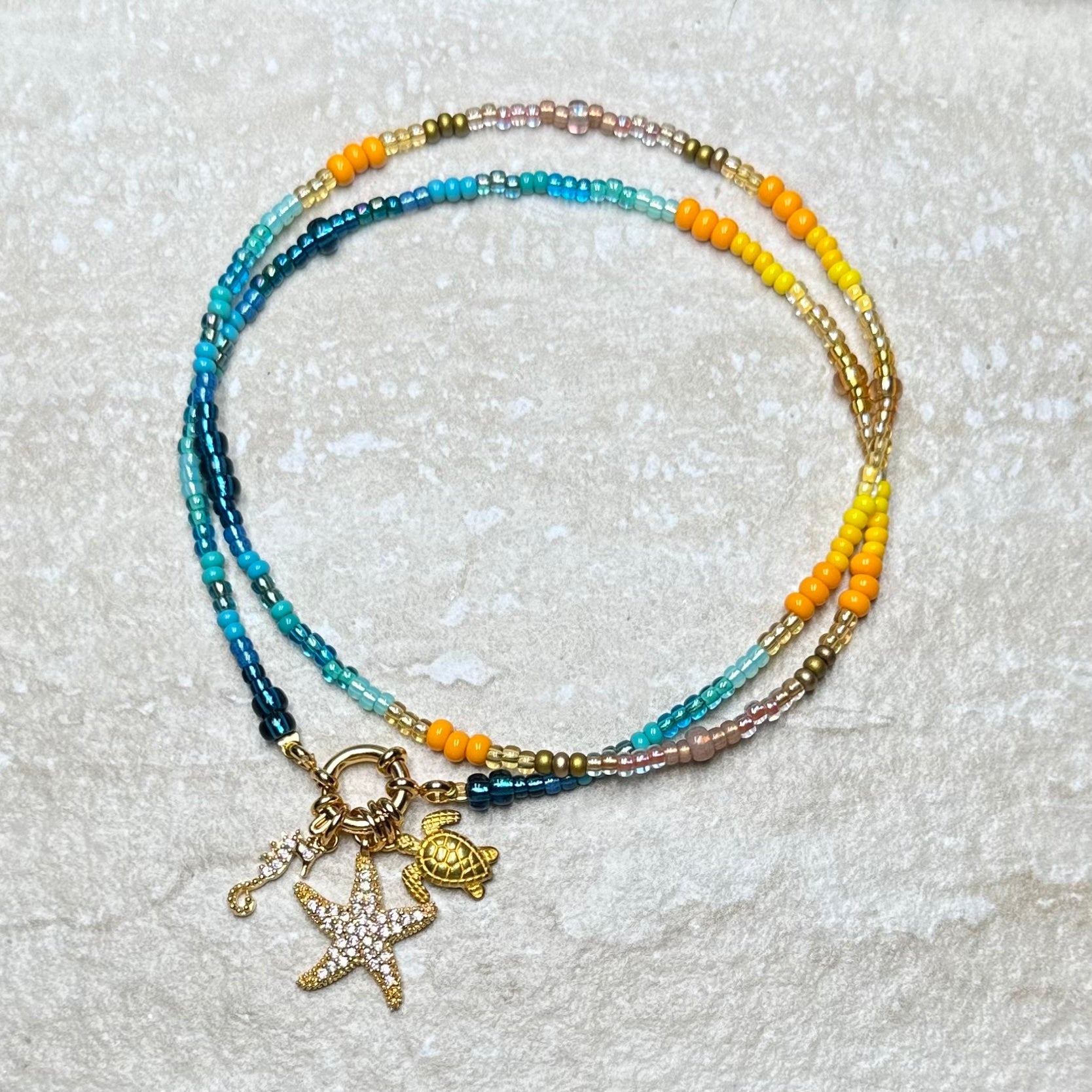 Handmade from shades of gold, yellow, turquoise and azure Preciosa and Miyuki glass beads with a 24kt gold vermeil clasp and 3 charms (including letter charms) of your choice, it brightens up any outfit and any day. Perfect for Summer dreaming or to pack for that Winter getaway. Enjoy!