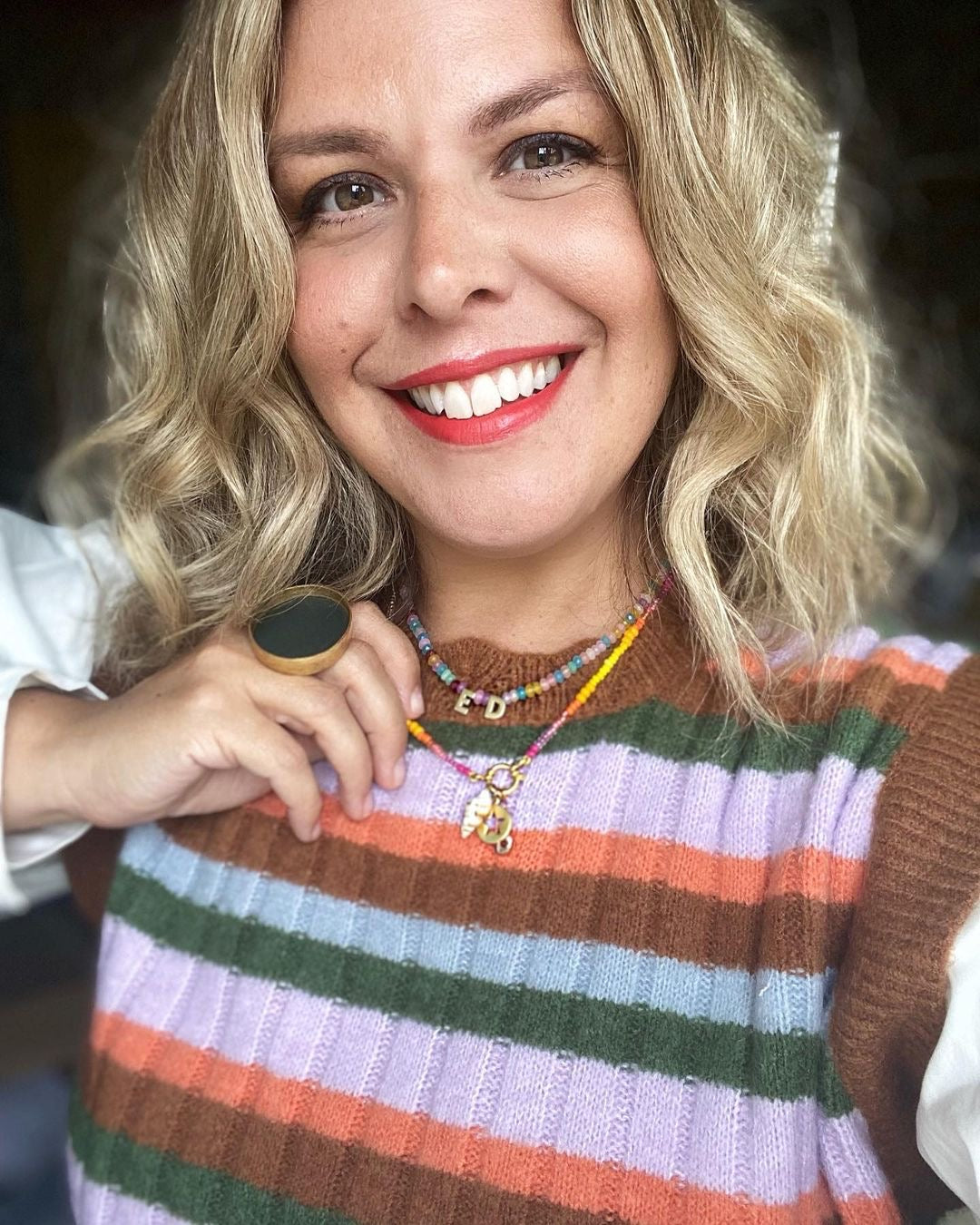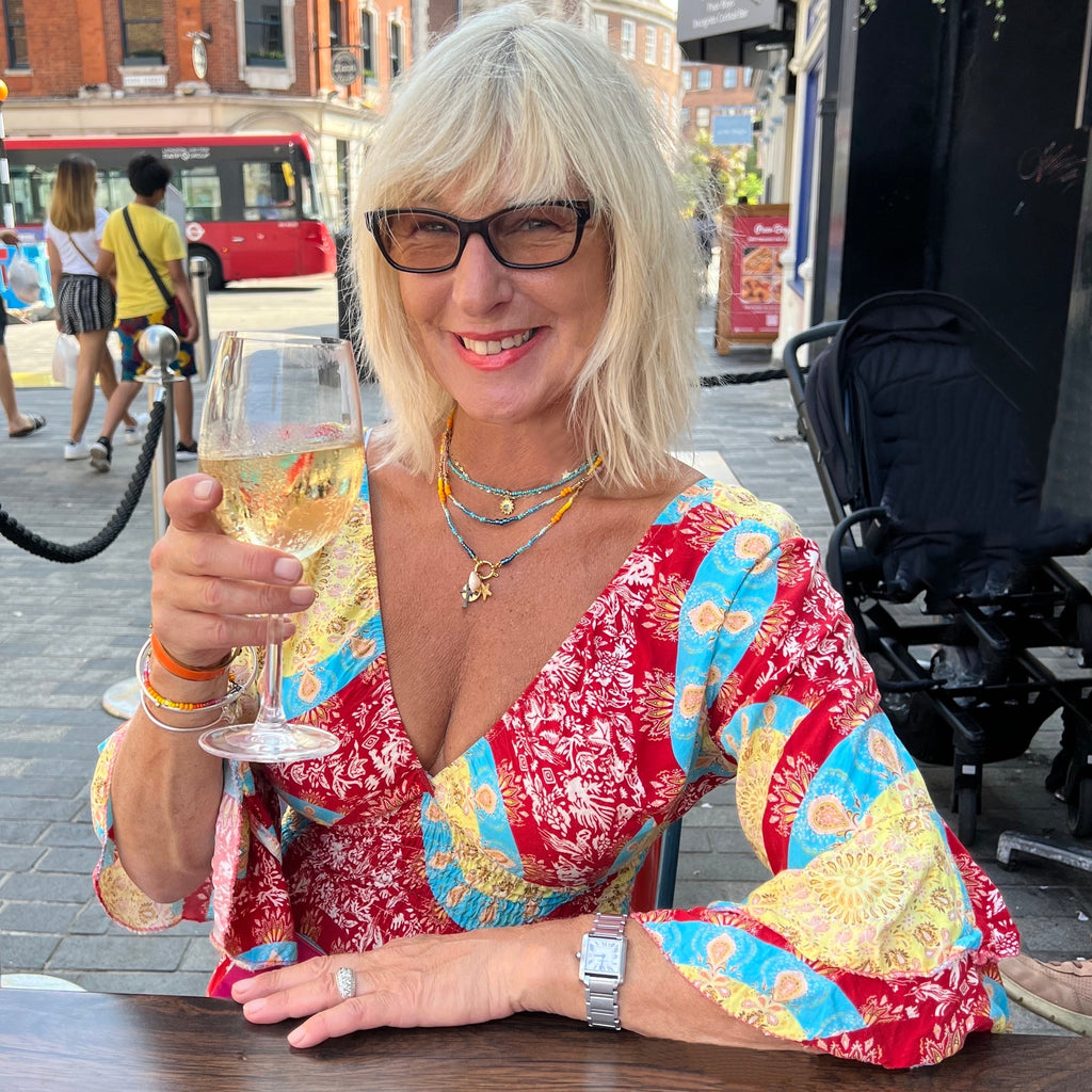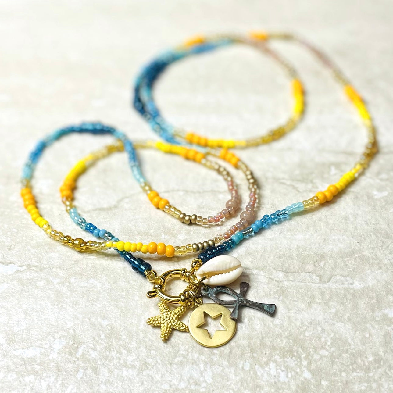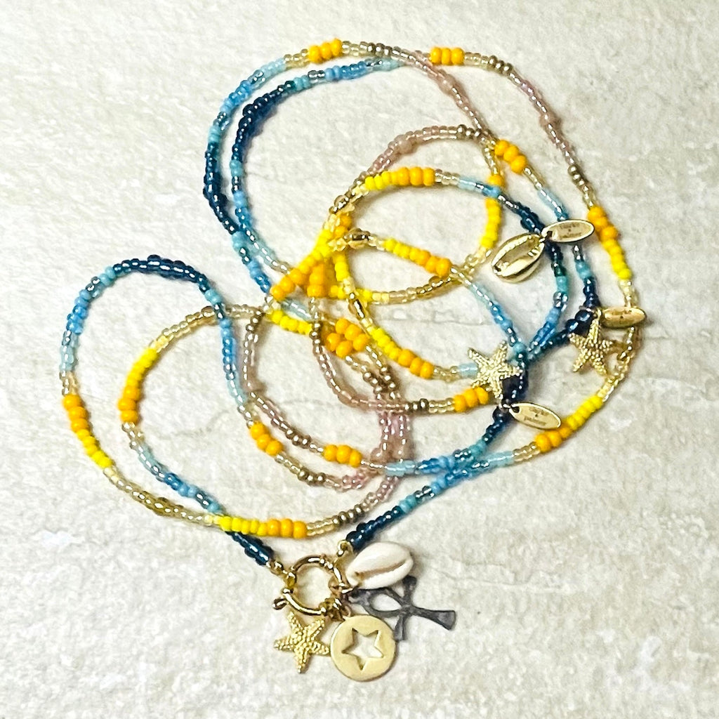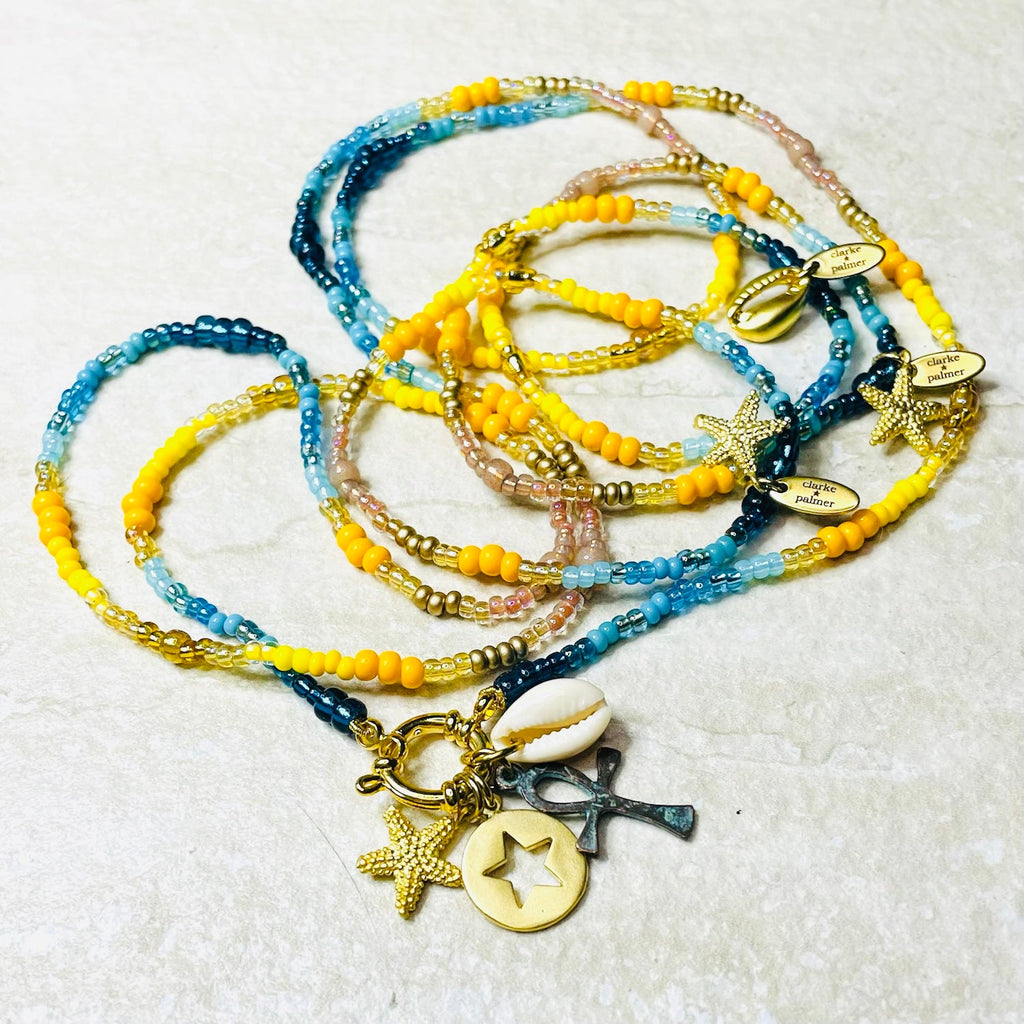 Our Sun Sea and Sand charm necklace is the brand new colourway of our Golden Sunlight necklace as featured in the Telegraph by Stacey Duguid and also by Erica Davie