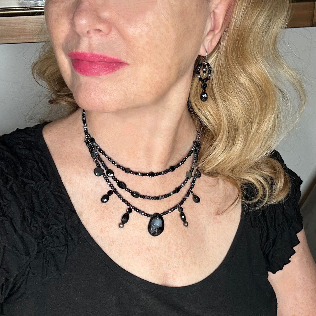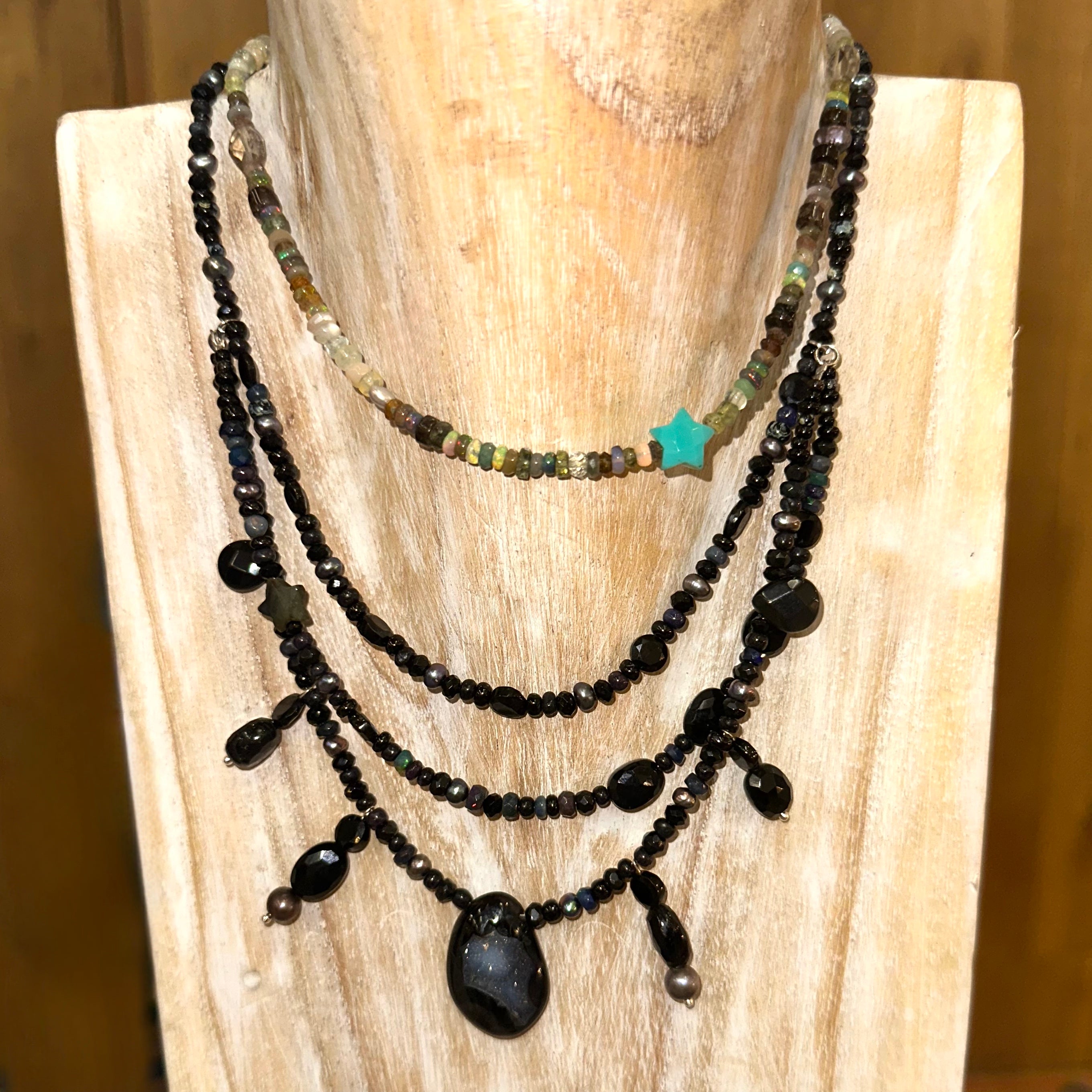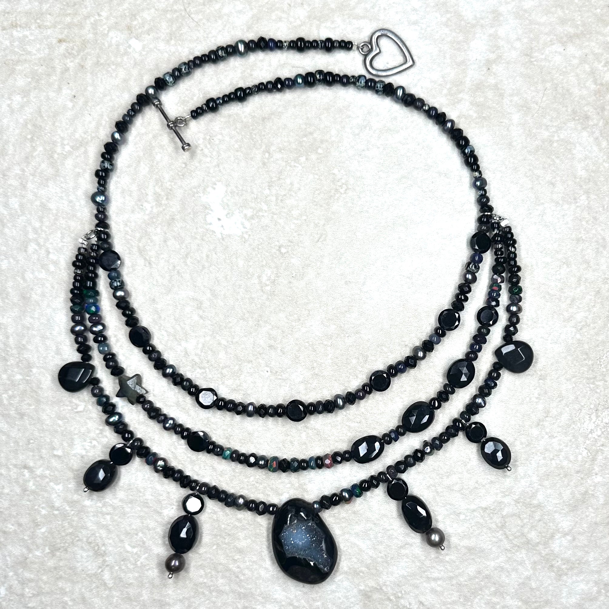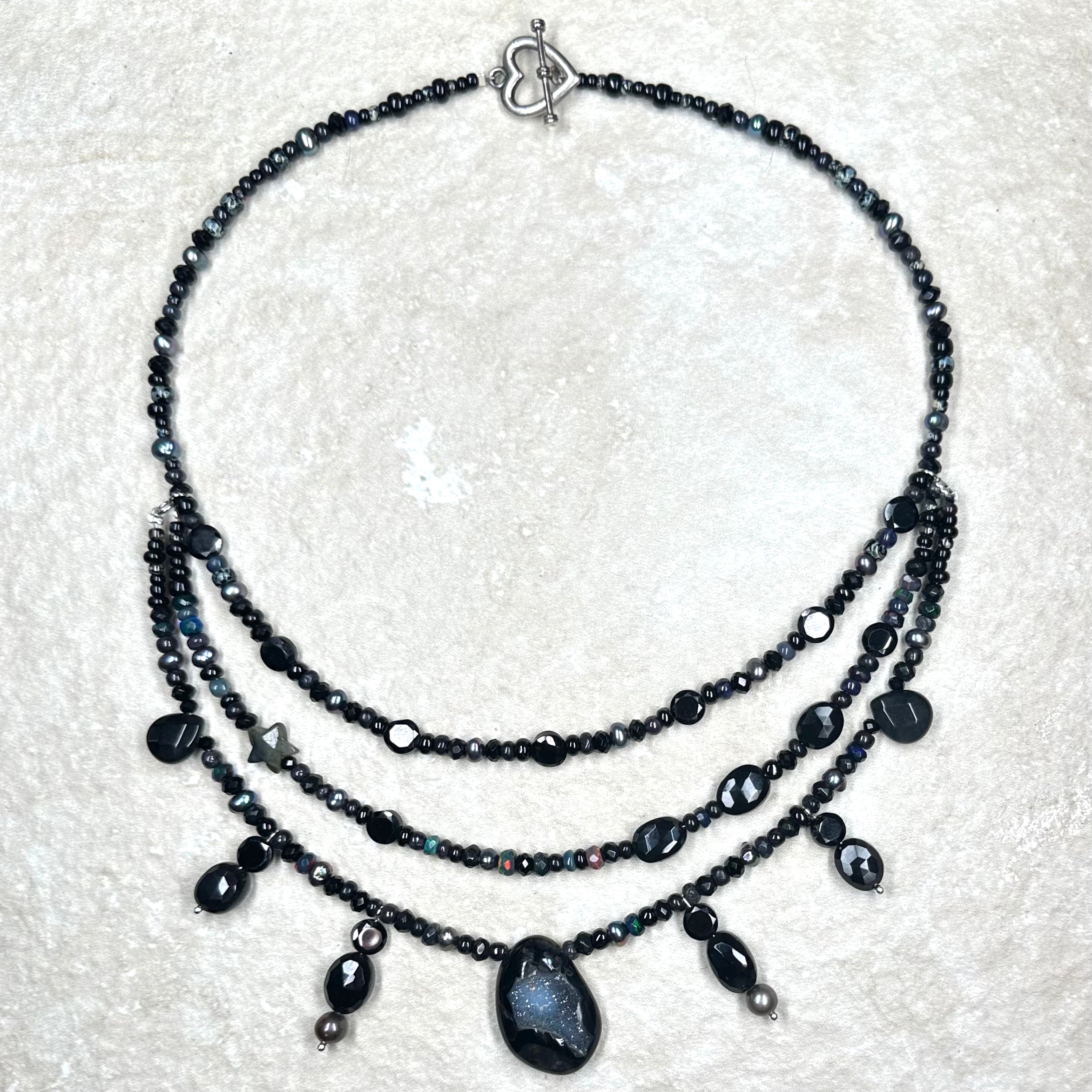 Our Tish Everything Necklace is inspired by Tish Addams the legendary Mother of Wednesday and Pugsley. Handmade in spinel, onyx, opal sustainably sourced hand cut rondelles and tiny black pearls.