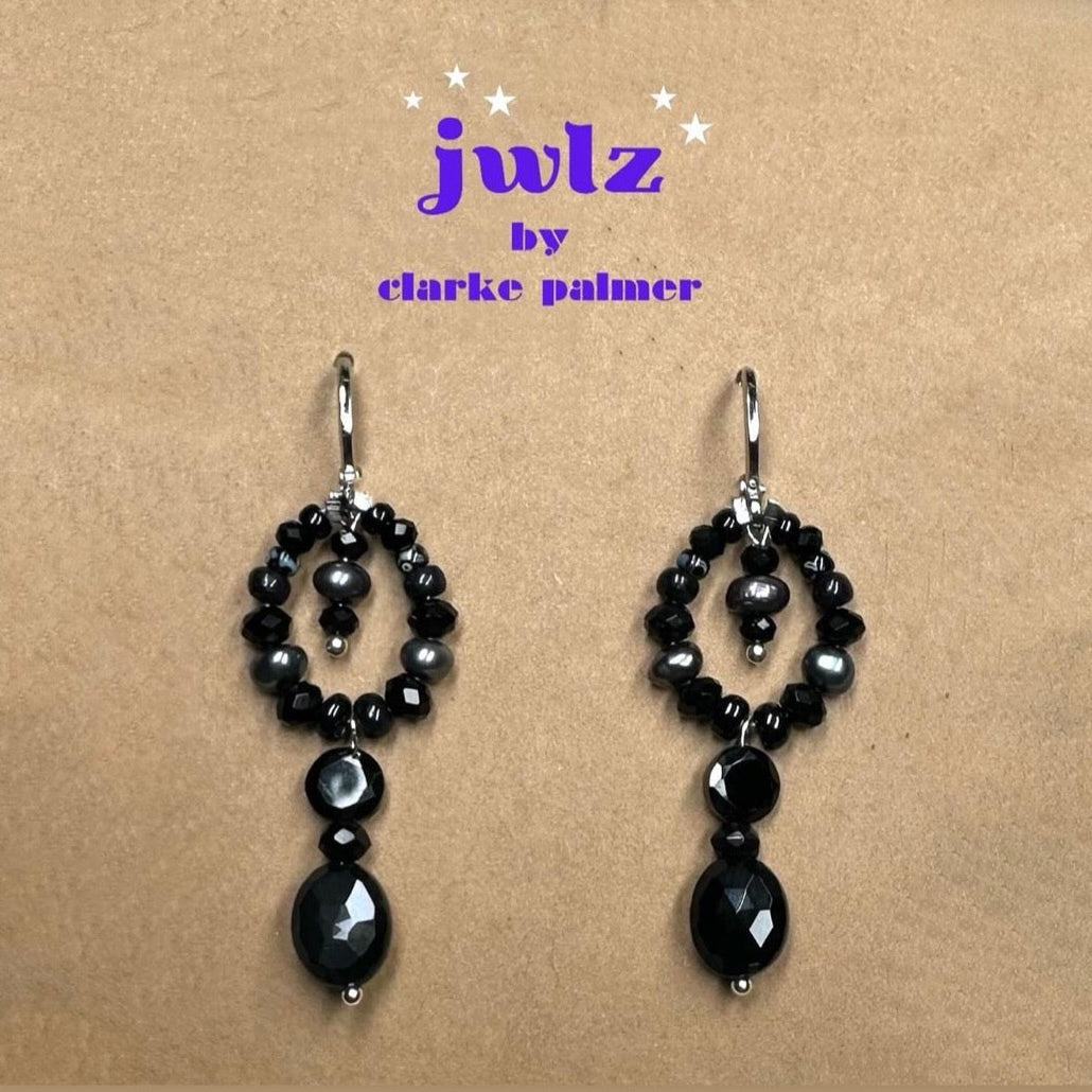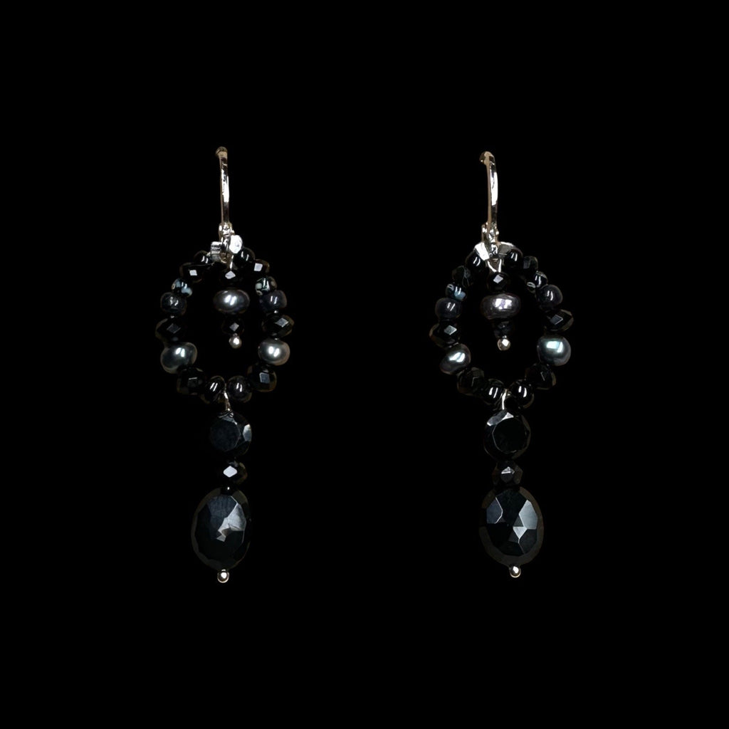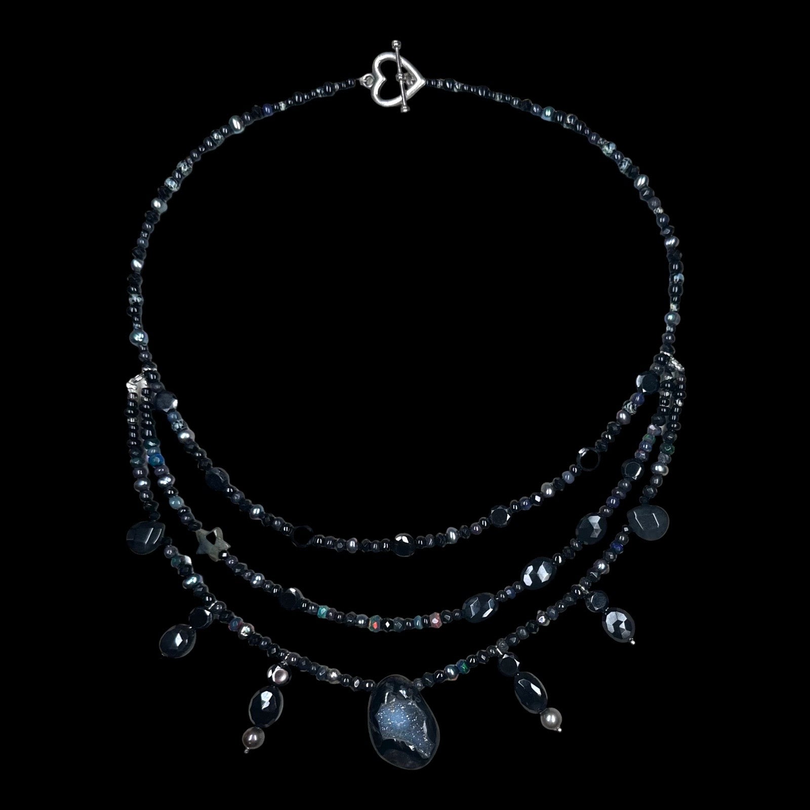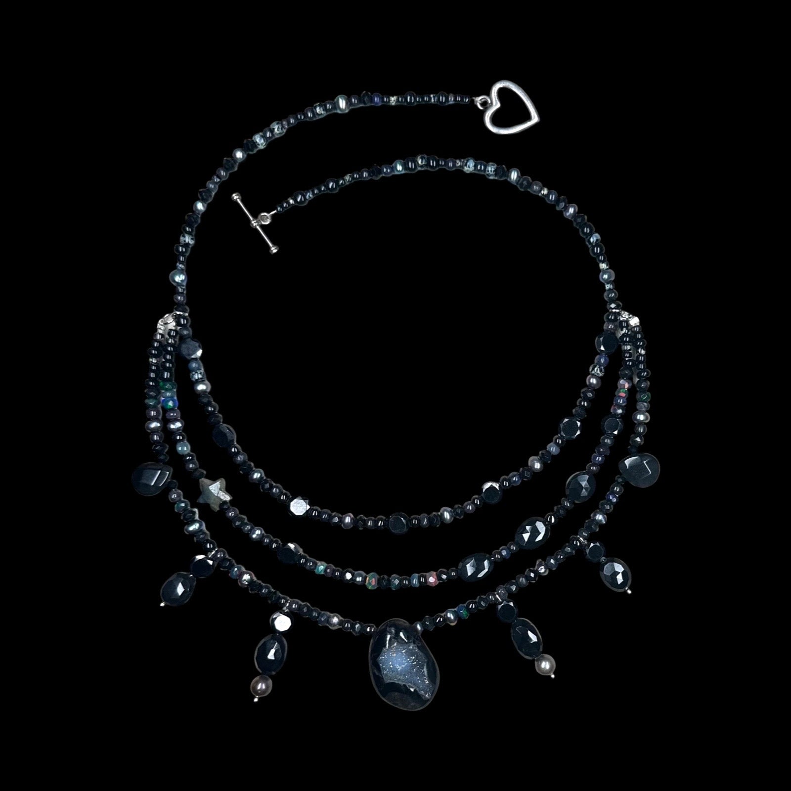 Our Tish Everything Necklace is inspired by Tish Addams the legendary Mother of Wednesday and Pugsley. Handmade in spinel, onyx, opal sustainably sourced hand cut rondelles and tiny black pearls.