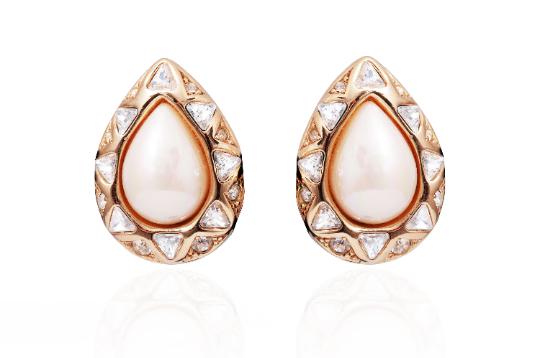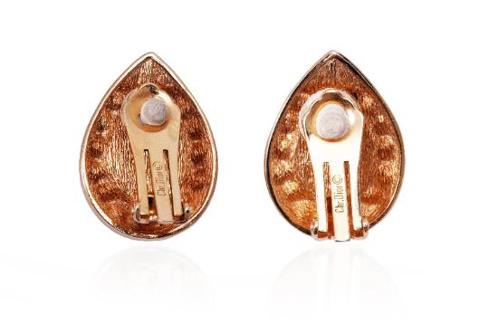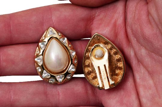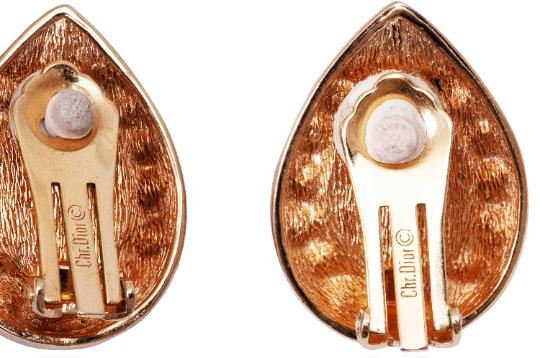Vintage 1980s or 1990s Christian Dior gold-plated clip-on earrings set with a lustrous iridescent teardrop shaped pearl as the centre price. The pearl is then surrounded with both trillion cut and smaller brilliant cut crystal diamantes. The earrings are fully marked on the clip section Chr. Dior and the copyright symbol.