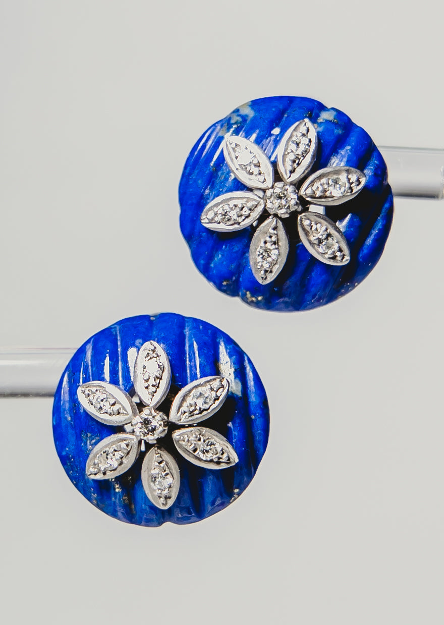Make a statement with our stunning carved Blue Lapis and Diamond Earrings. These beauties shimmer with sparkles of diamond in a floral pattern set in 14K white gold - perfect for any chic outfit. Dazzling yet understated, you'll never lose your cool-factor in this gorgeous pair!