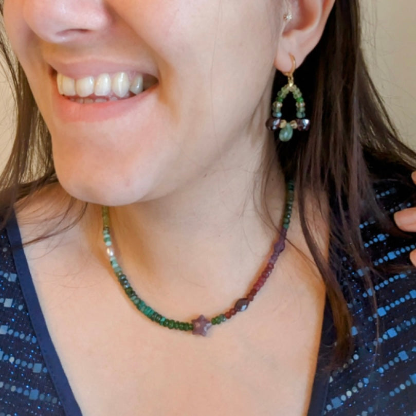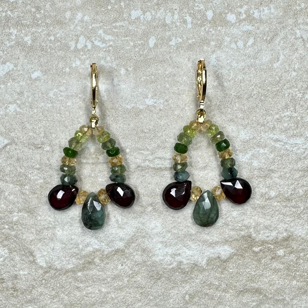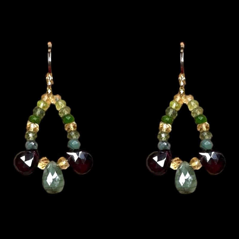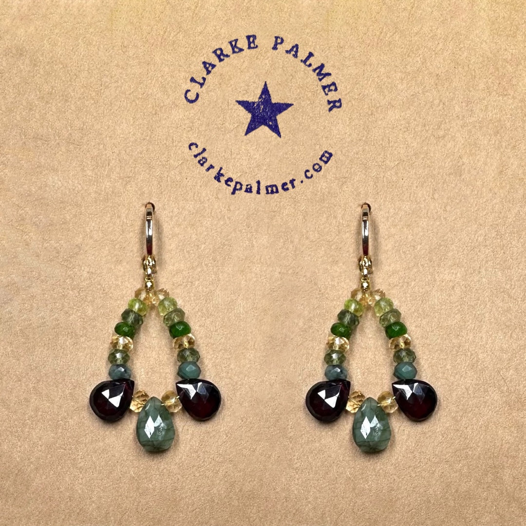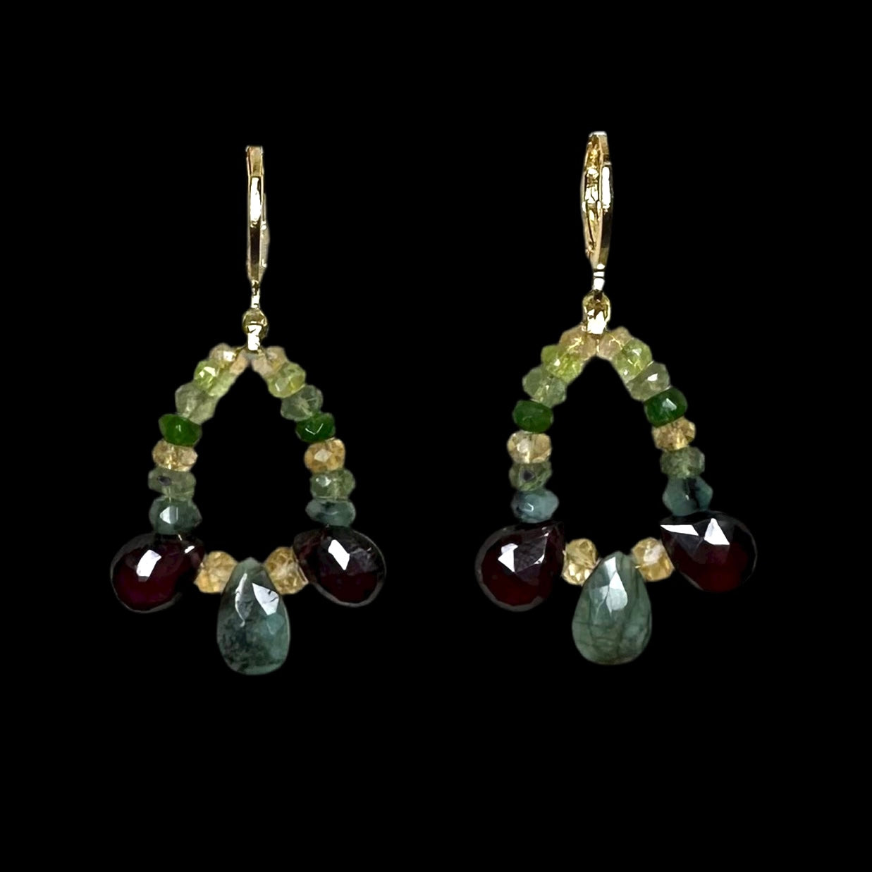 Part of our Precious Elements Collection, the 'Eden' drop earrings are handmade from garnet, emerald, citrine, green apatite and peridot rondelles, with garnet and emerald faceted briolette teardrops.