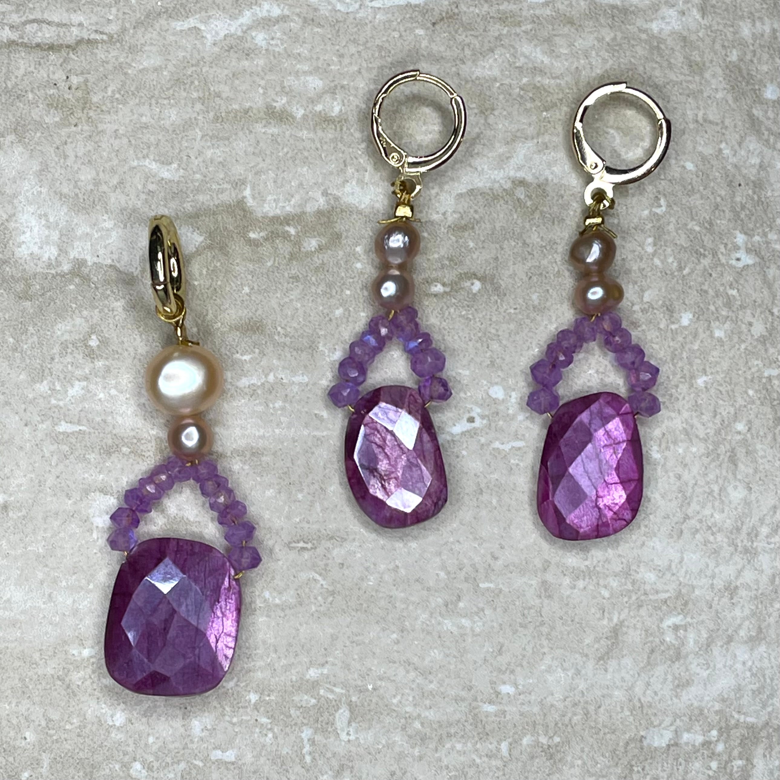 Part of our Precious Elements Collection, these 'Peony' earrings are handmade from hand cut faceted precious metal coated ruby moonstone focal drops, moonstone rondelles and creamy pink pearls.