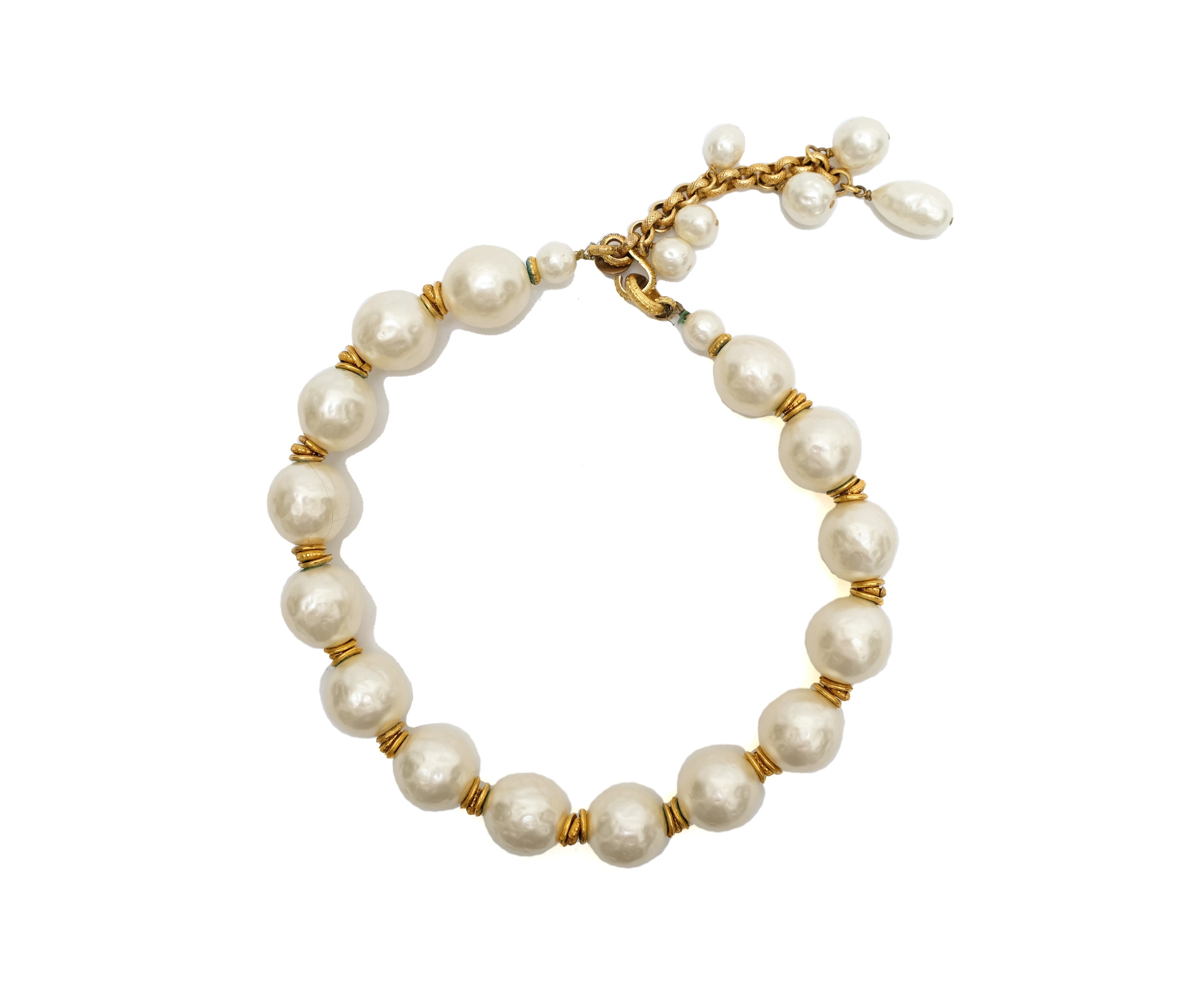 The necklace is made of large false pearls joined by little gold loops, and features a gold chain and dangling set of pearls at the clasp at the back.