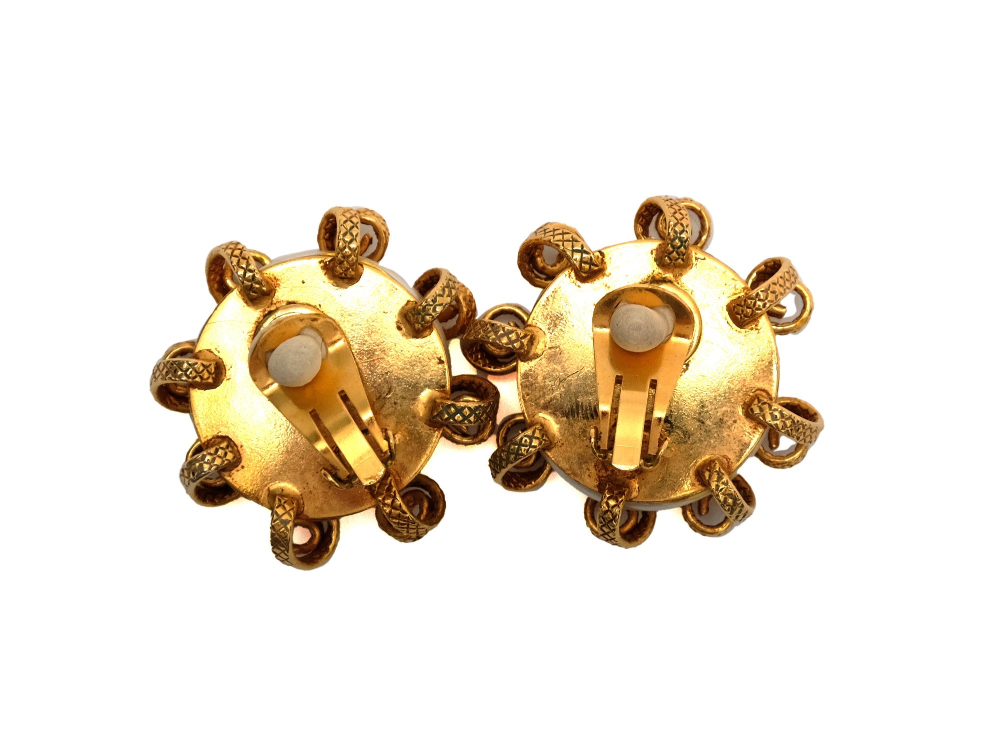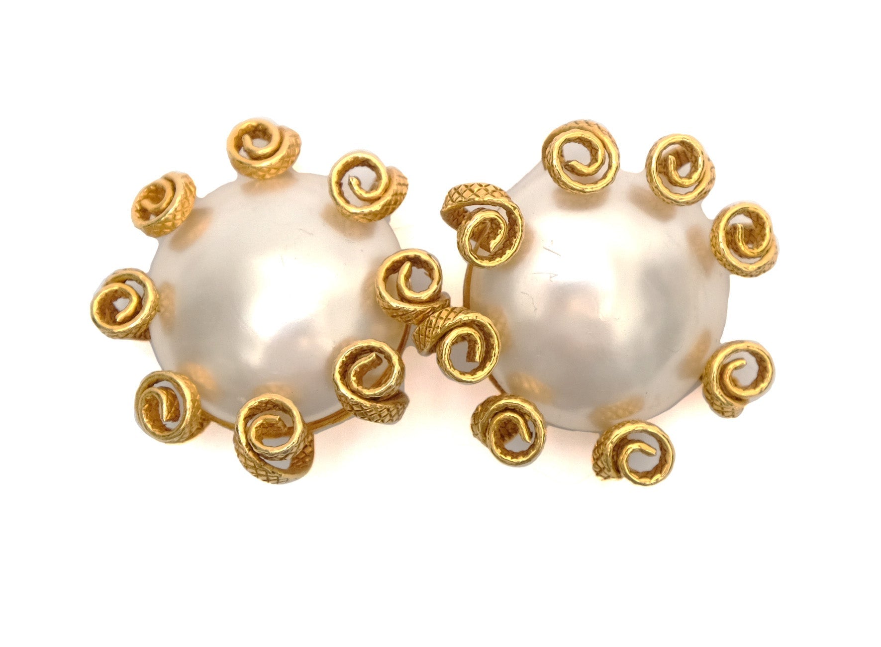 The matching clip-on earrings feature a large pearl in a clasp of little gold tone spirals.